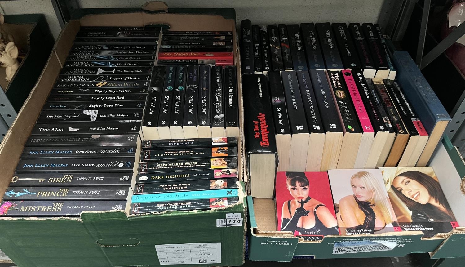 2 Boxes containing erotic novels by Tiffany Reisz and Fifty Shades Of Grey etc