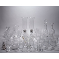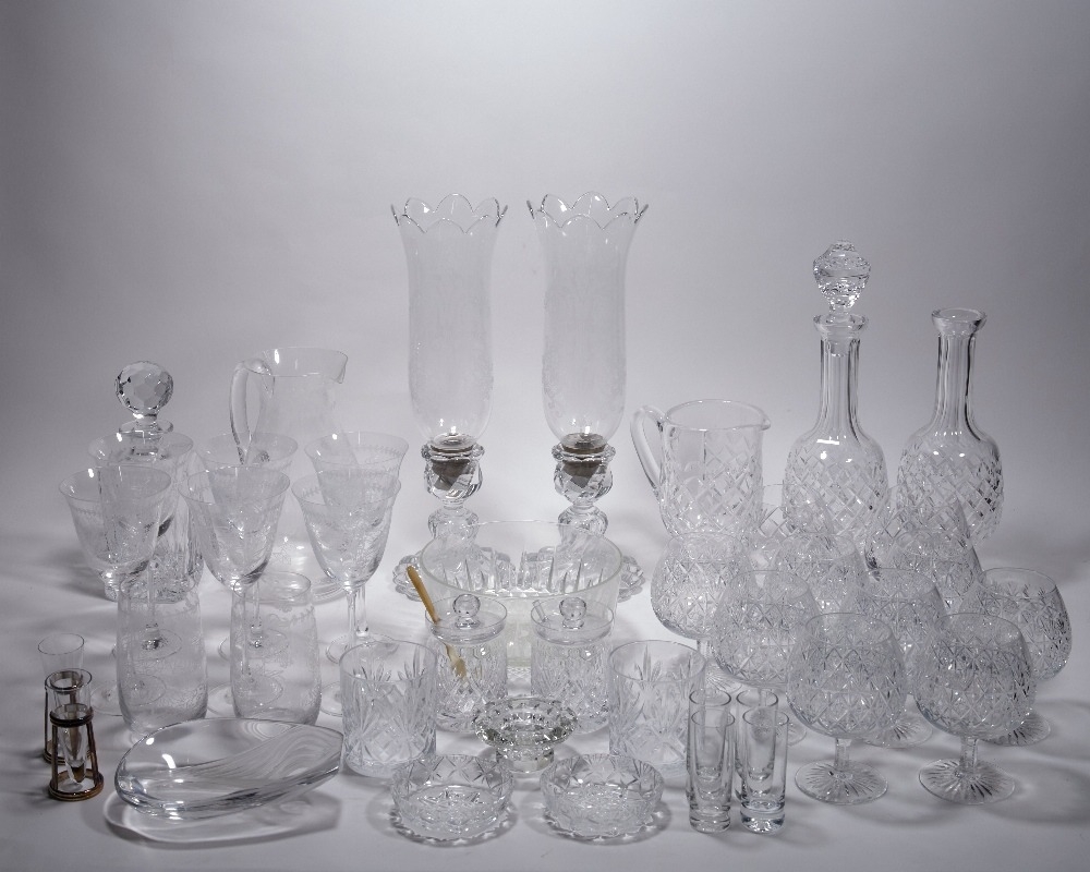 A quantity of modern cut and etched glass table wares, comprising: a pair of Baccarat crystal candlesticks with hurricane shades, acid-etched marks, the candlestick bases of wrythen form, the shades with etched decoration, 41.5cm high; a Lalique clear and frosted glass 'Brasilia' candy dish, etched mark to underside, 18.3cm long; a cut-glass rectangular commemorative decanter with stopper, 25cm high; nine Thomas Webb brandy glasses, etched marks, 13.8cm high; two Tudor brandy glasses, etched marks, 14.5cm high; a group of Portmerion glass to include six goblets, 21cm high; three highballs, 14.4cm high; and a water jug, 25cm high; and various other examples (lot)
