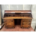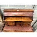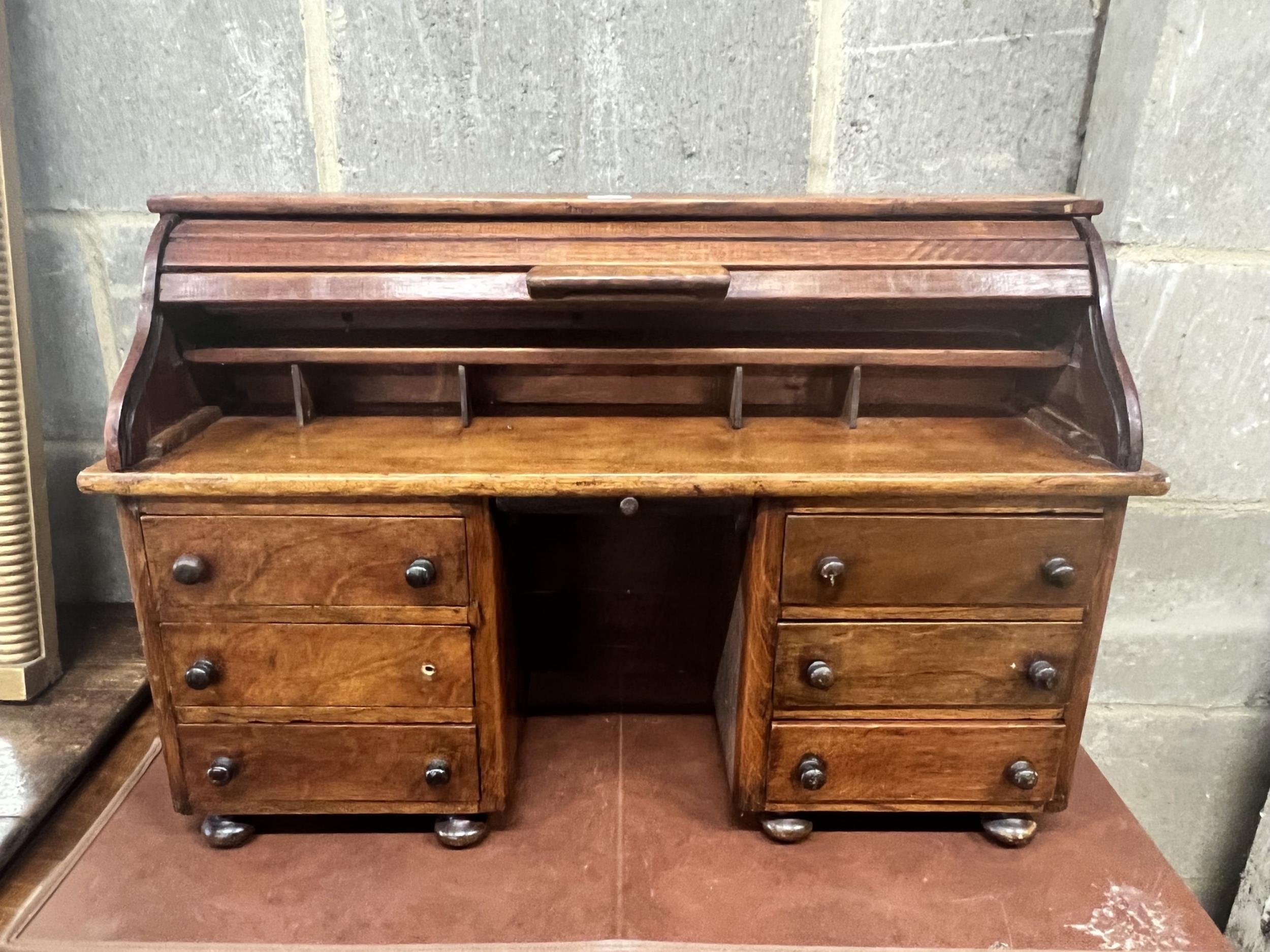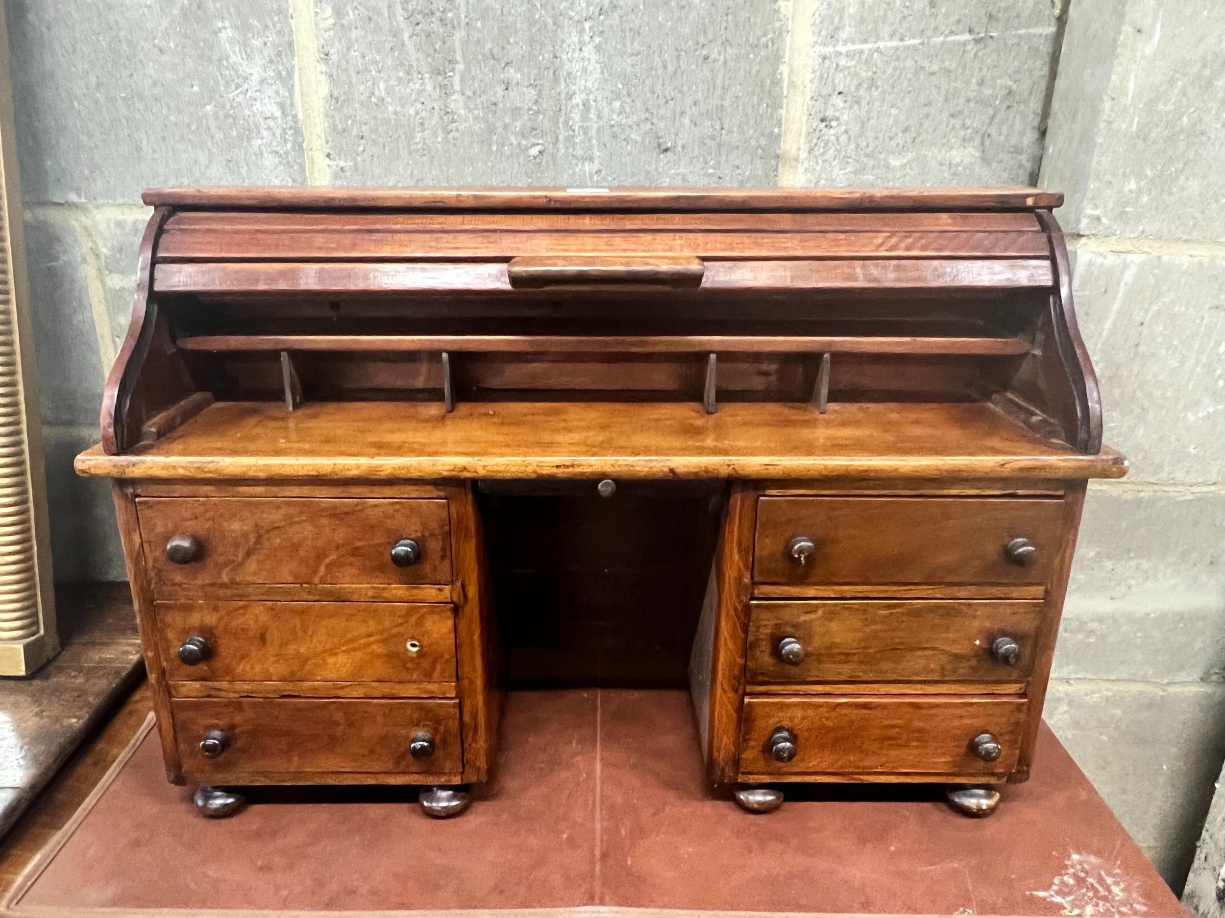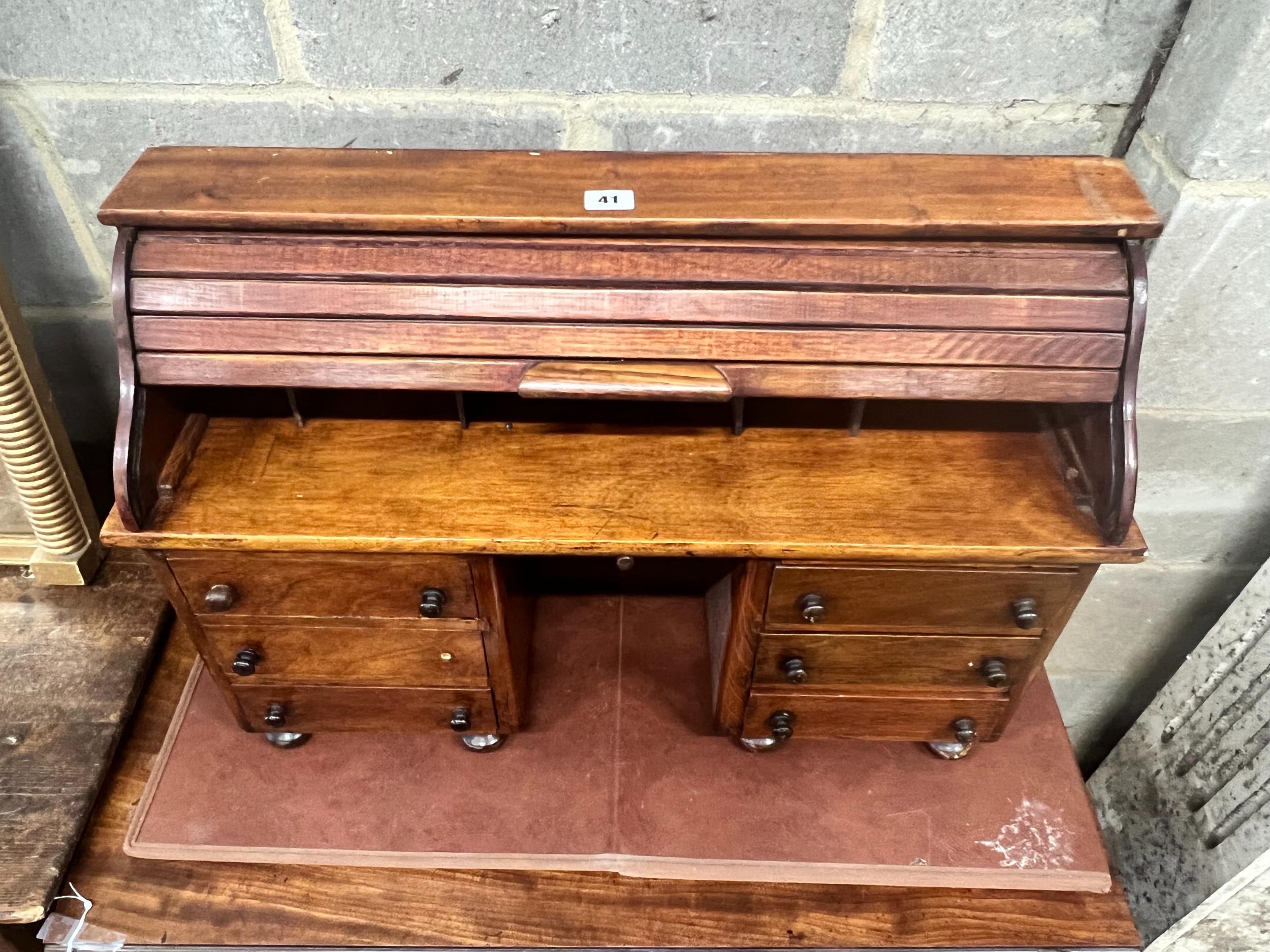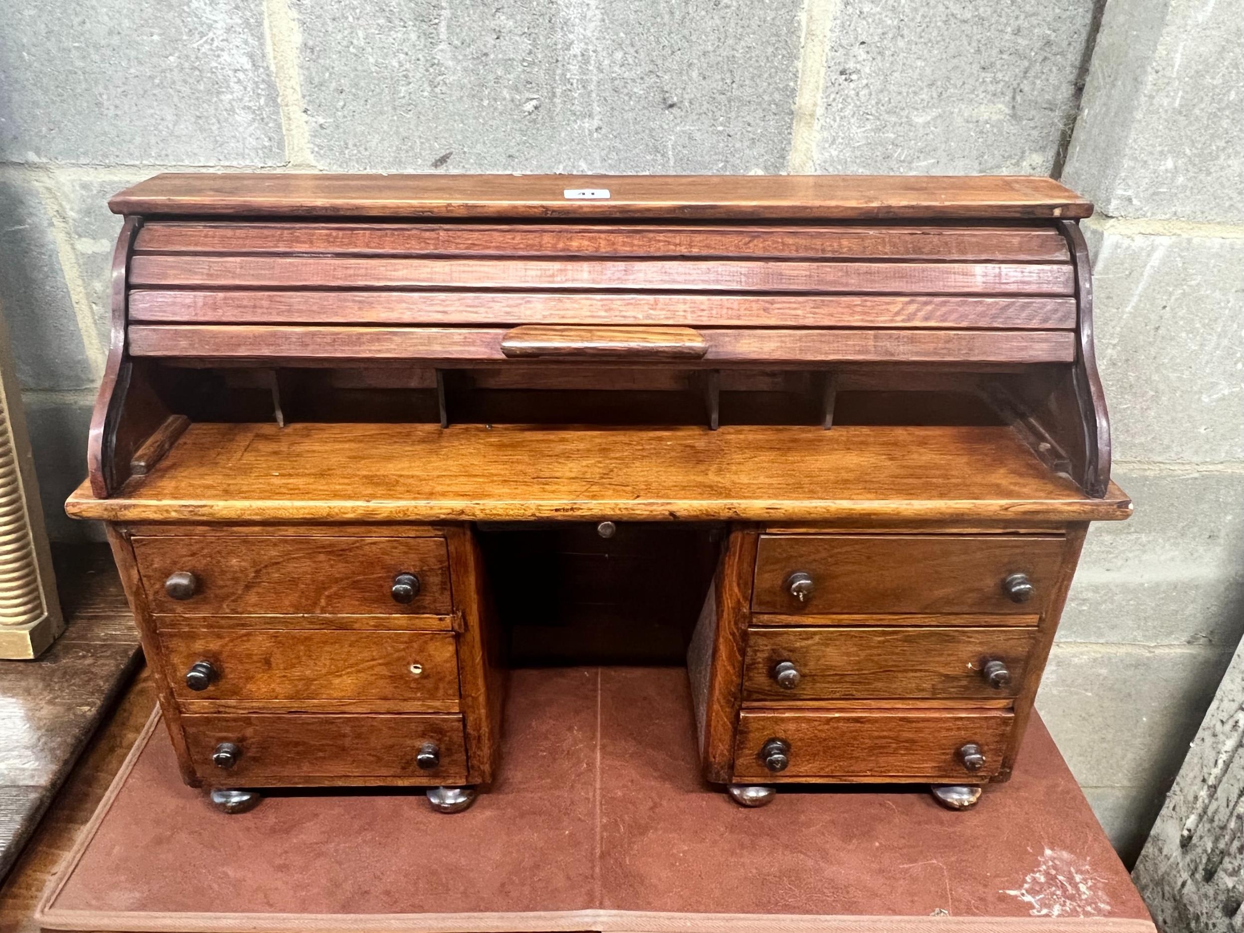 A miniature mahogany and hardwood kneehole tambour desk, width 69cm, depth 22cm, height 45cm.