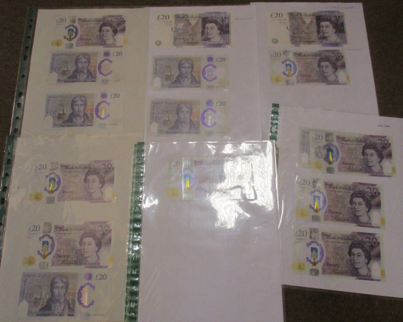 Collection of £20 Smith and Turner banknotes in plastic leaves, generally extremely fine to uncirculated, majority Sarah John. Qty 16 (R)