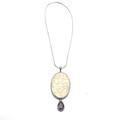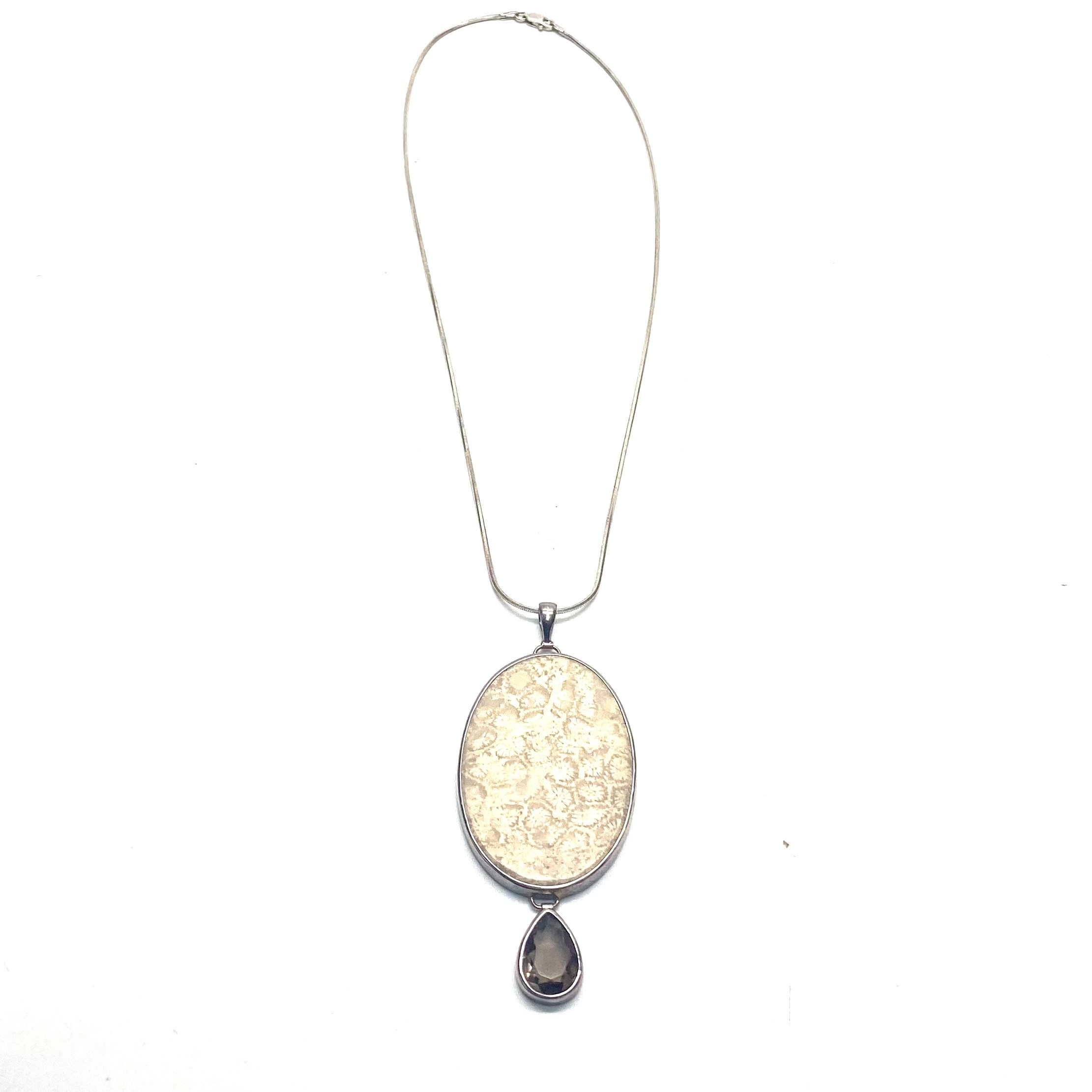 Handmade large polished coral pendant with a silver mount and smoky quartz drop pendant, accompanied by an Italian silver chain.