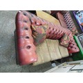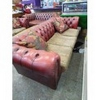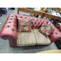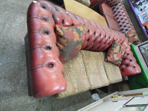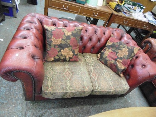 VINTAGE OX-BLOOD LEATHER CHSTERFIELD STYLE SOFA WITH LOW BUTTON BACK, & BRASS STUD DETAIL. 2 SEATER WITH TAPESTRY SEAT CUSHIONS, ALSO 2 SCATTER CUSHIONS.