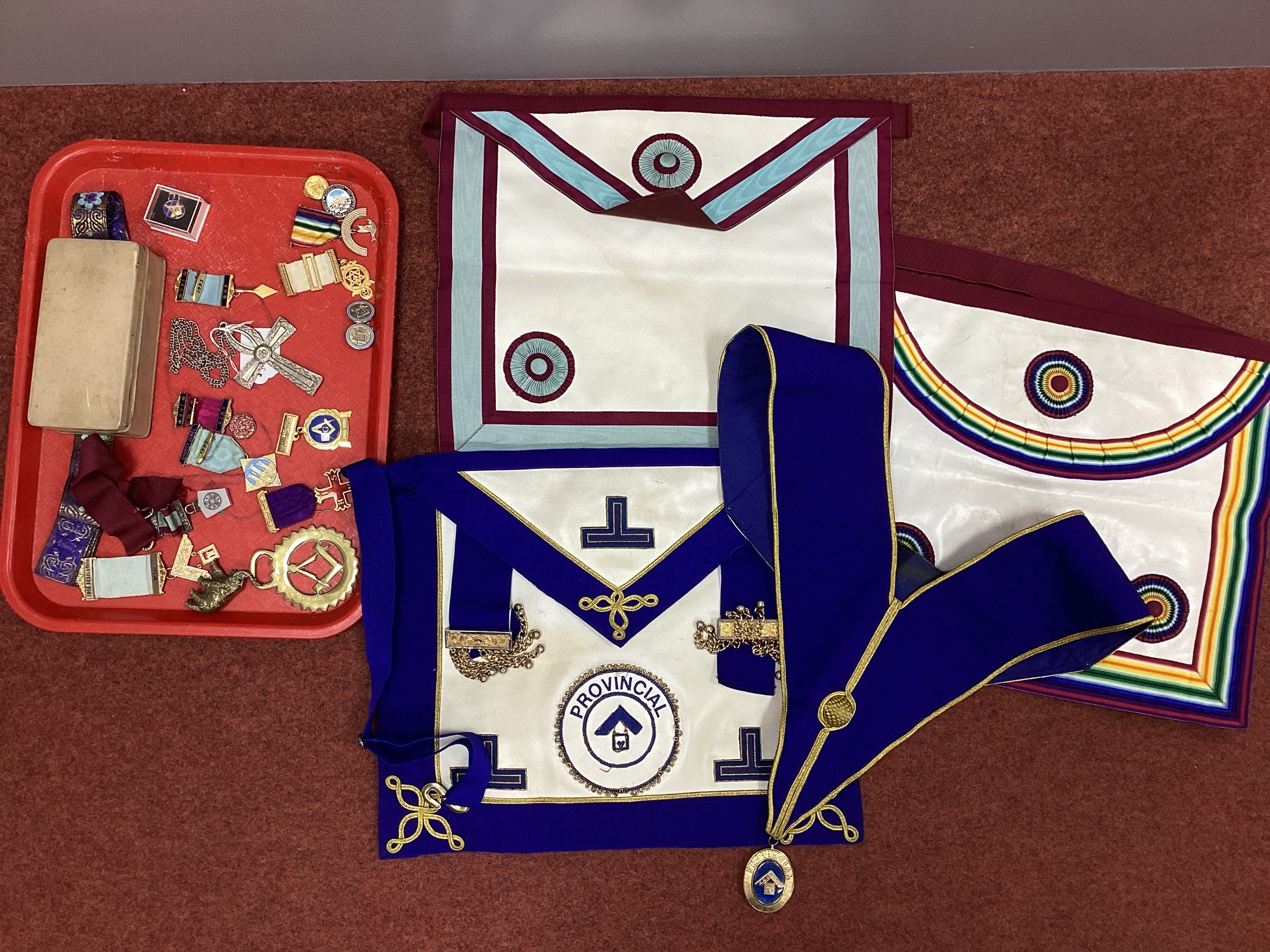 Masonic Interest - Assorted Gilt Metal Jewels, including Lodge Resolution No.247, Charity Jewel 1993, 247 Resolution 1969-1990, etc; Lodge Resolution No 247 Founder badge, Red Cross of Constantine; aprons and sash.