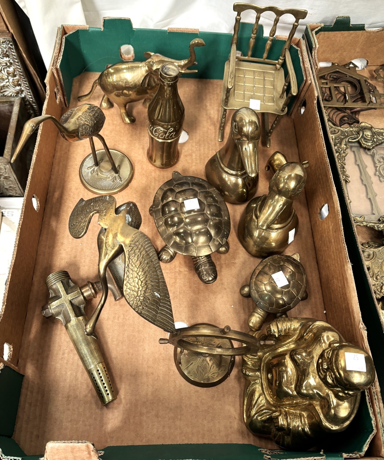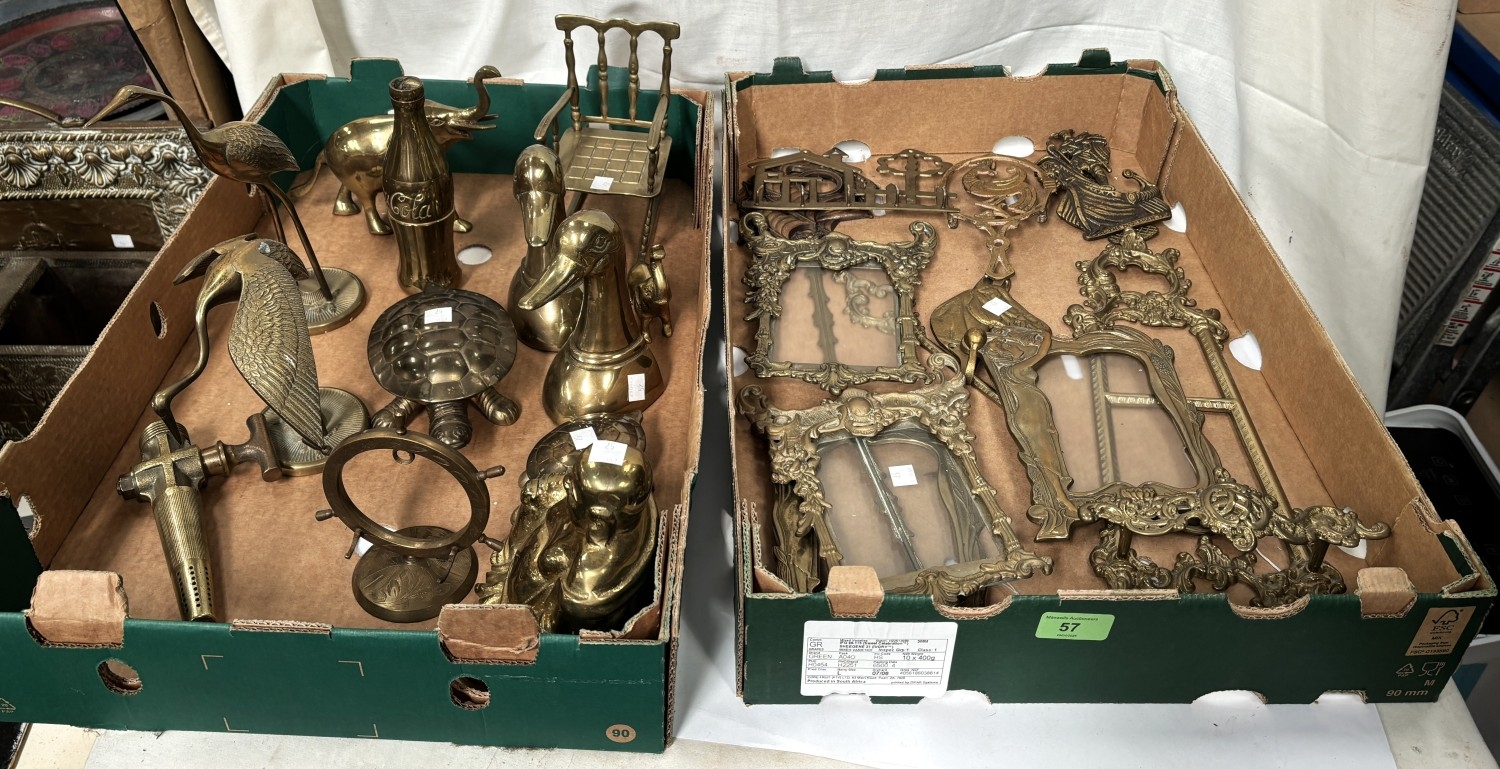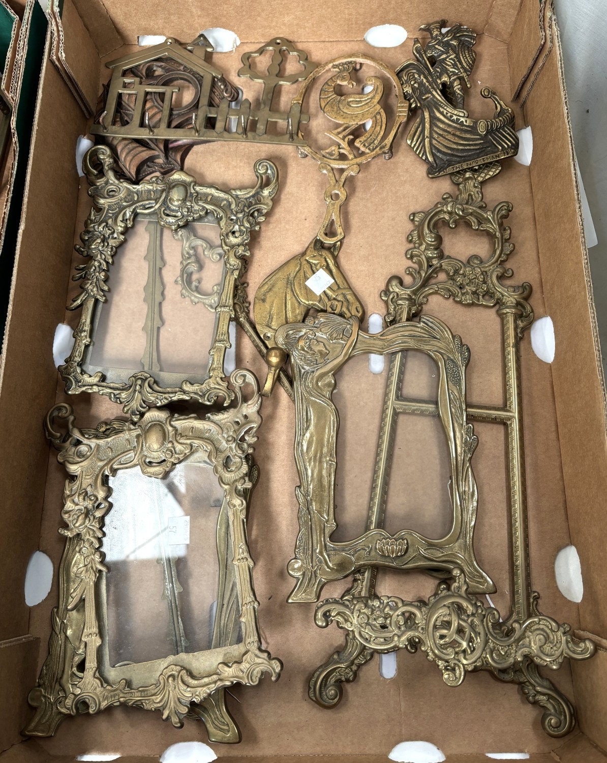 A selection of ornated brass photo frames and other decorative brassware inc. Buddha figure and other Eastern artifacts etc.