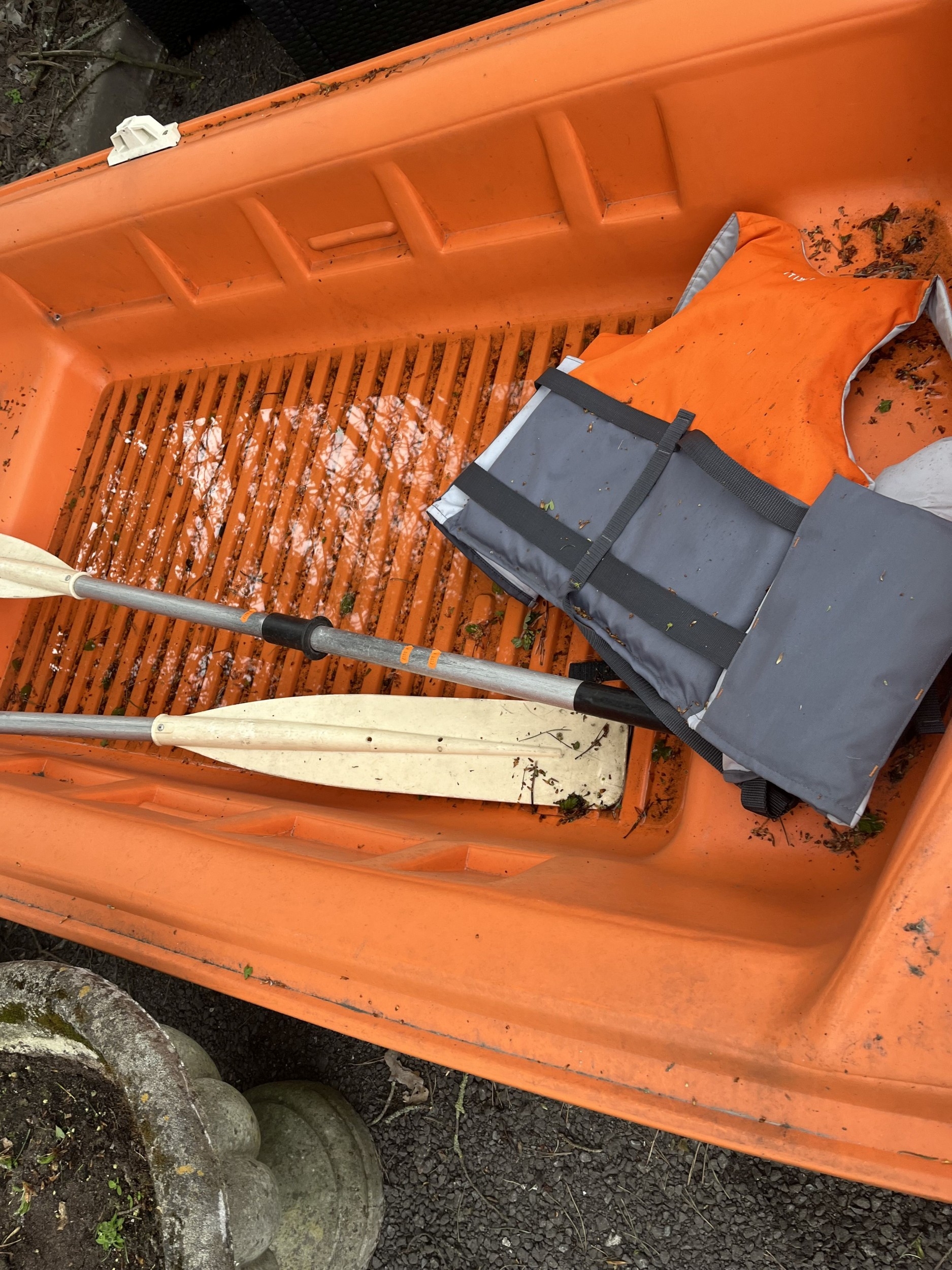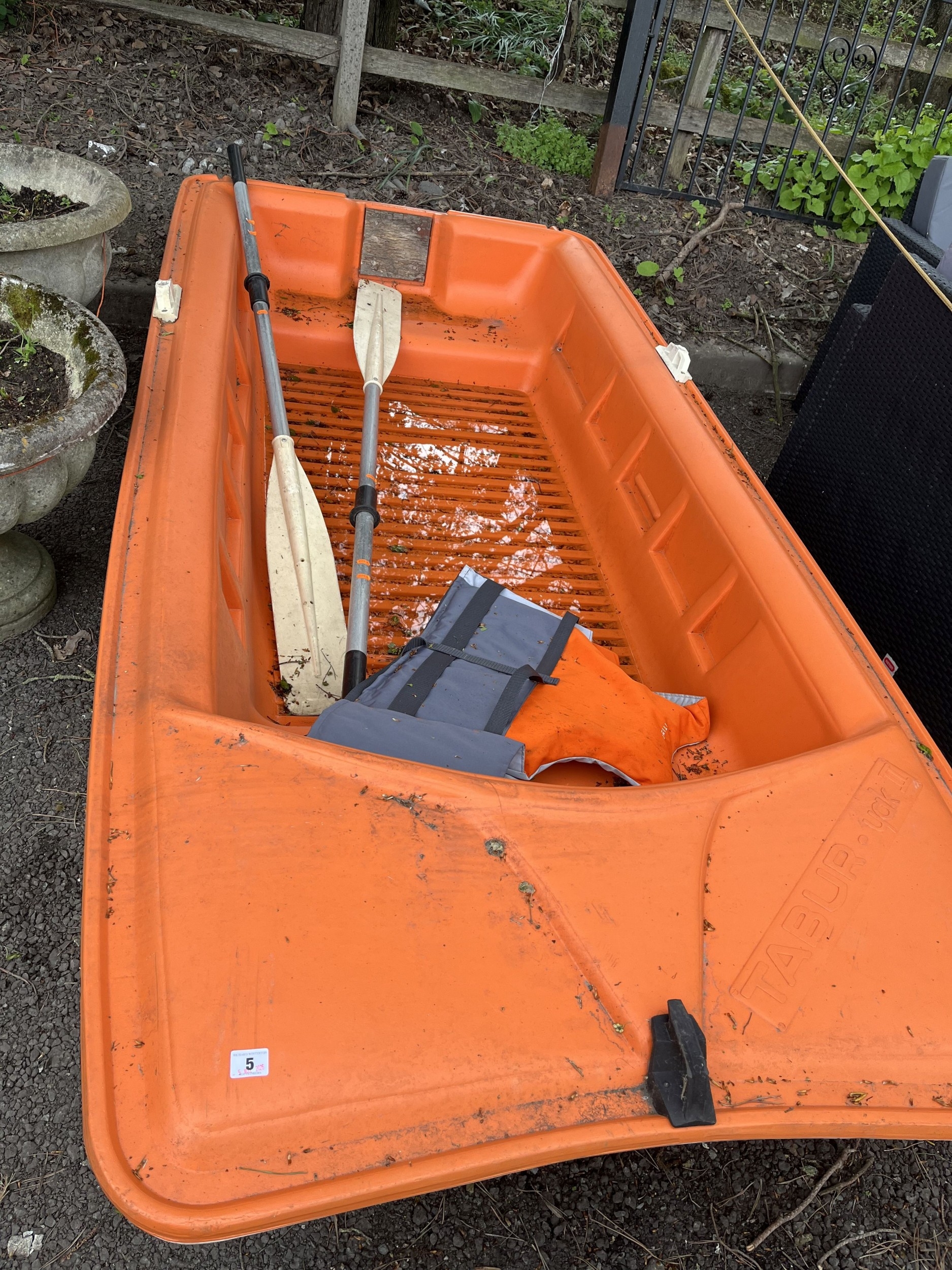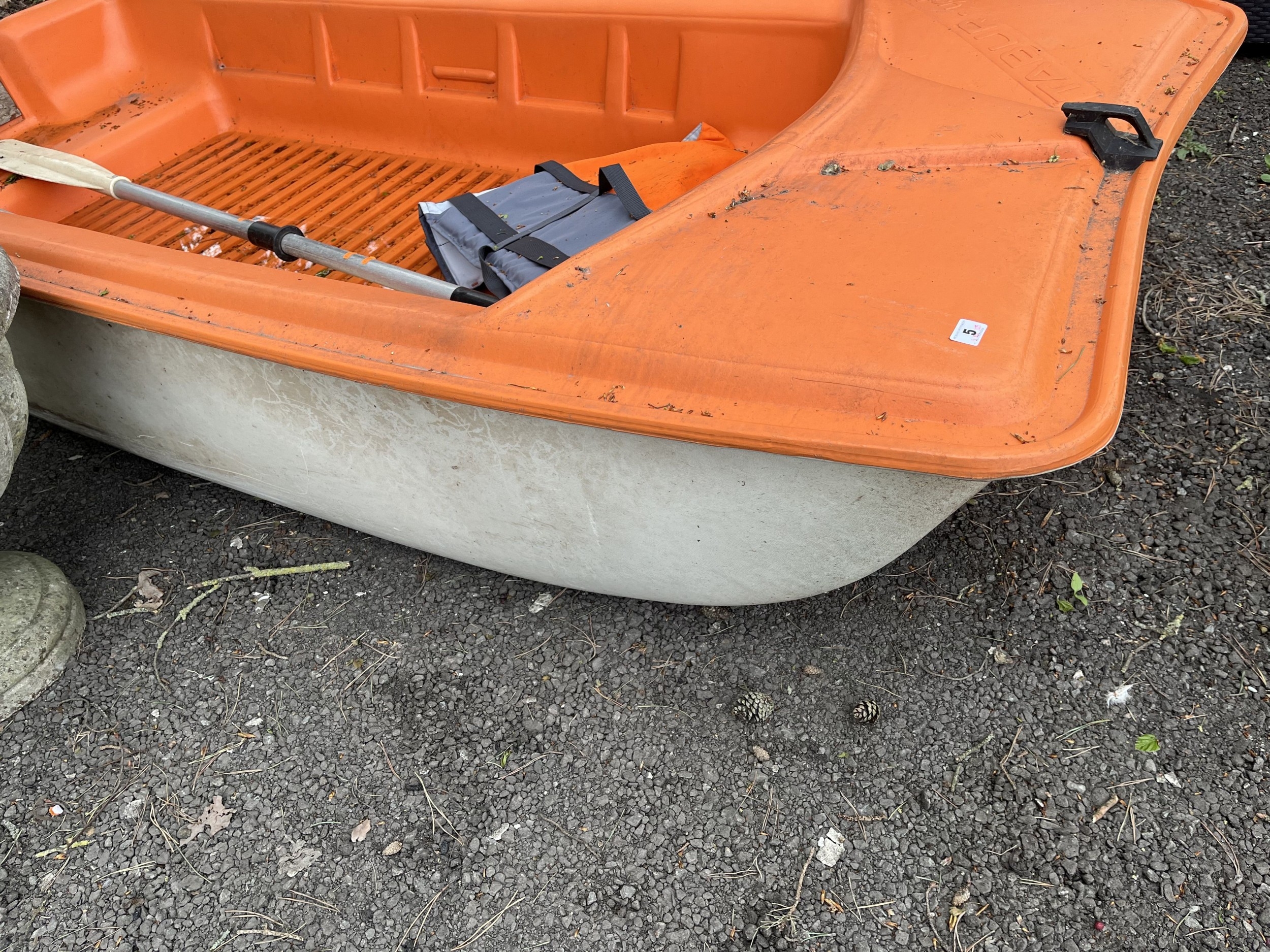A TABUR YAK II PLASTIC FISHING BOAT with two oars and a life jacket, boat length 250cm