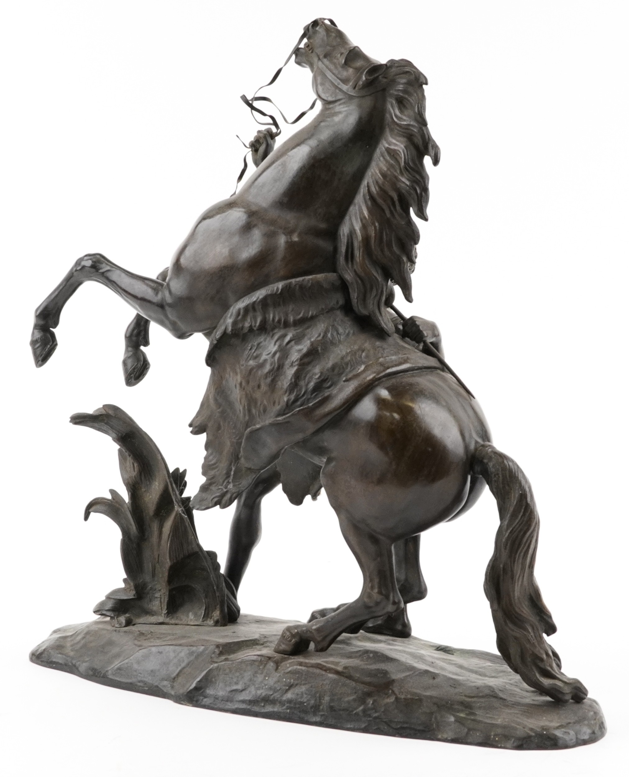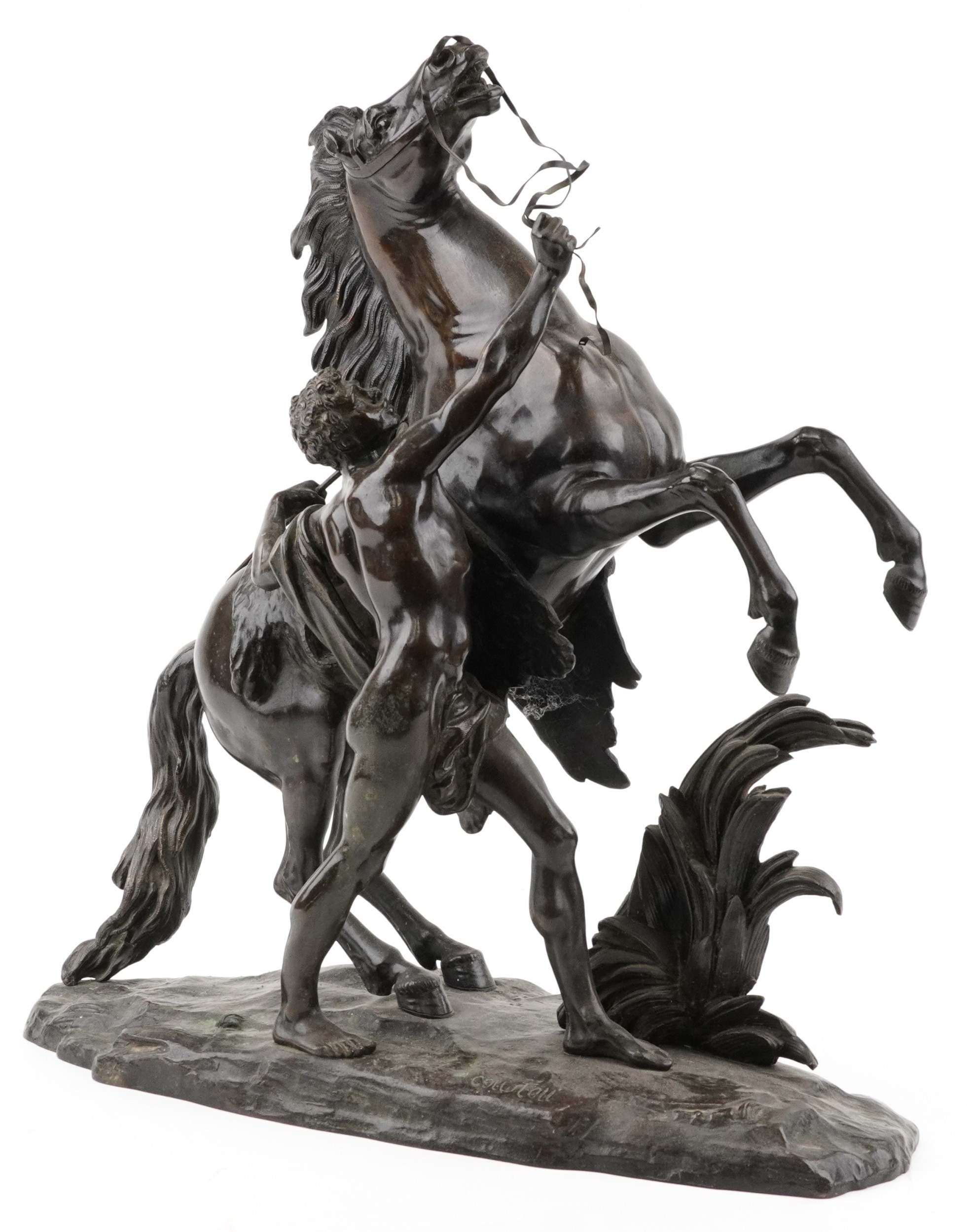 After Guillaume Coustou (1677-1746) - A large brown patinated bronze 'Marly Horse and Groom', signed, 58cm high x 50cm wide.
