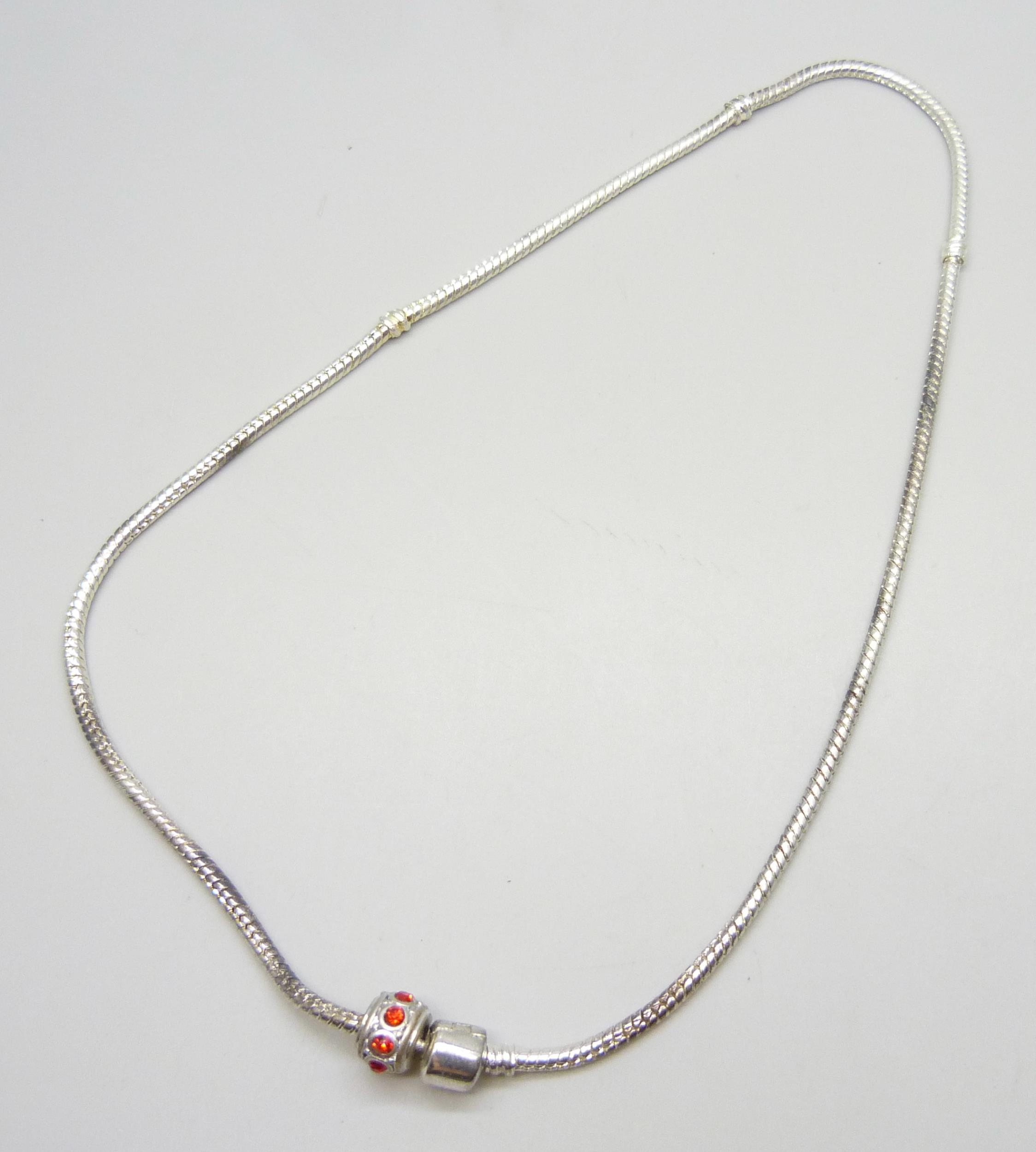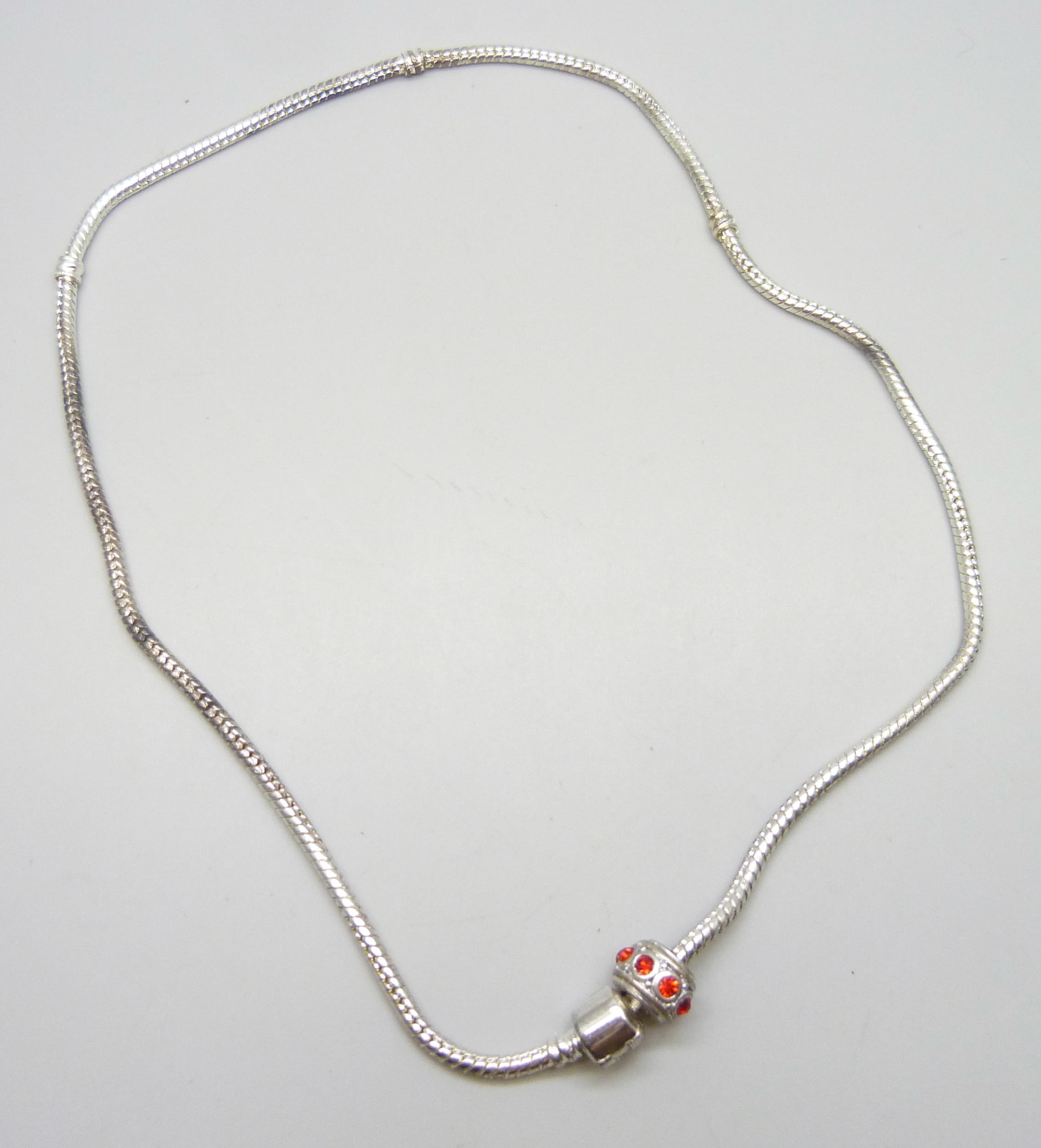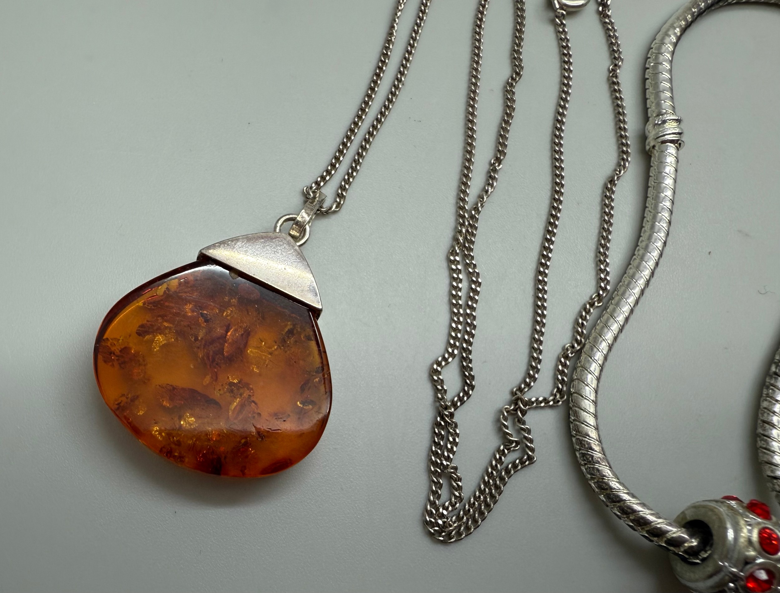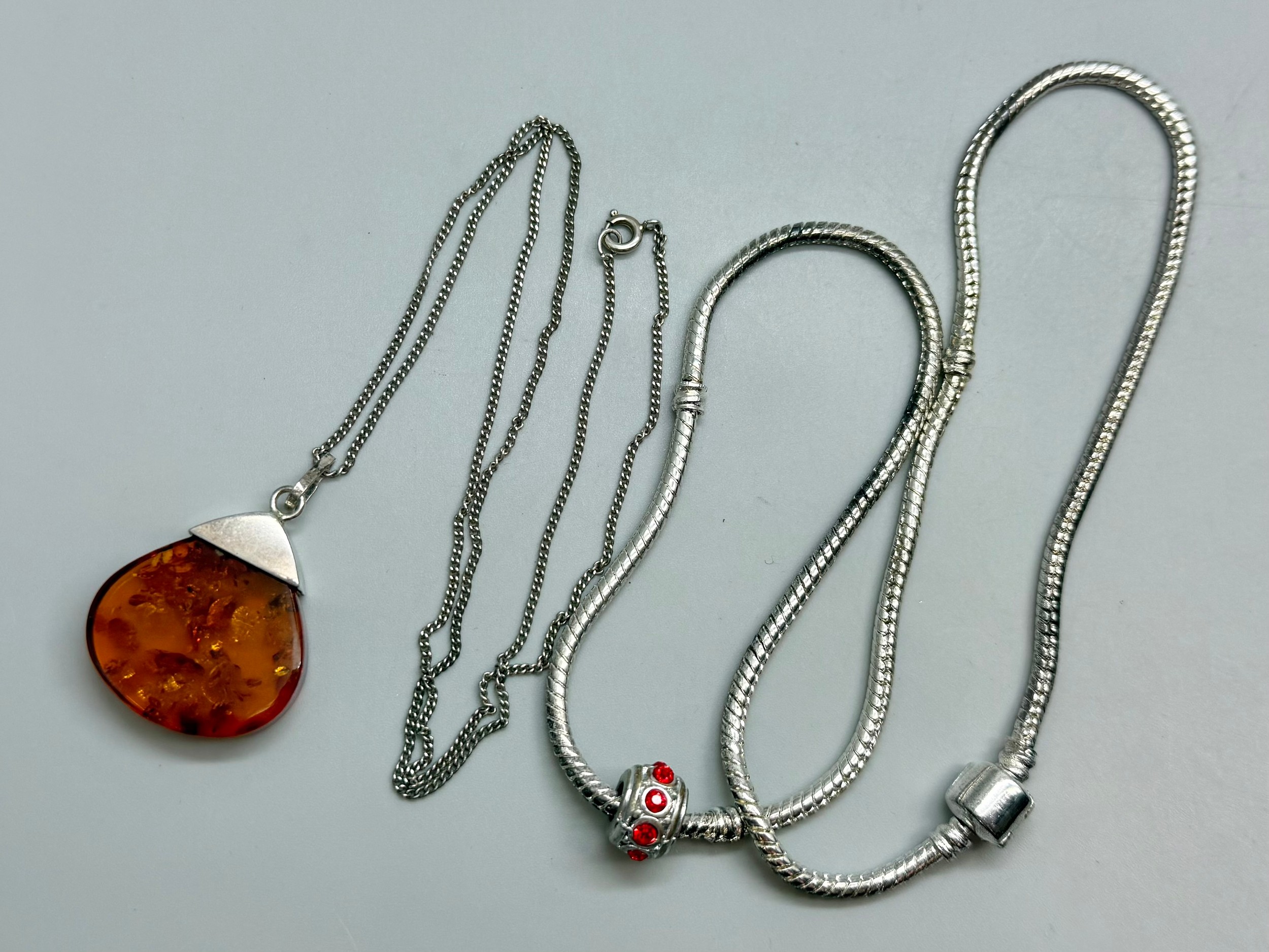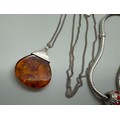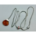 Two silver necklaces including an amber pendant on a silver chain, 35g