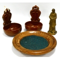 A Circular Wooden Collection Dish, with green felt liner, 22cm diameter, a pair of brown glazed pottery Holy Water fonts, each moulded with a cross, 14cm high and a gilt metal figure of a priest, inscribed 'Cure d' Ars', 16cm high. (4)