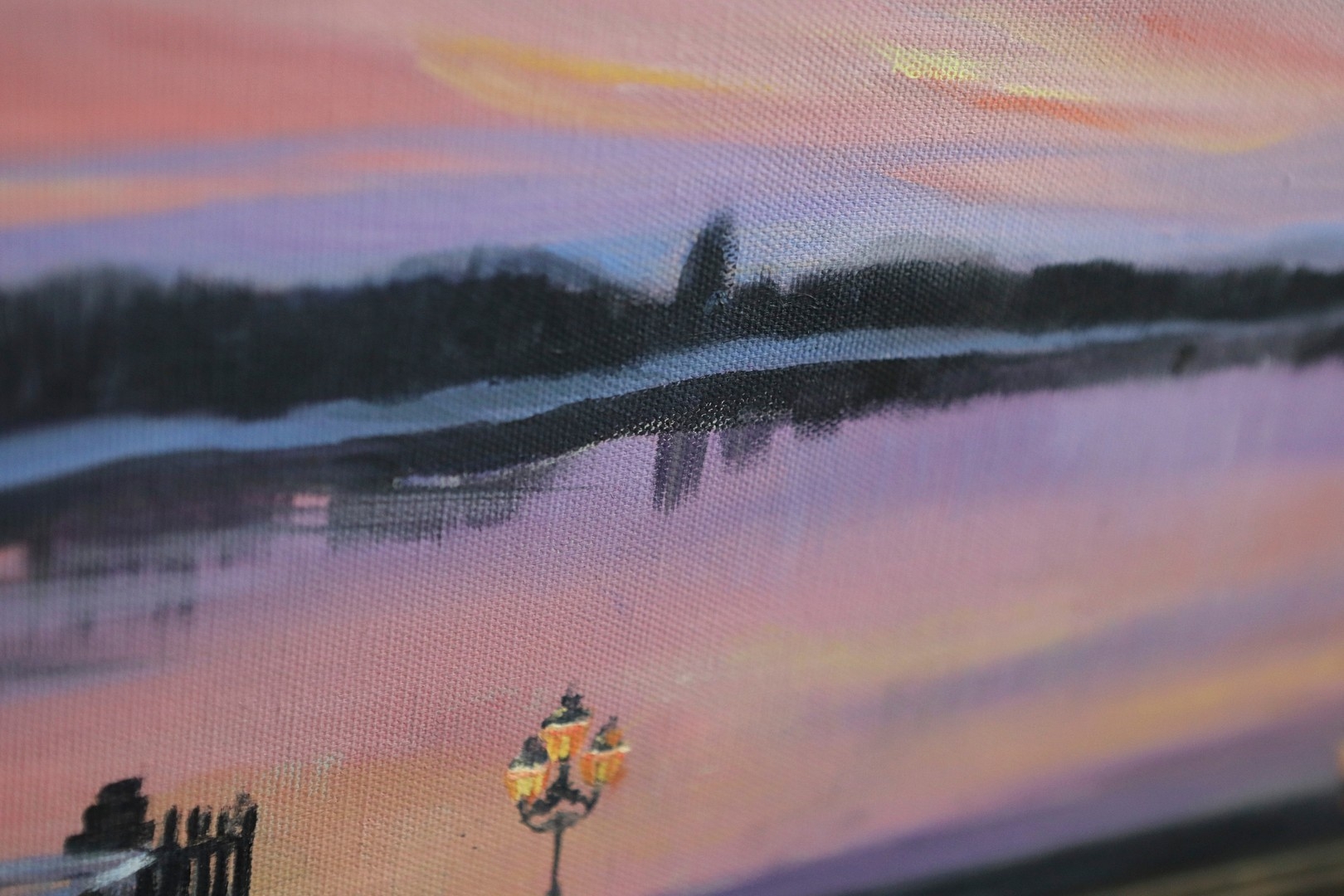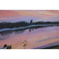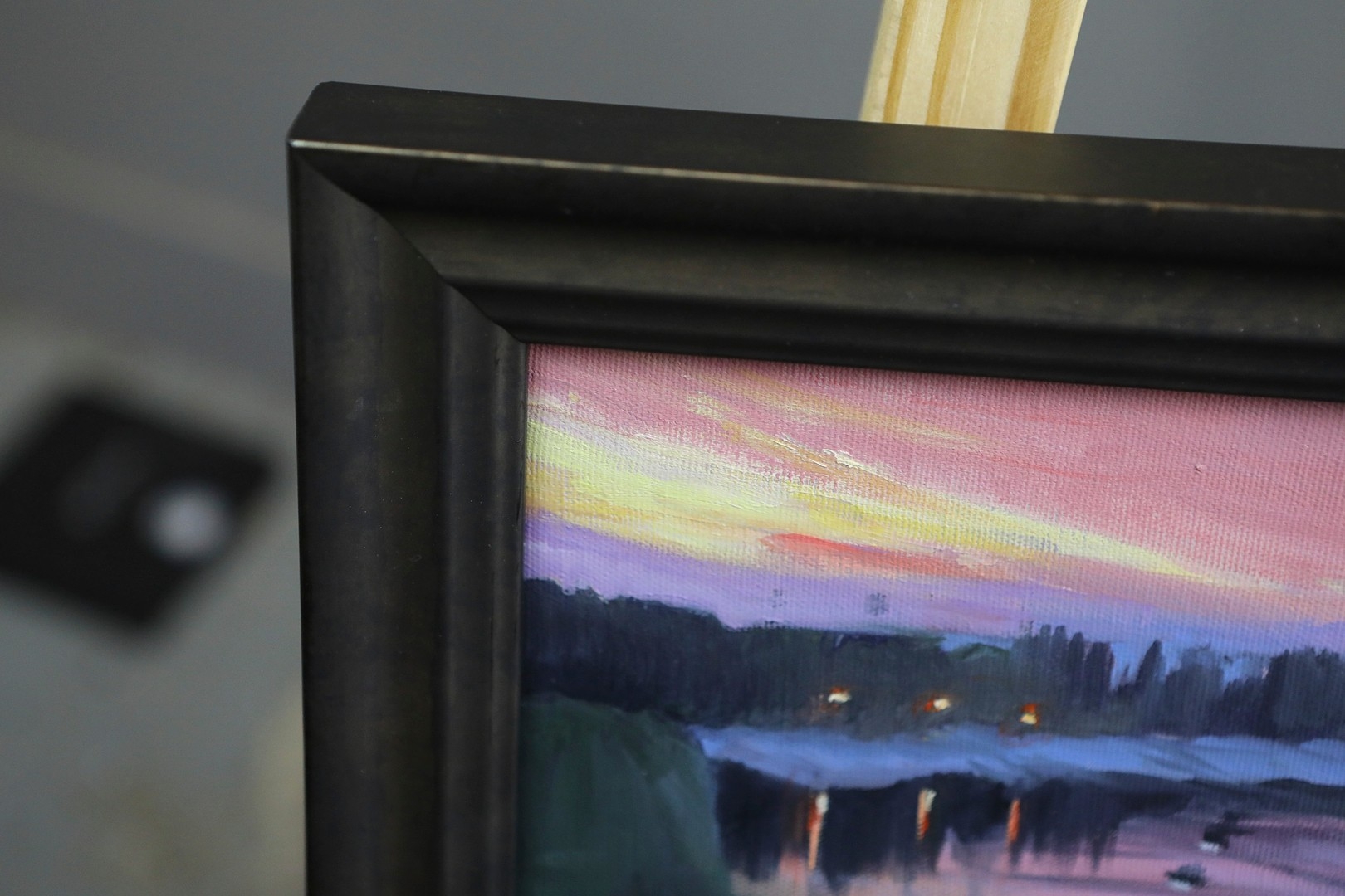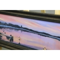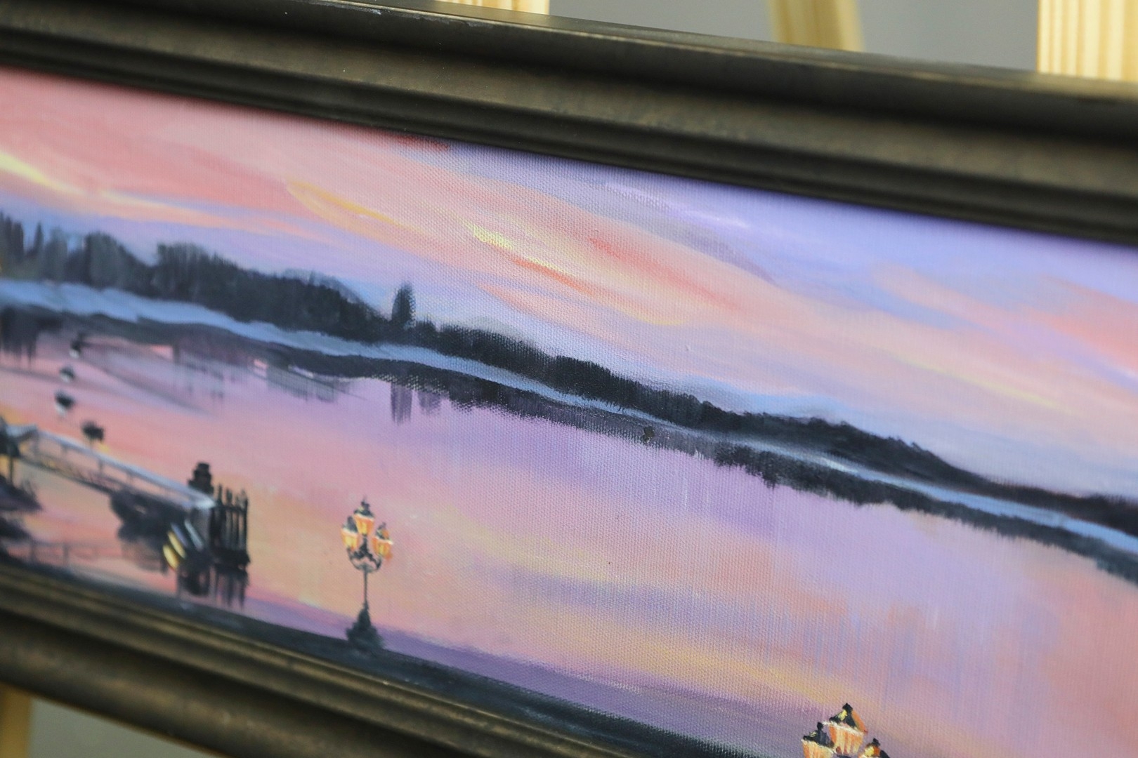 20TH CENTURY SCHOOL. LAKE VIEW. oil on canvas, 27cm x 67cm, framed.