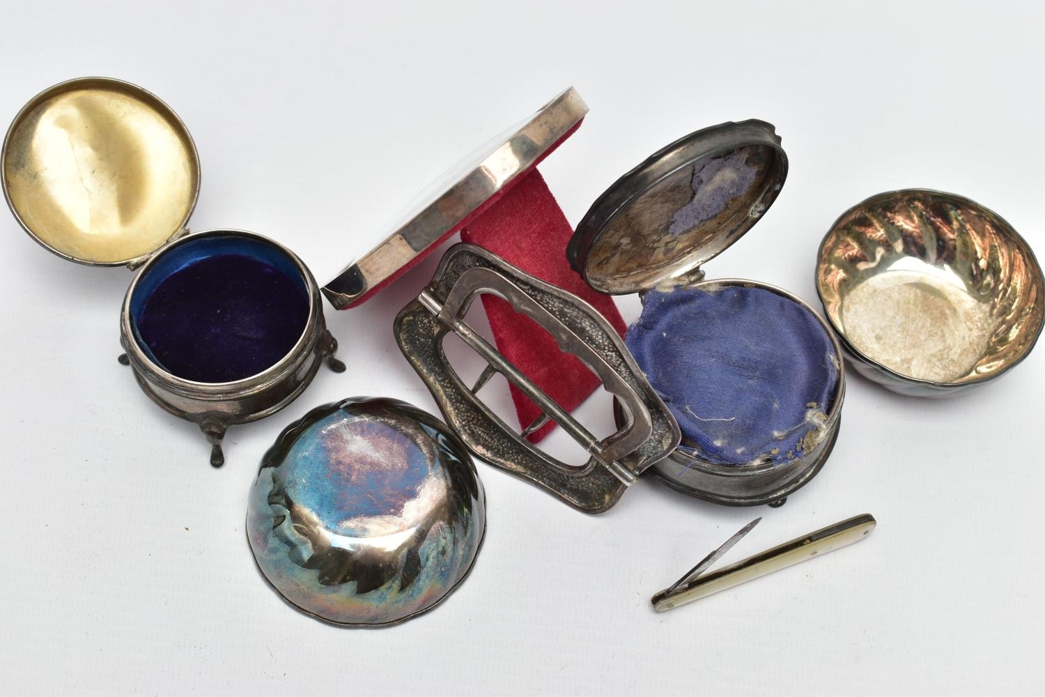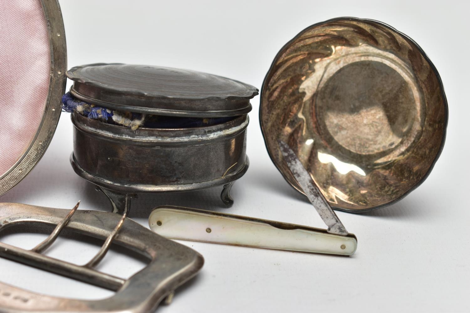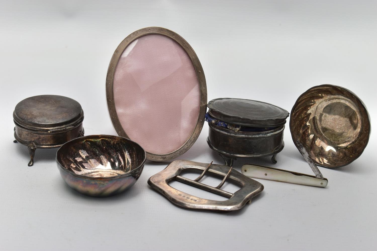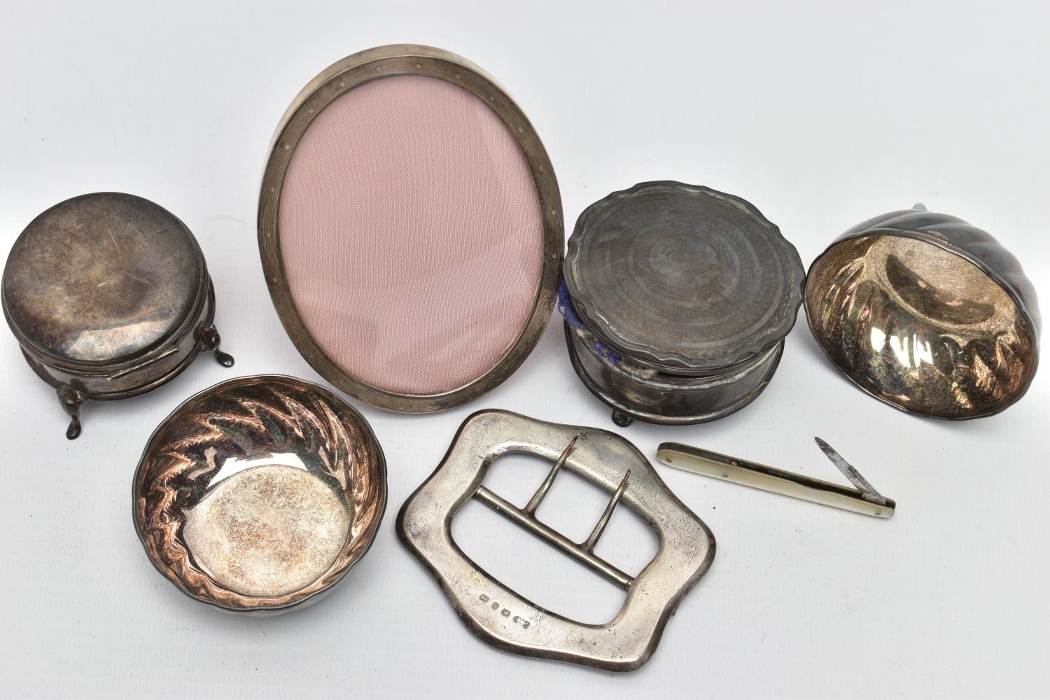 A SMALL PARCEL OF SILVER, comprising a late Victorian buckle, plain with a wavy outline, maker's mark partially rubbed, Birmingham 1895, 1.56ozt, 48.5 grams, a pair of modern Dutch white metal nut bowls, bearing import marks for .800 silver, 41.3 grams, diameter 6.4cm, an Elizabeth II easel back oval silver photograph frame, inner dimensions 9cm x 6.5cm, Birmingham 1971, two circular silver trinket boxes and a mother of pearl handled folding fruit knife with a steel blade (7) (Condition report: buckle and photo frame are both in good condition, both trinket boxes have dents, the larger one has a damaged interior, the pair of nut bowls are in fair condition with slight misshaping around the rim of one)