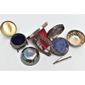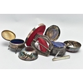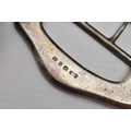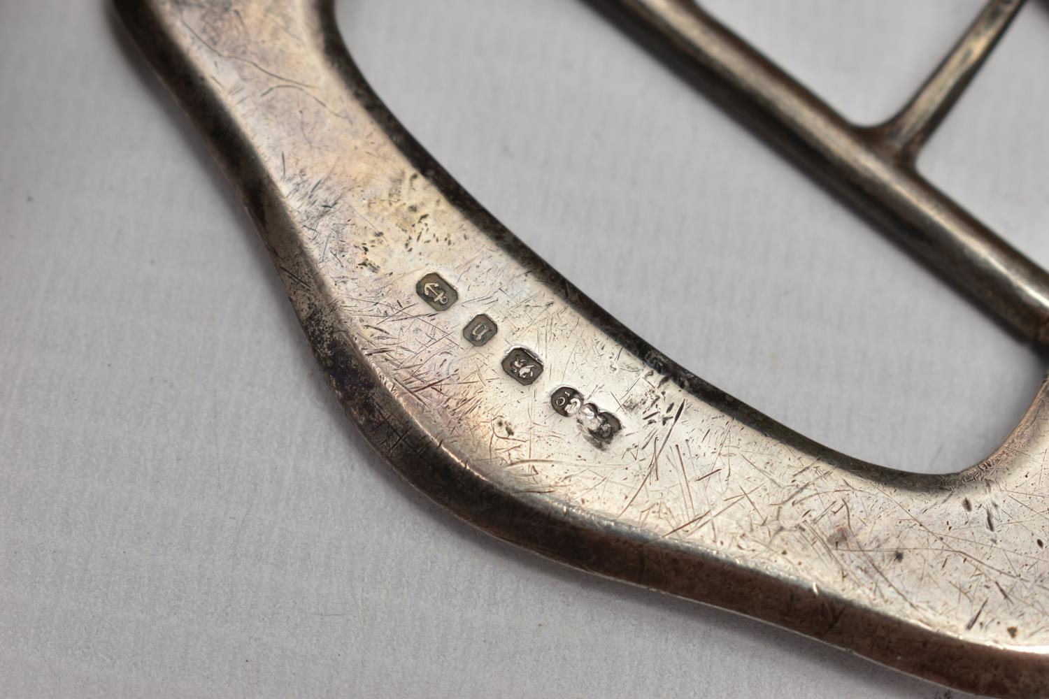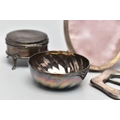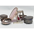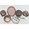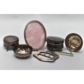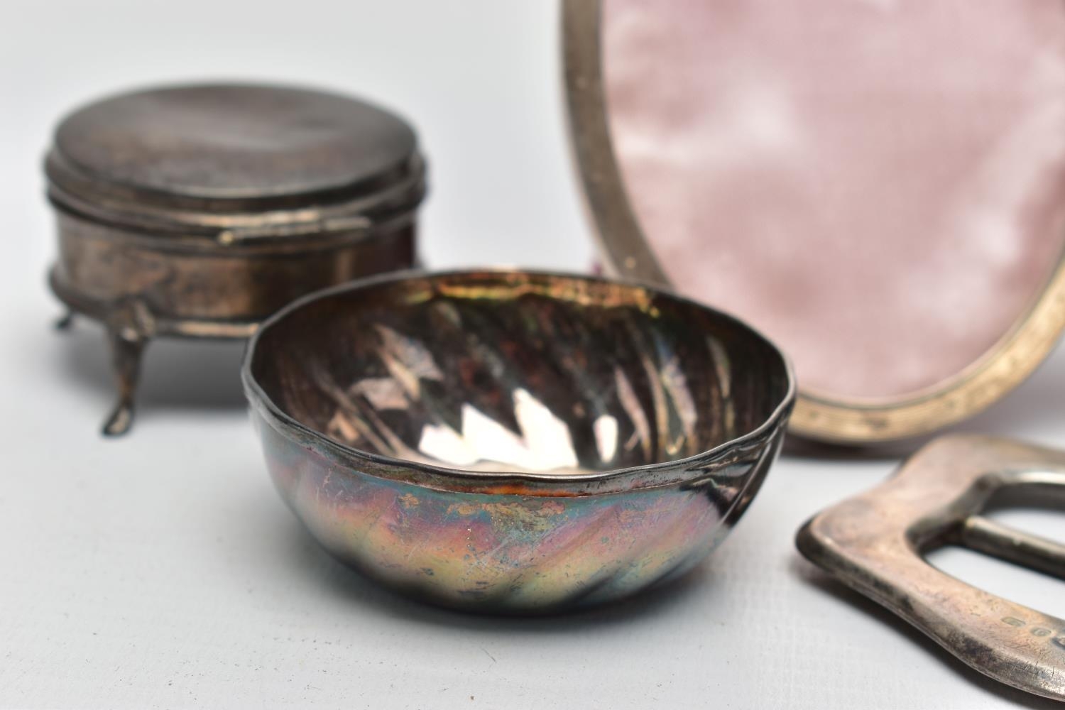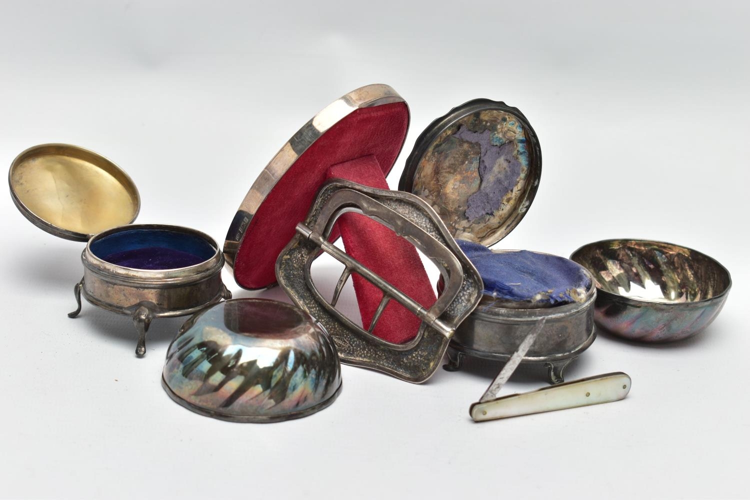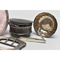 A SMALL PARCEL OF SILVER, comprising a late Victorian buckle, plain with a wavy outline, maker's mark partially rubbed, Birmingham 1895, 1.56ozt, 48.5 grams, a pair of modern Dutch white metal nut bowls, bearing import marks for .800 silver, 41.3 grams, diameter 6.4cm, an Elizabeth II easel back oval silver photograph frame, inner dimensions 9cm x 6.5cm, Birmingham 1971, two circular silver trinket boxes and a mother of pearl handled folding fruit knife with a steel blade (7) (Condition report: buckle and photo frame are both in good condition, both trinket boxes have dents, the larger one has a damaged interior, the pair of nut bowls are in fair condition with slight misshaping around the rim of one)