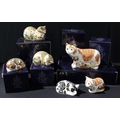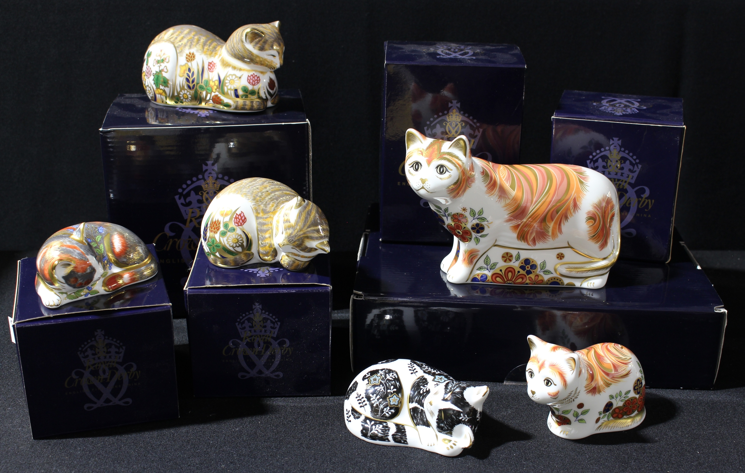 A Royal Crown Derby paperweight, Sugar, Collector's Guild Cat, gold stopper, boxed; another, Spice, Collector's Guild Kitten, gold stopper, boxed; others, Cottage Garden Cat, Cottage Garden Kitten, Catnip Kitten, Misty Kitten, all gold stoppers, signed in gold, boxed (6)