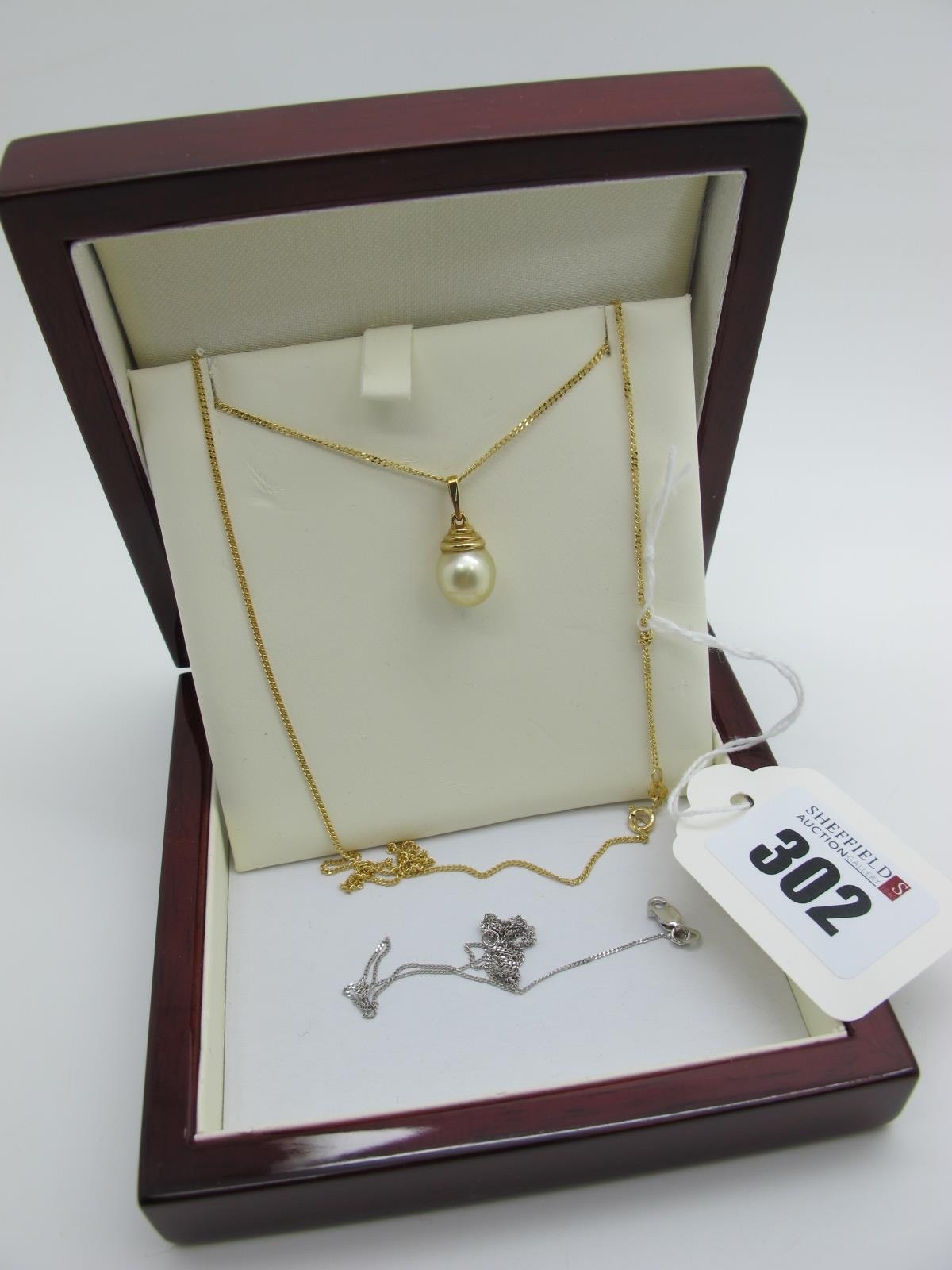 A Modern Pearl Pendant, on fine chain stamped "750"; together with a 9ct white gold fine chain (knotted).