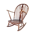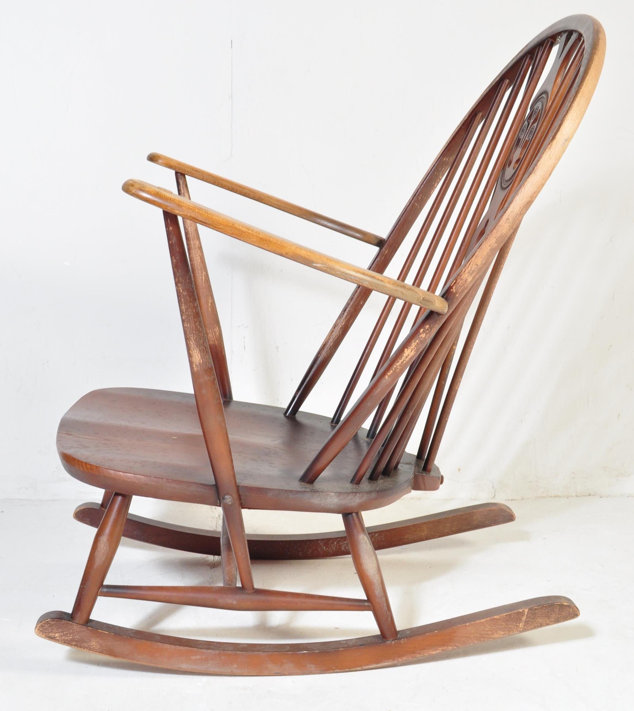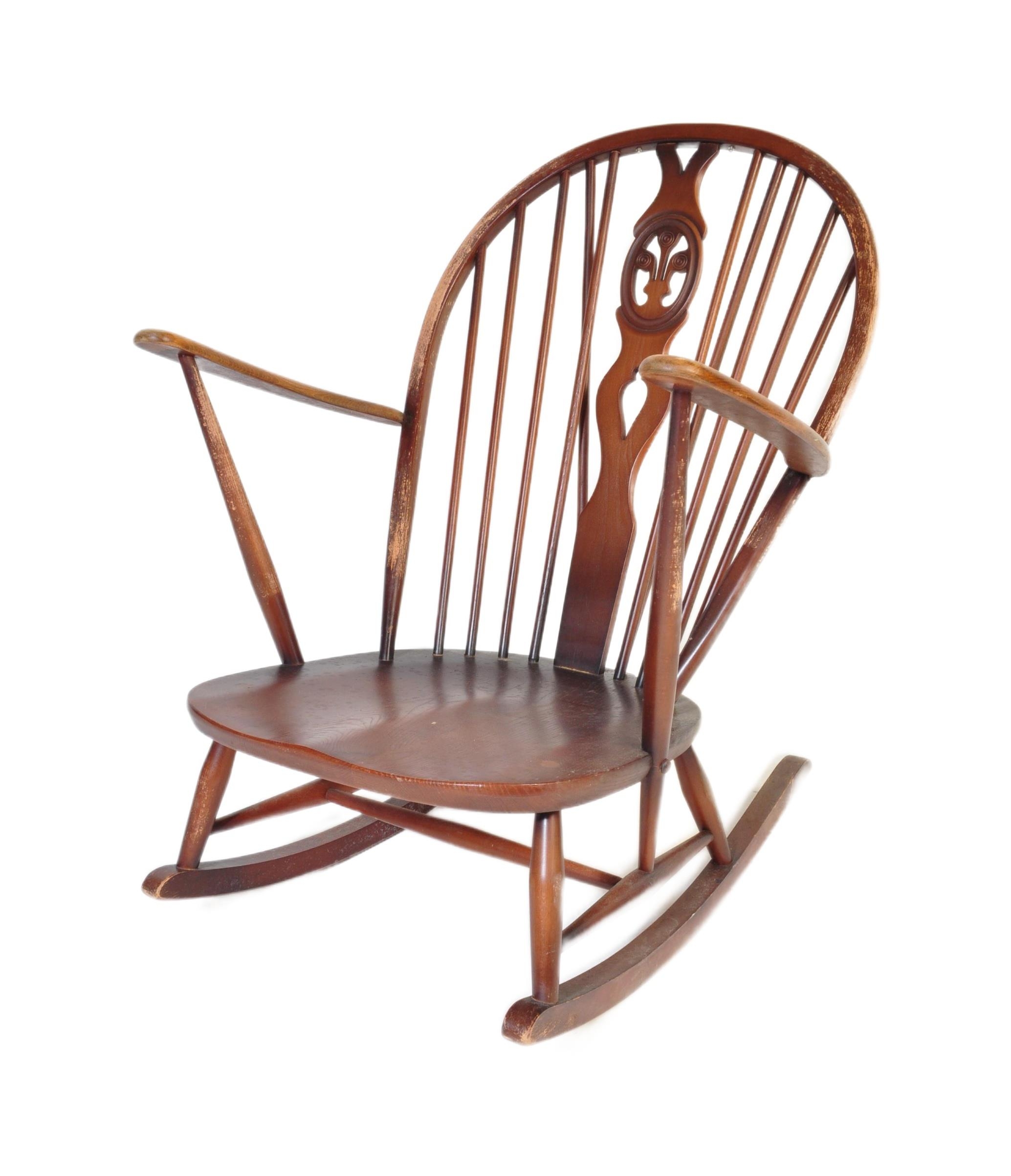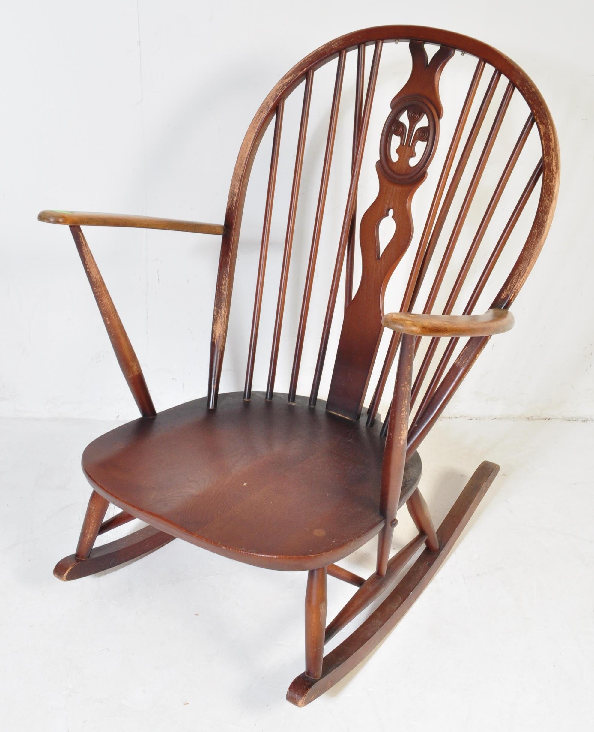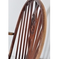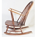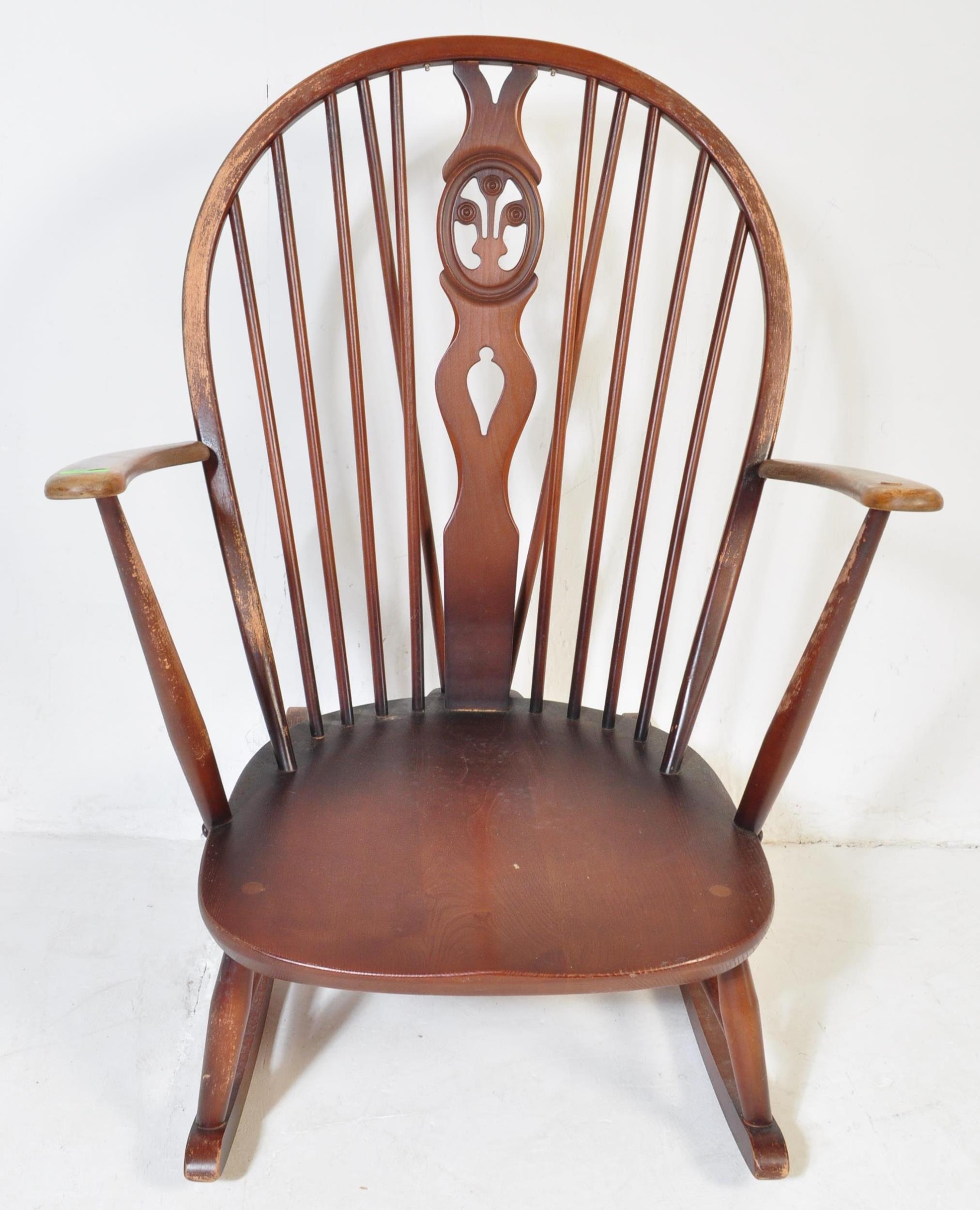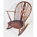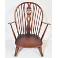 A retro vintage mid 20th Century dark beech and elm rocking chair. With rounded spindle wheelback with straight arms, on curving legs with stretcher. Measures approx. 96cm x 76cm x 78cm.