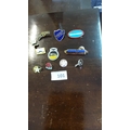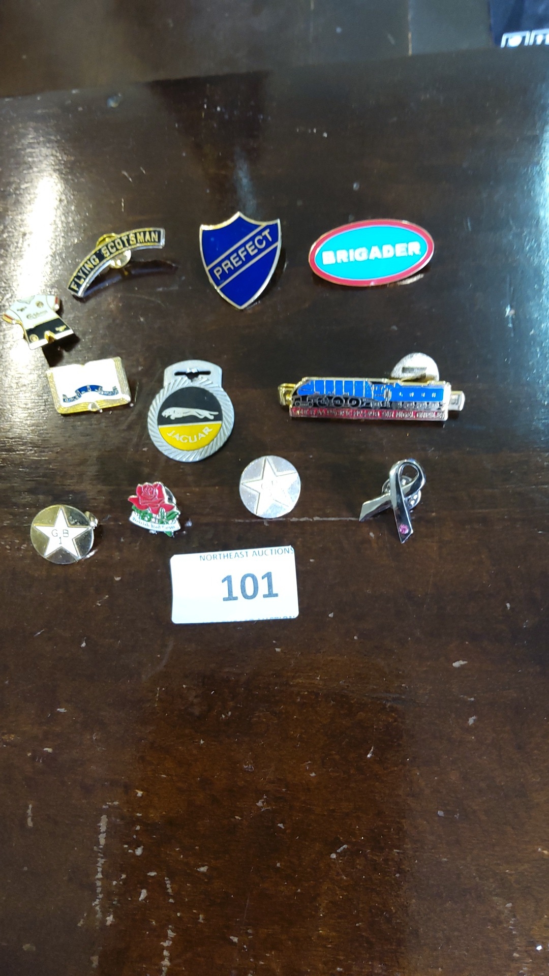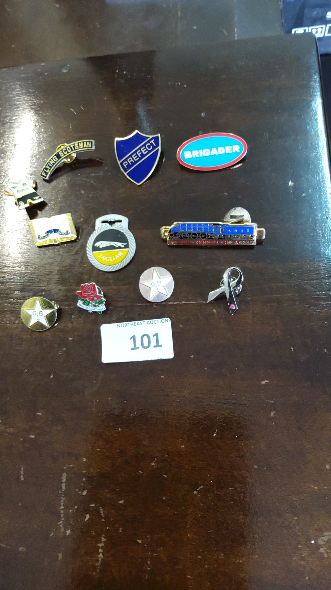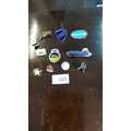 Group of eleven British novelty enamel and metal lapel pins, including Flying Scotsman locomotive, Jaguar logo, prefect shield, star GB badges, rose emblem and others.