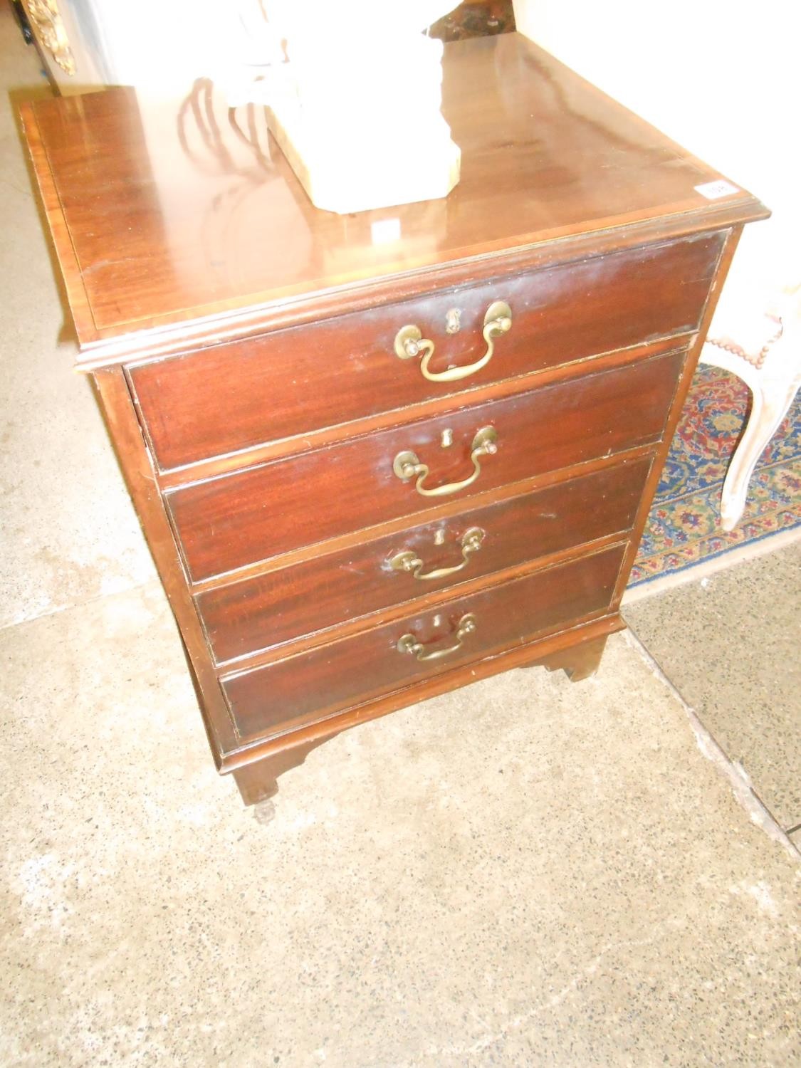 A Georgian mahogany and satinwood crossbanded commode converted to a chest, fitted four drawers, on bracket feet - 22in. wide