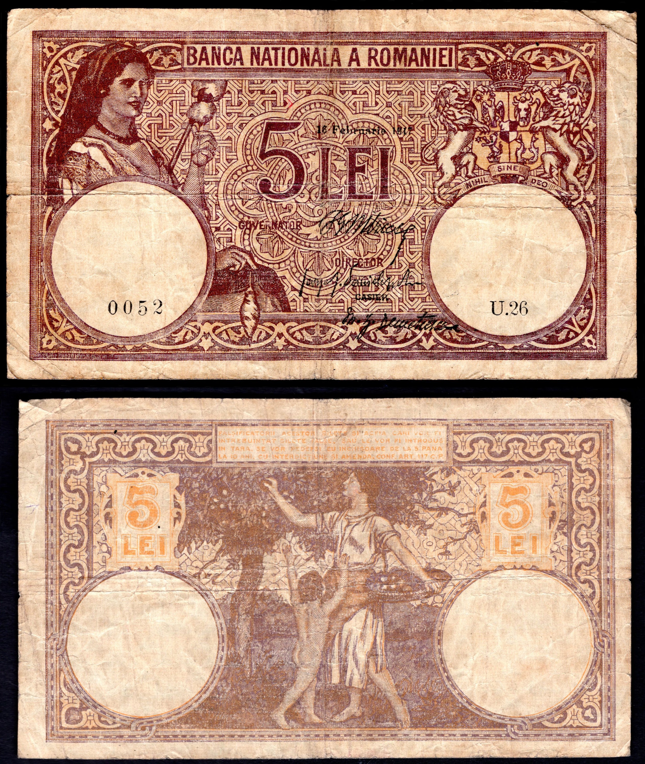Romania, Banca Nationala a Romaniei, 5 Lei, 16 Feb 1917, #0052 U.26 (Pick 24a). Couple of pinholes, Fine.