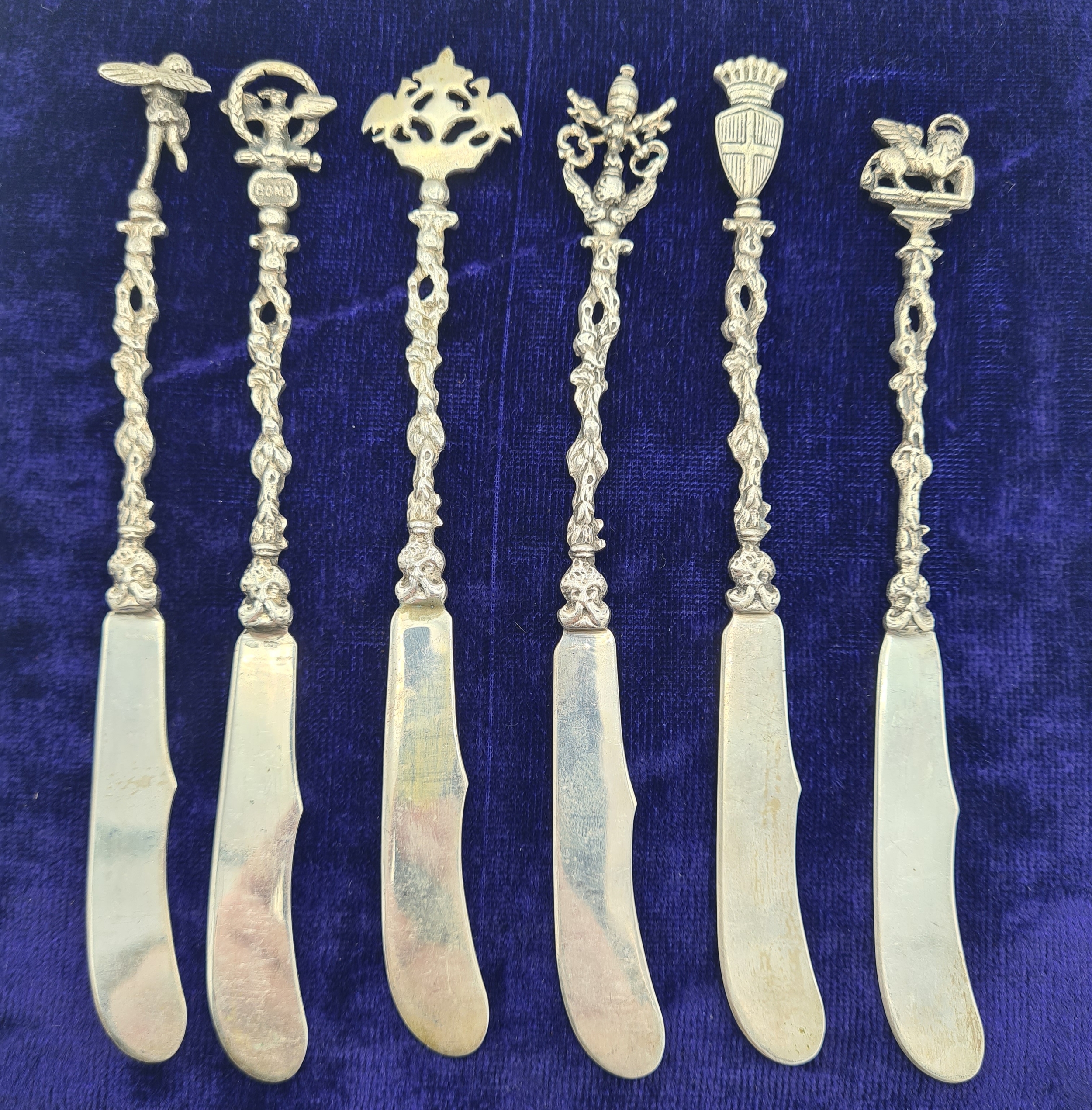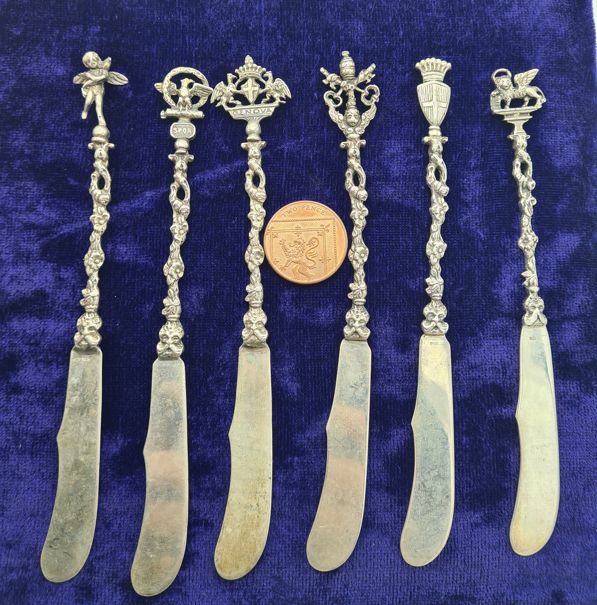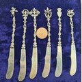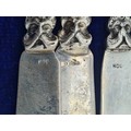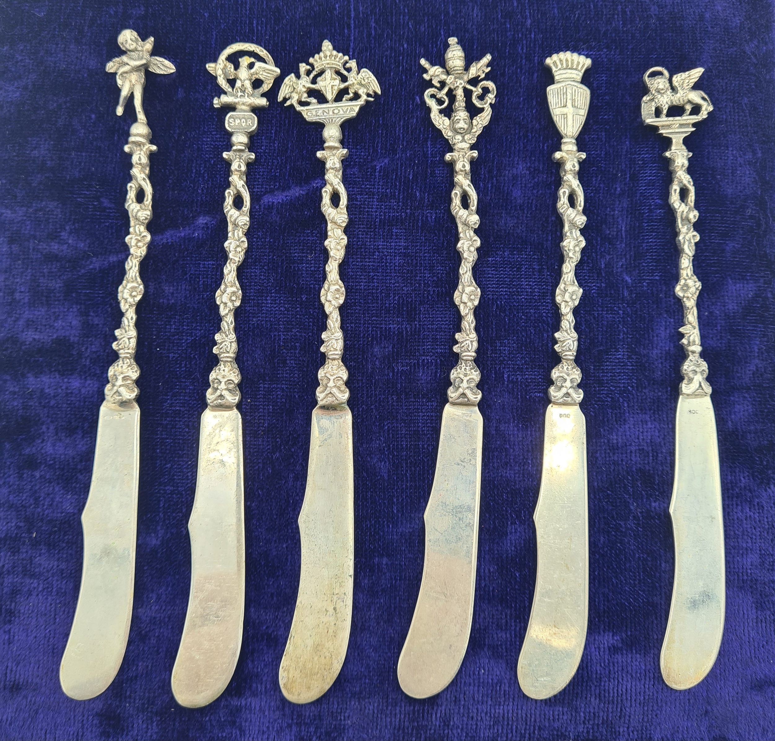 A set of 6 Continental Silver 800 Butter knives with emblem detailing.