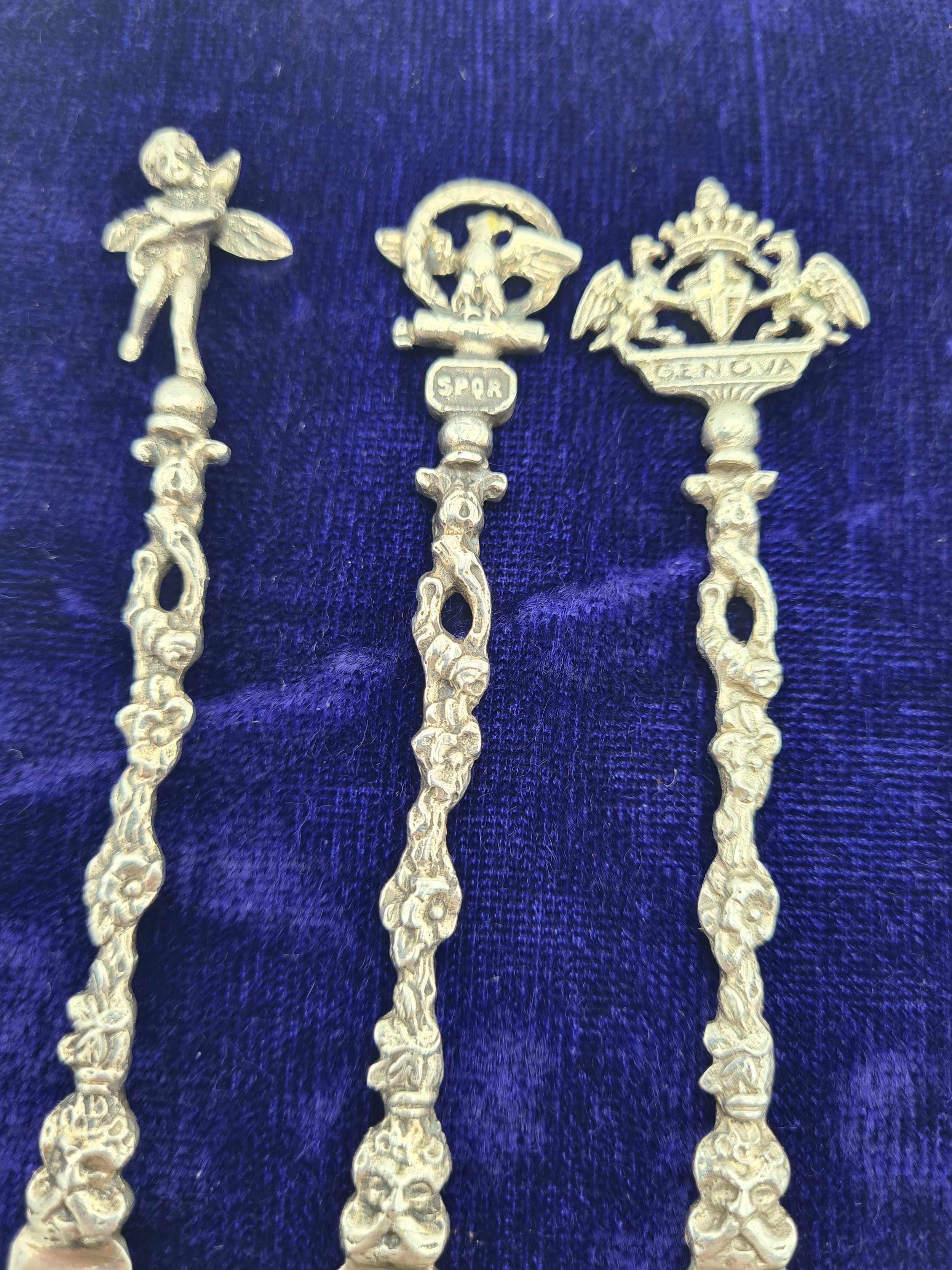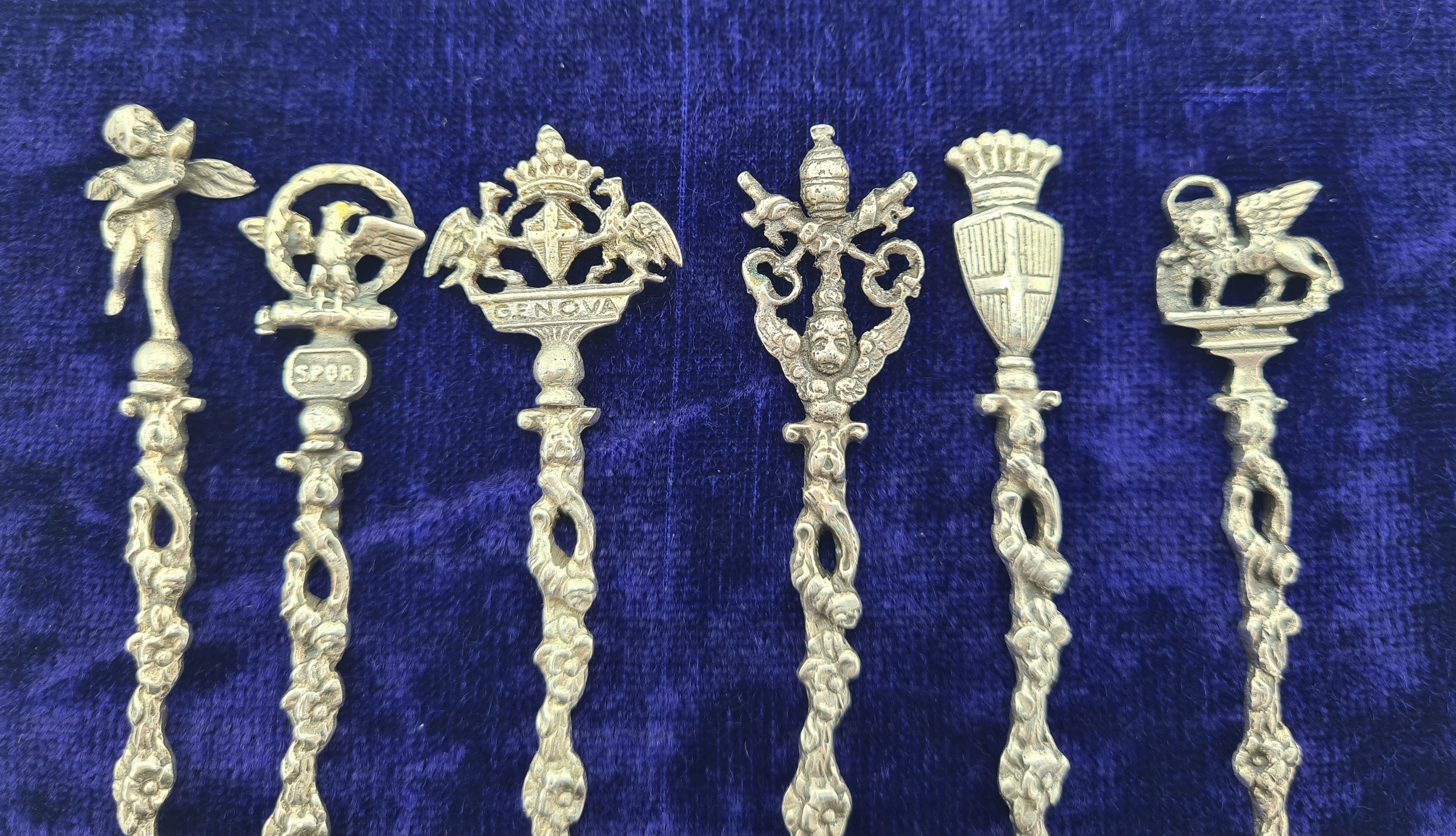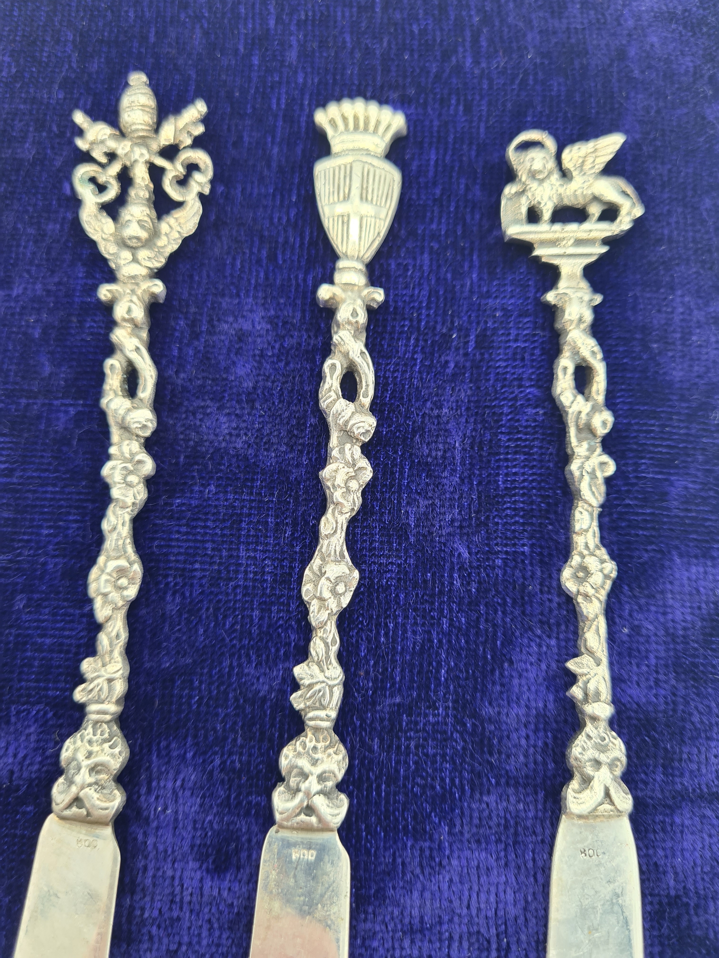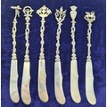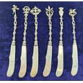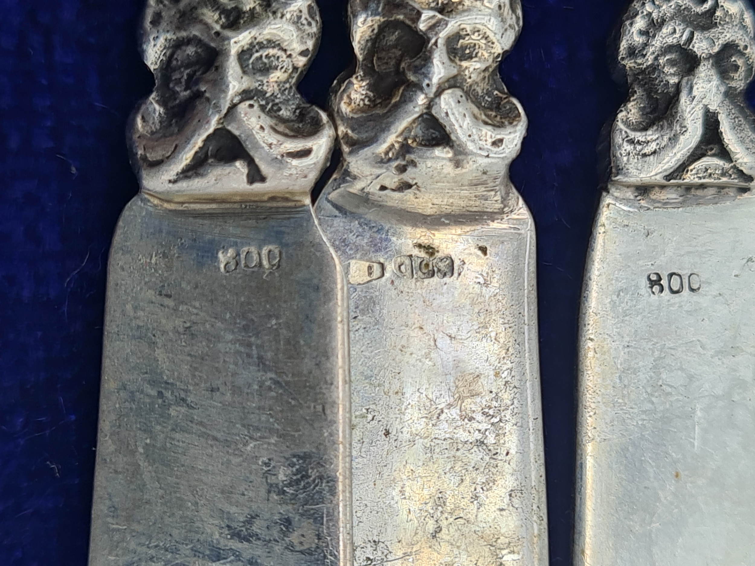 A set of 6 Continental Silver 800 Butter knives with emblem detailing.