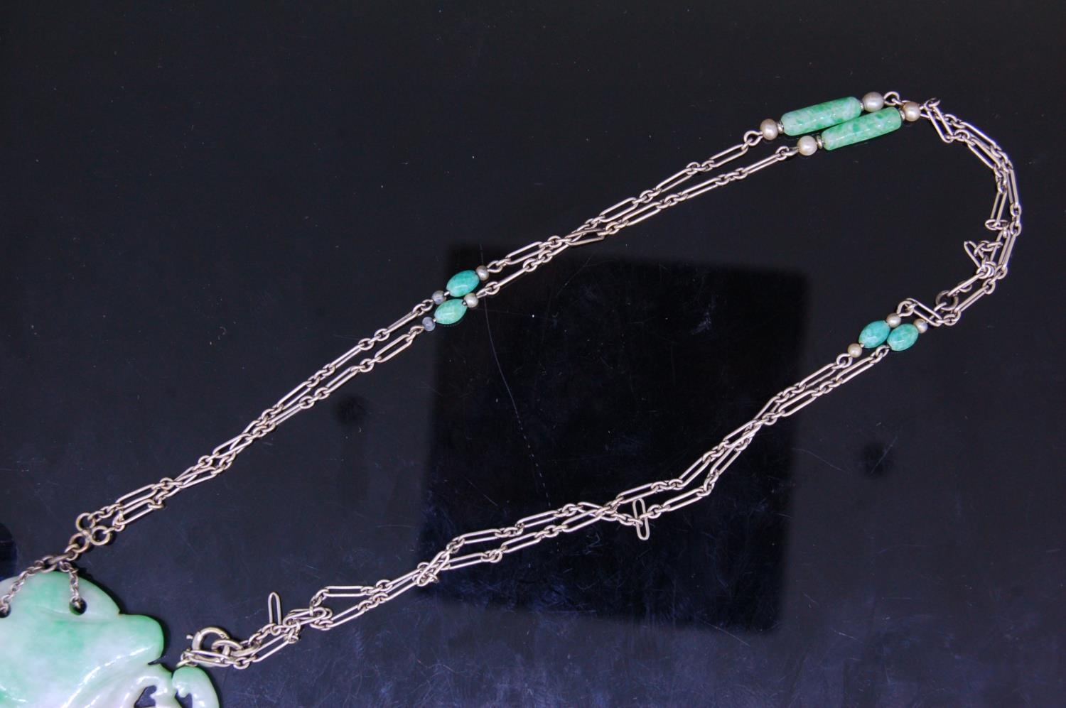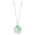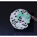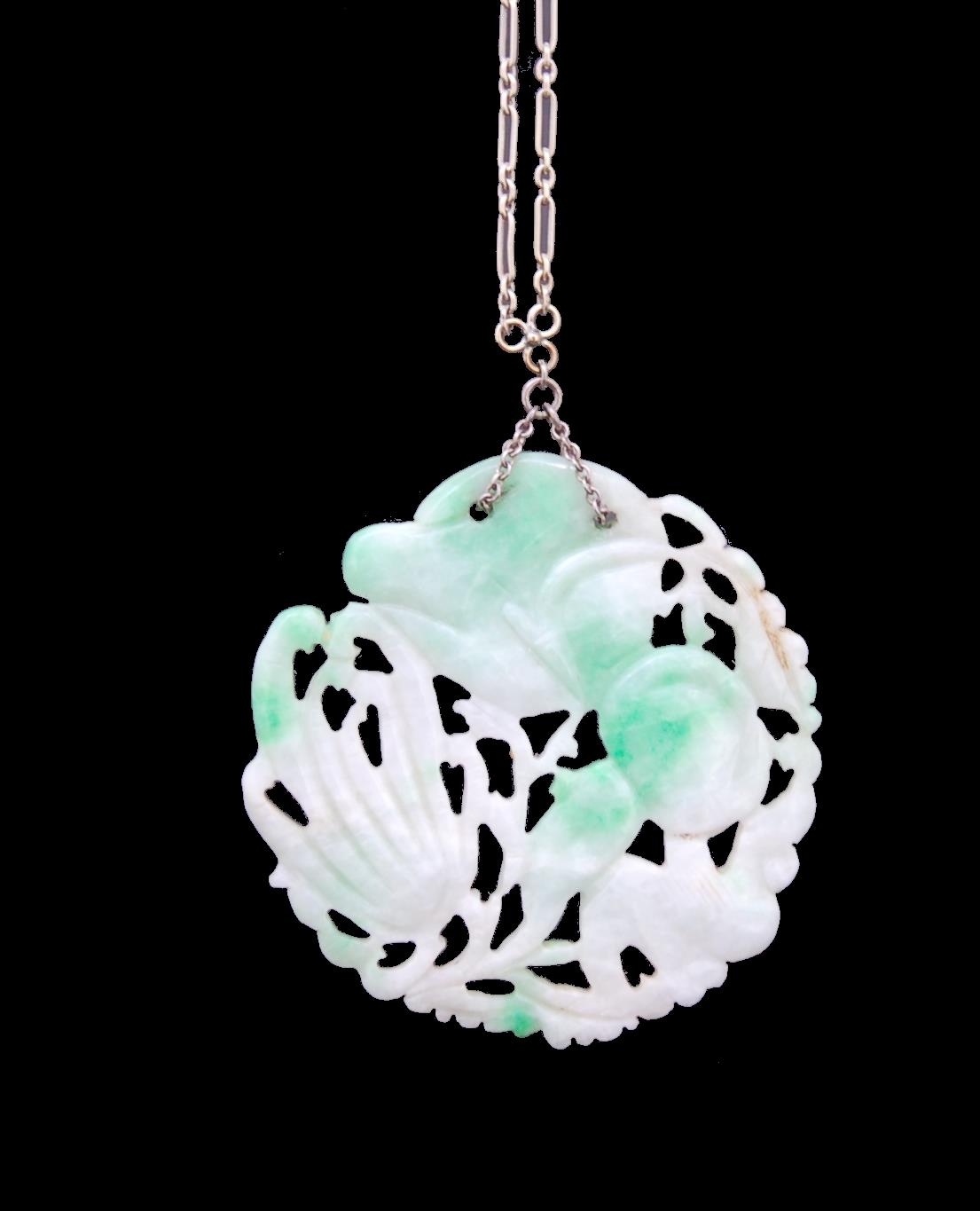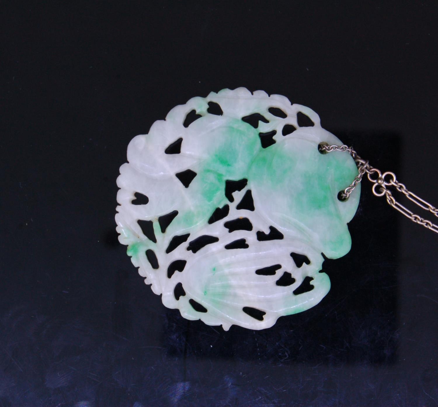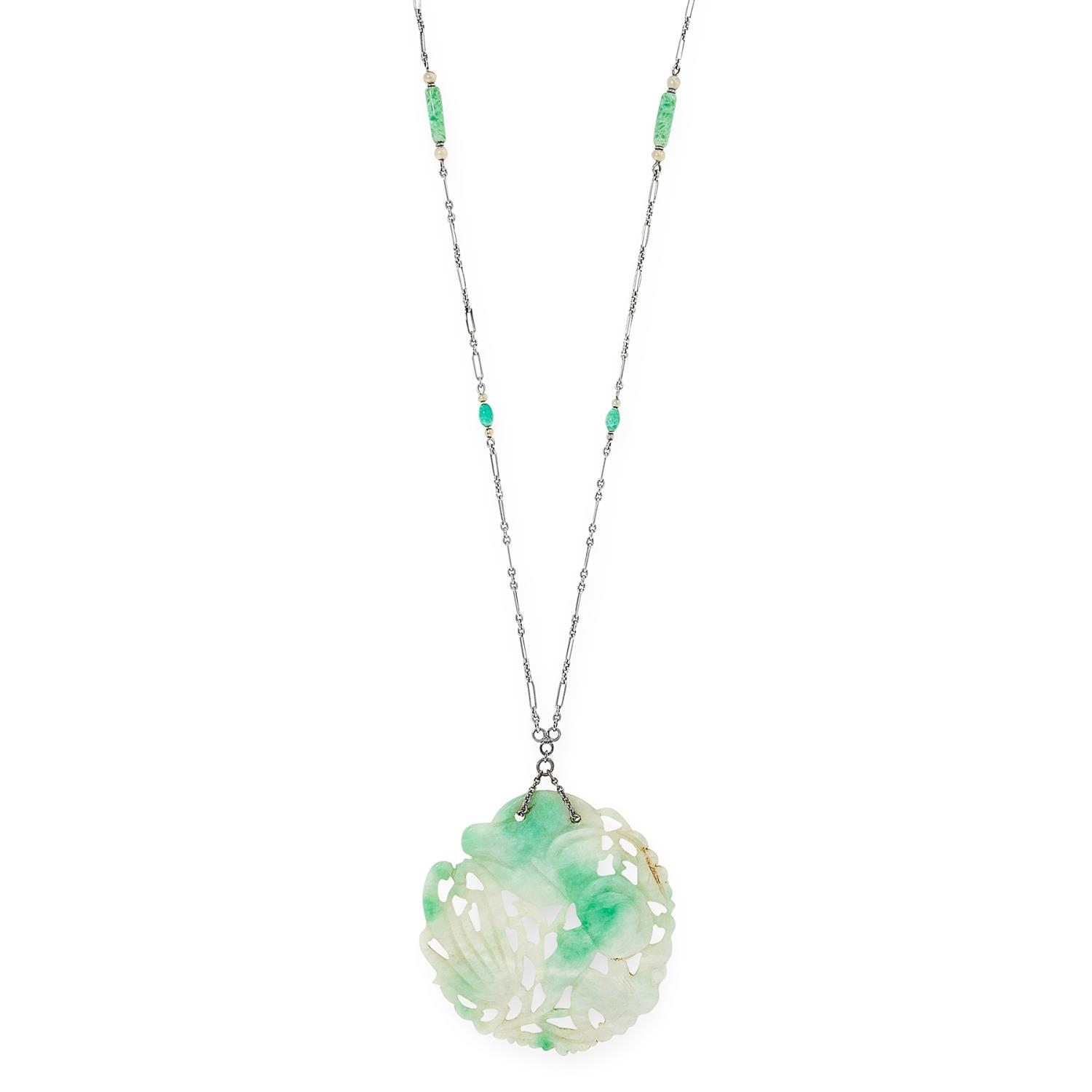 CIRCULAR CARVED JADE PENDANT NECKLACE, the carved jade plaque with an openwork floral design . L. 64 cm. Diam. plaque 4.5 cm. 17.2 grams. Provenance: Yvonne Arnaud (1890-1958).