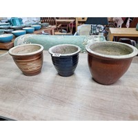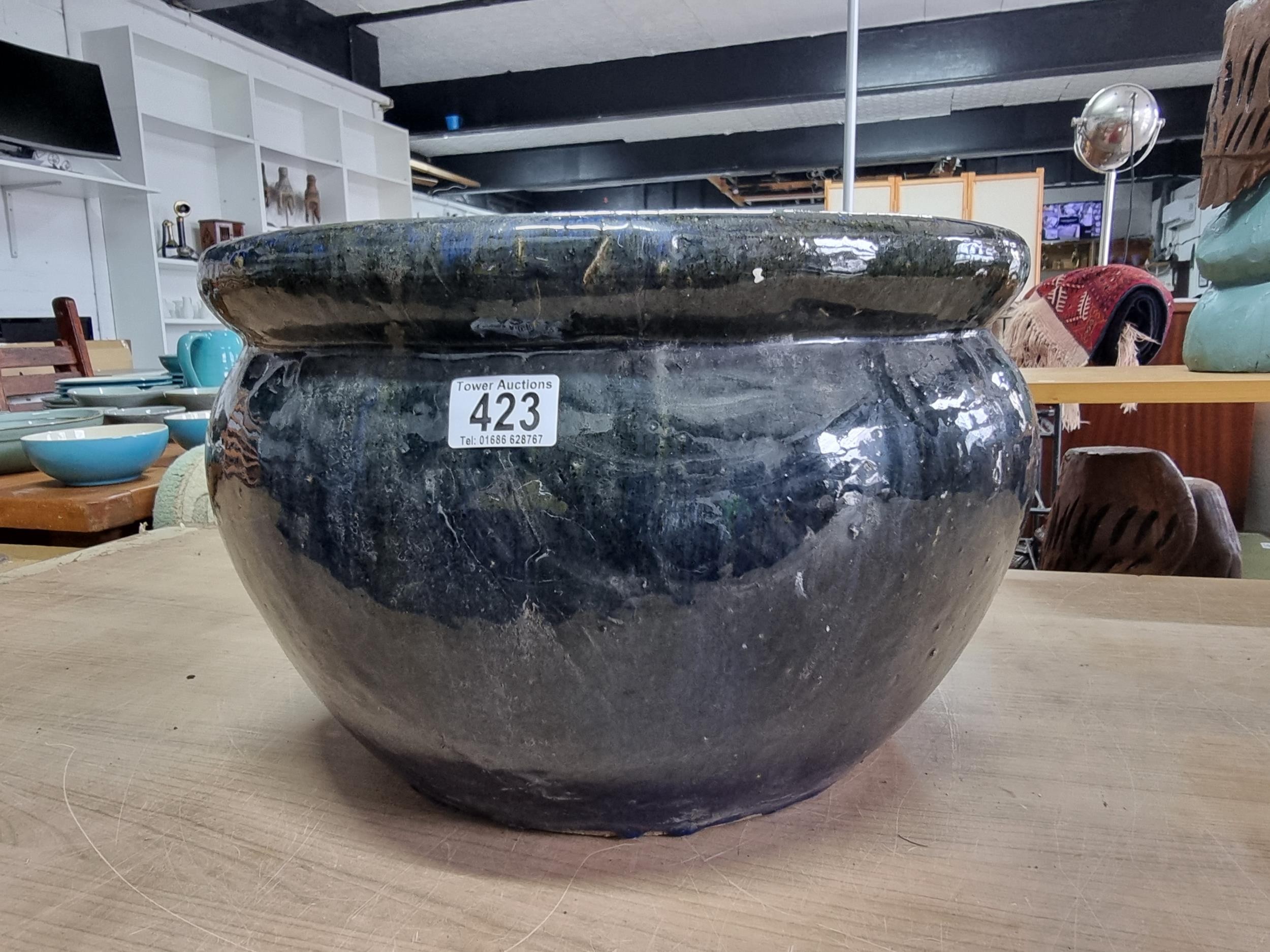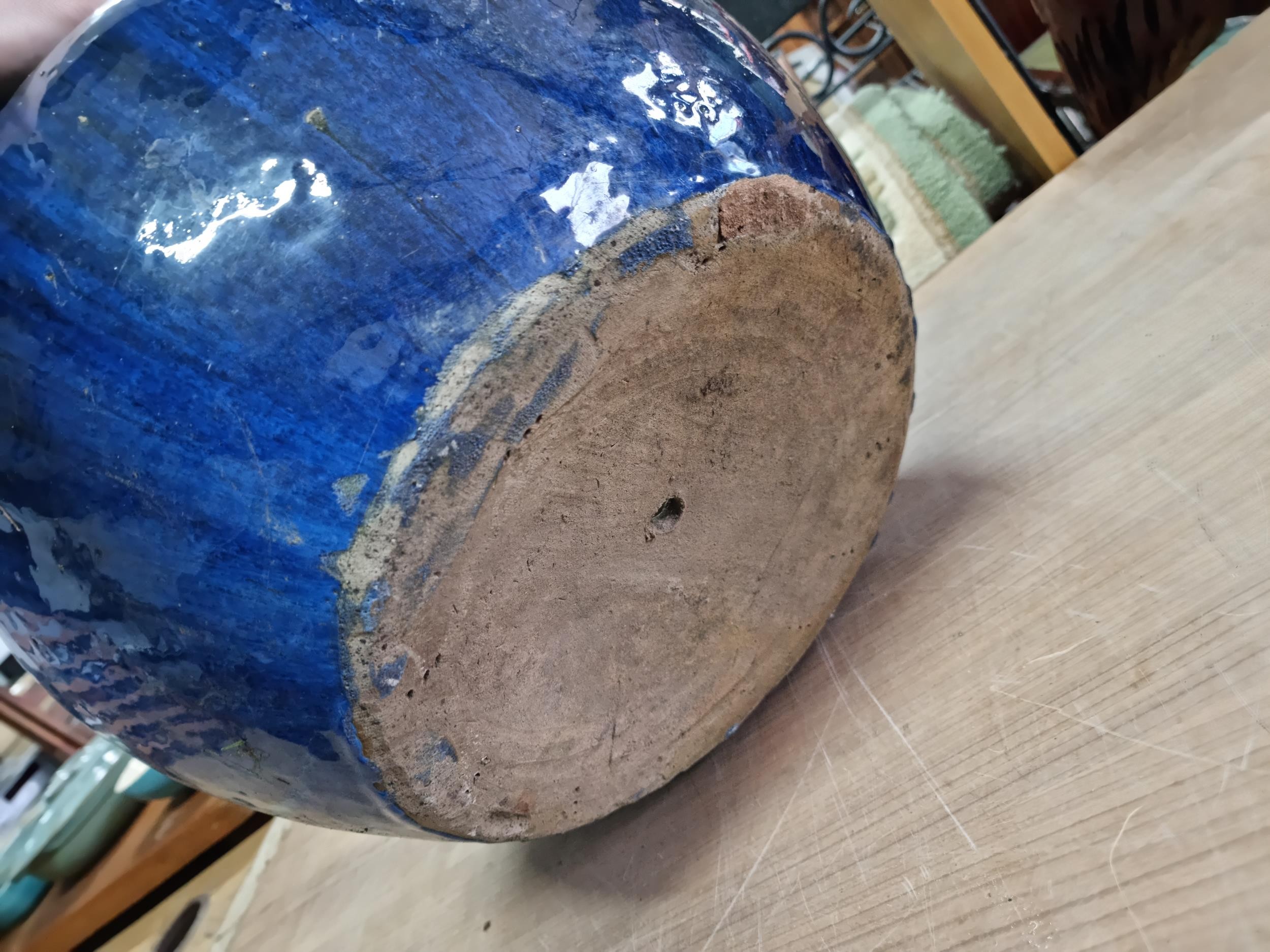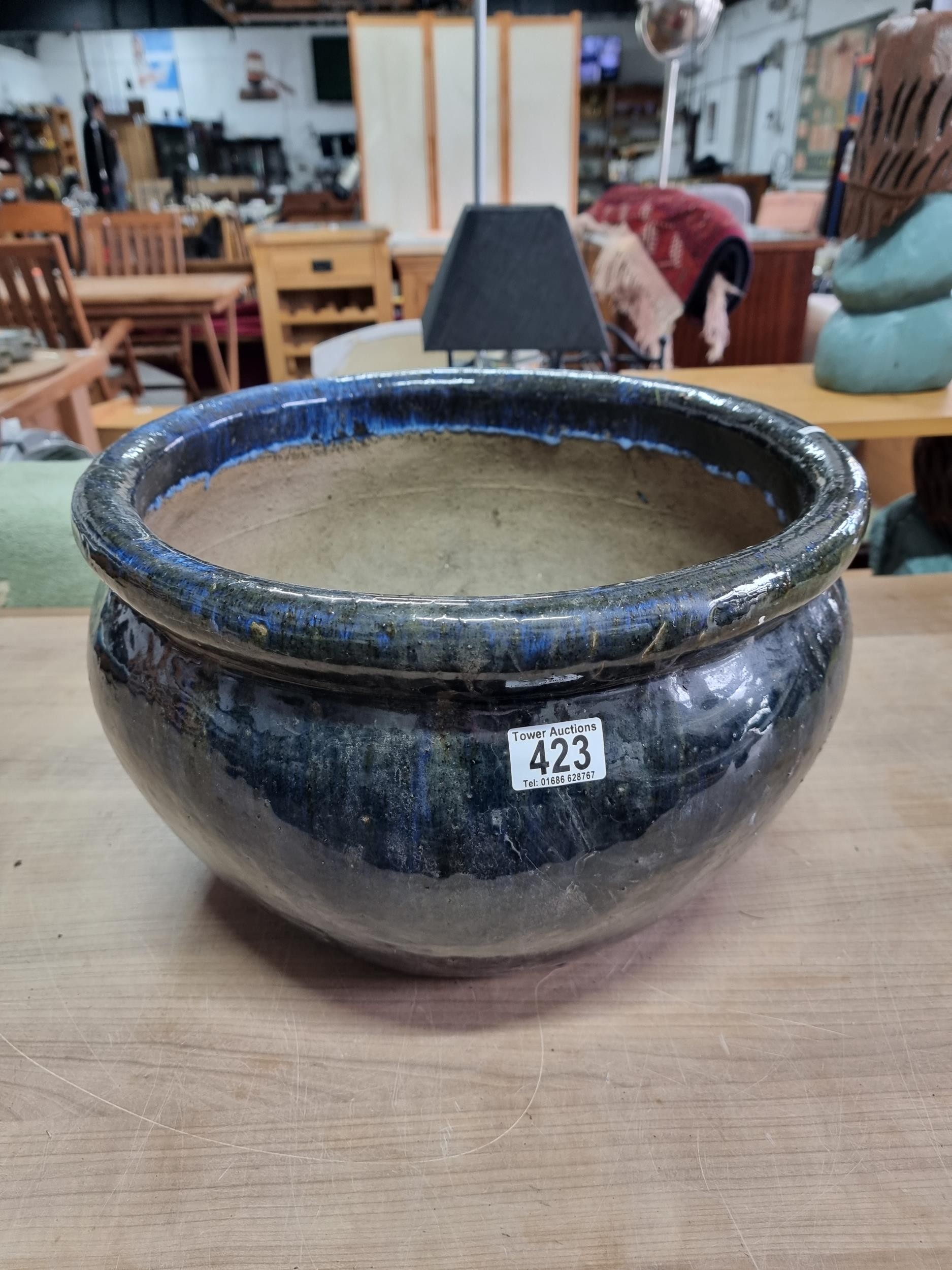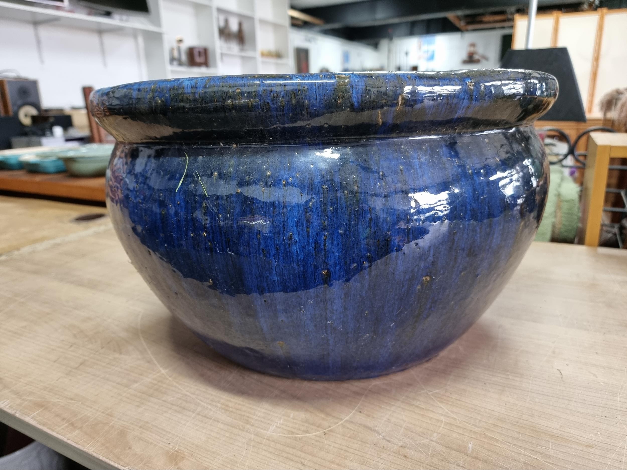 Large mottled blue planter in good order with no chips or cracks measures 28cm high 43cm diameter
