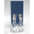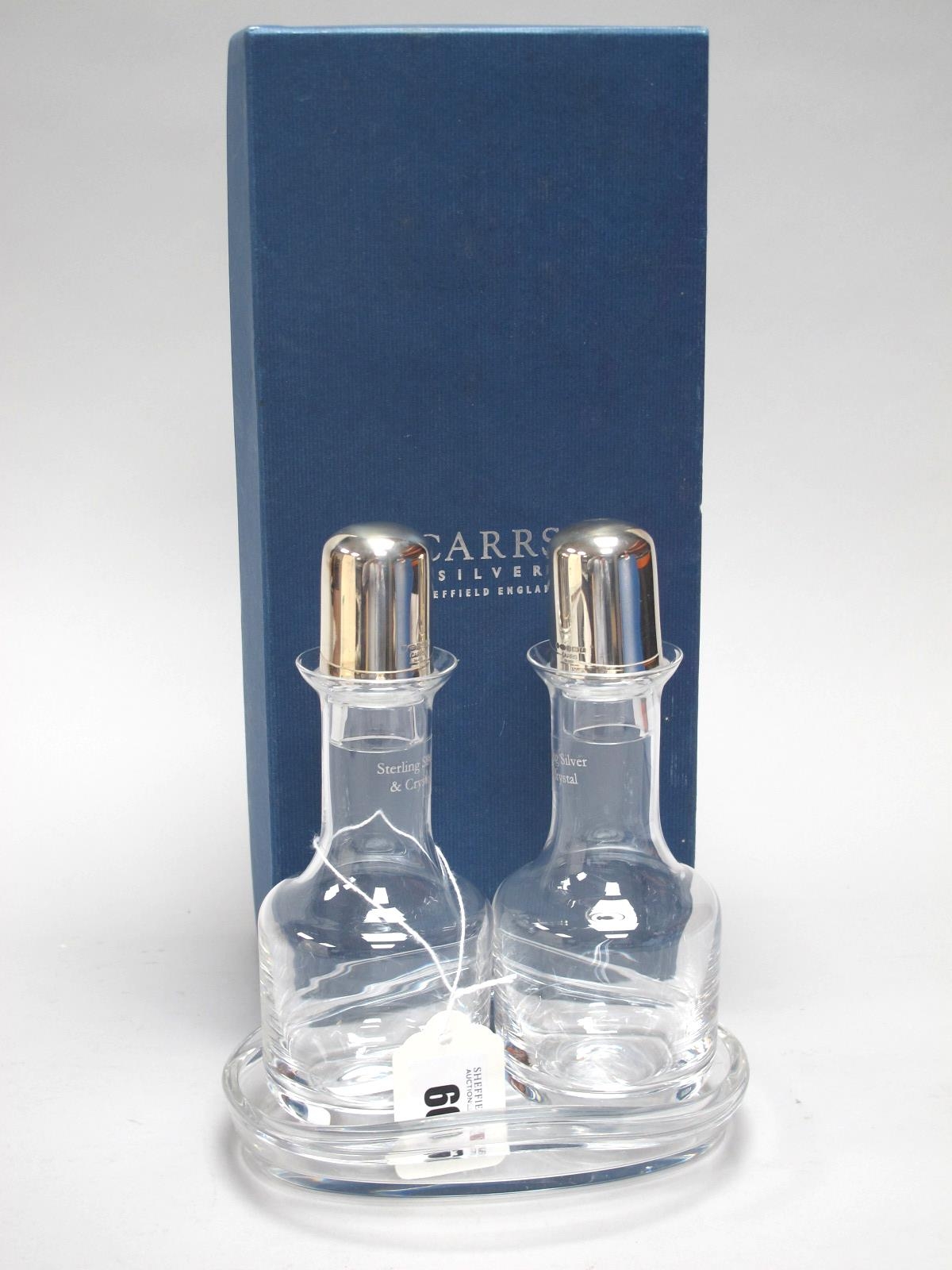 A Pair of Modern Hallmarked Silver Mounted Stoppered Bottles on Stand, RC (Carrs), Sheffield 2005, the plain crystal bottles each with hallmarked silver mounted stopper, approximate height 18cm, on plain oval glass stand, 15.4cm wide, boxed.