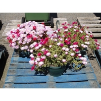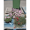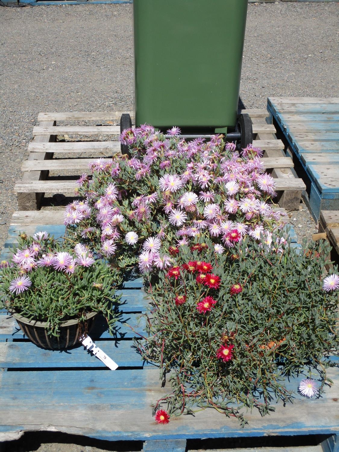 Three hanging baskets each containing flowering Ice plants