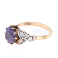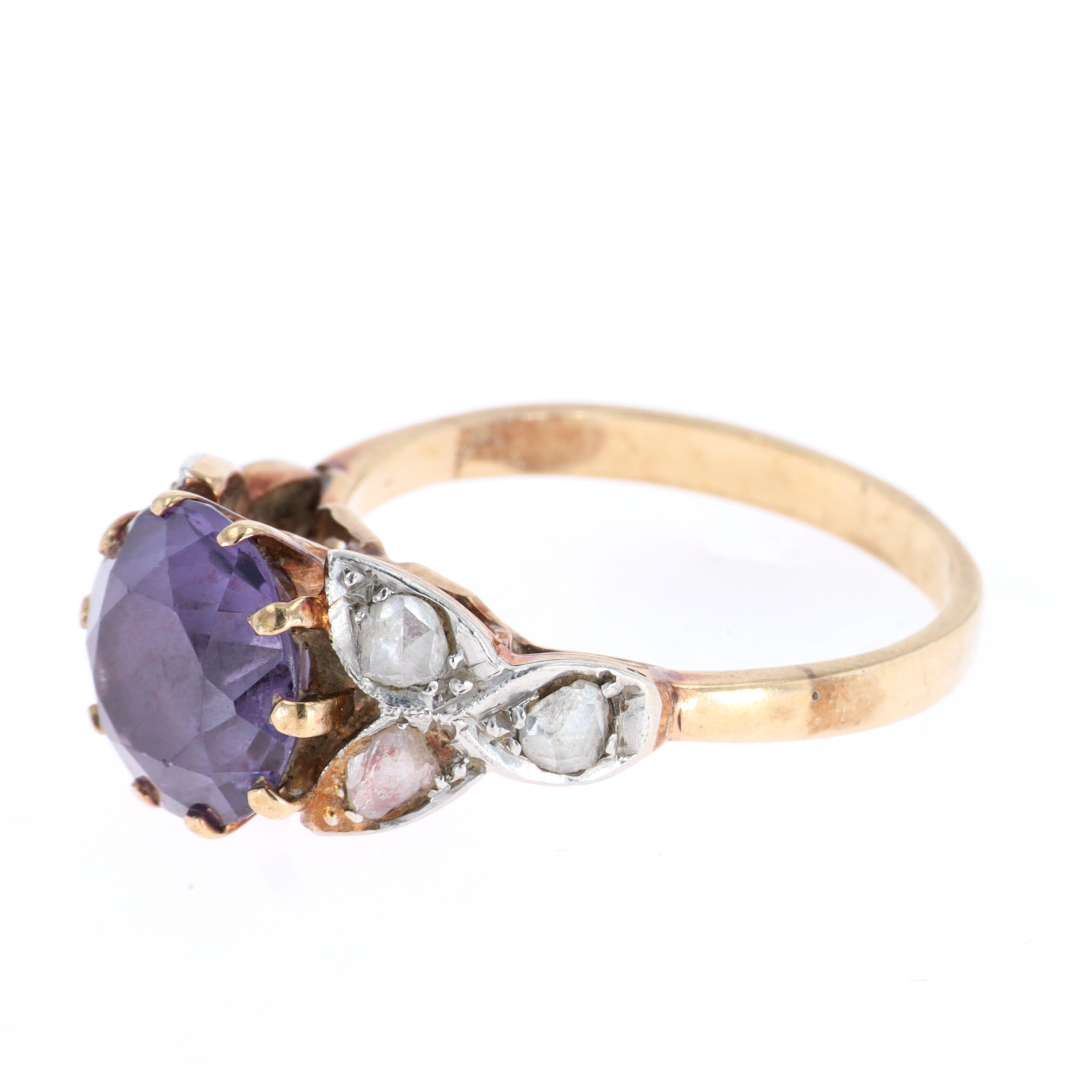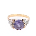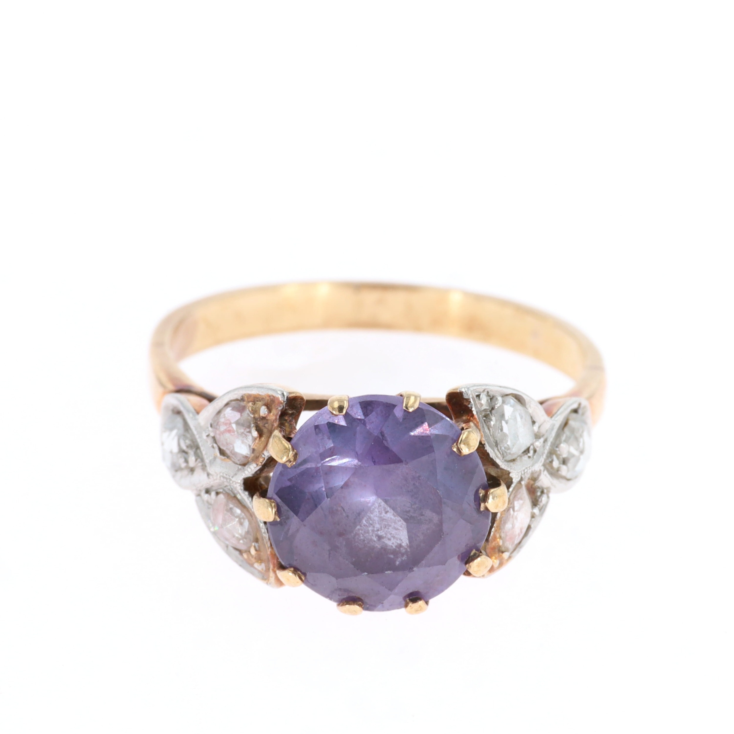 Rose Cut Diamond and Synthetic Colour Change Sapphire Gold and Platinum Ring. This piece has tested as 9ct gold and platinum. UK size P. There is some light wear and scratches to the metal. The central stone has light wear to the facet edges. There is light thinning of the band to the reverse. All stones are secure. Weighs 4.3g.