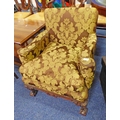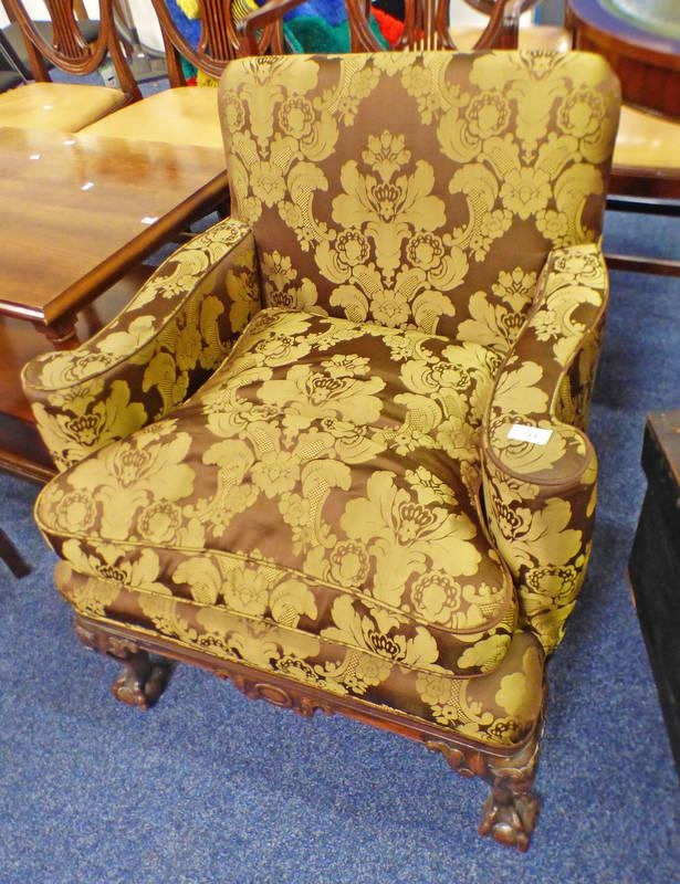 EARLY 20TH CENTURY MAHOGANY OVERSTUFFED SMALL ARMCHAIR ON BALL & CLAW SUPPORTS, 76CM TALL X 65CM WIDE