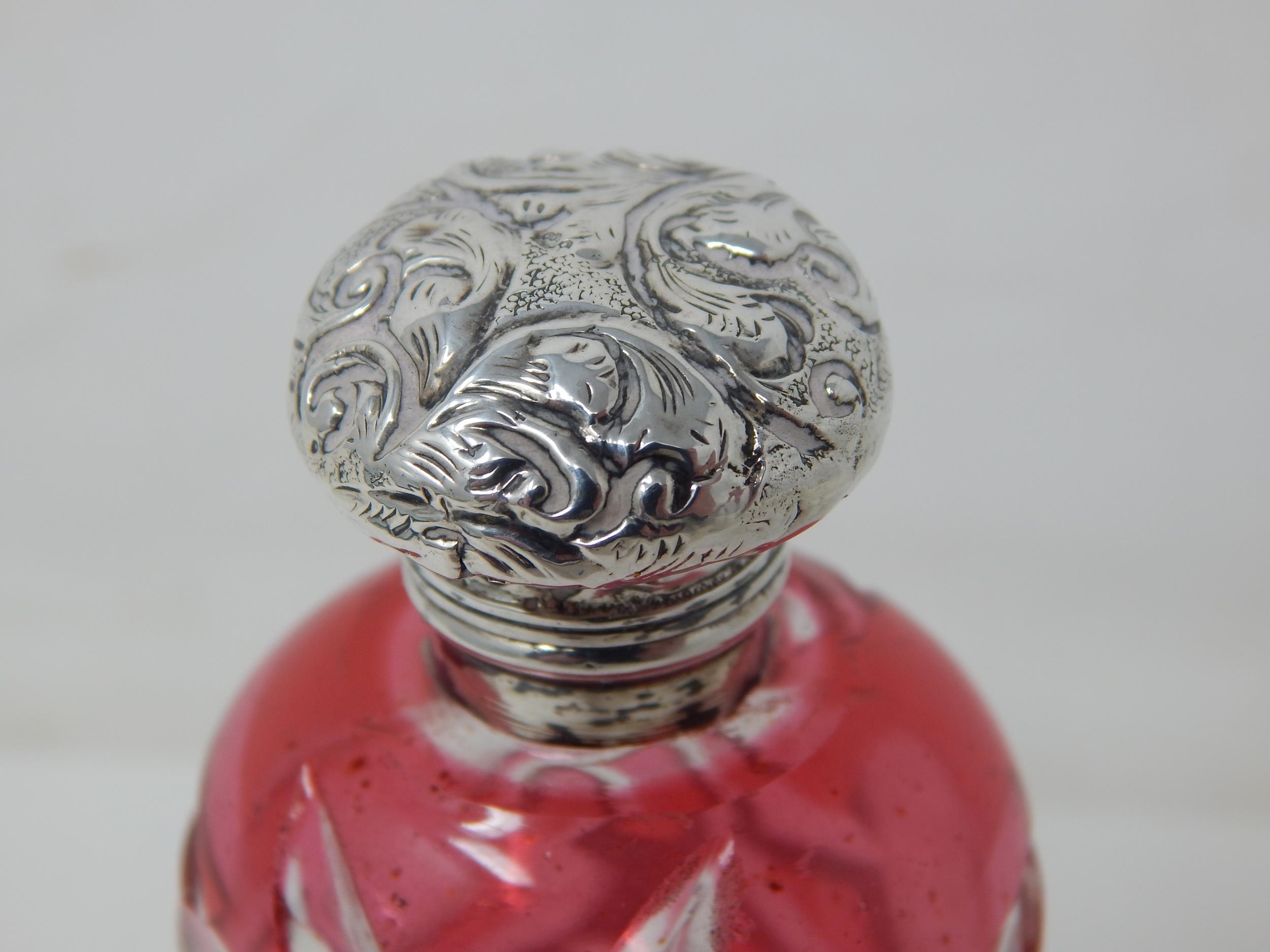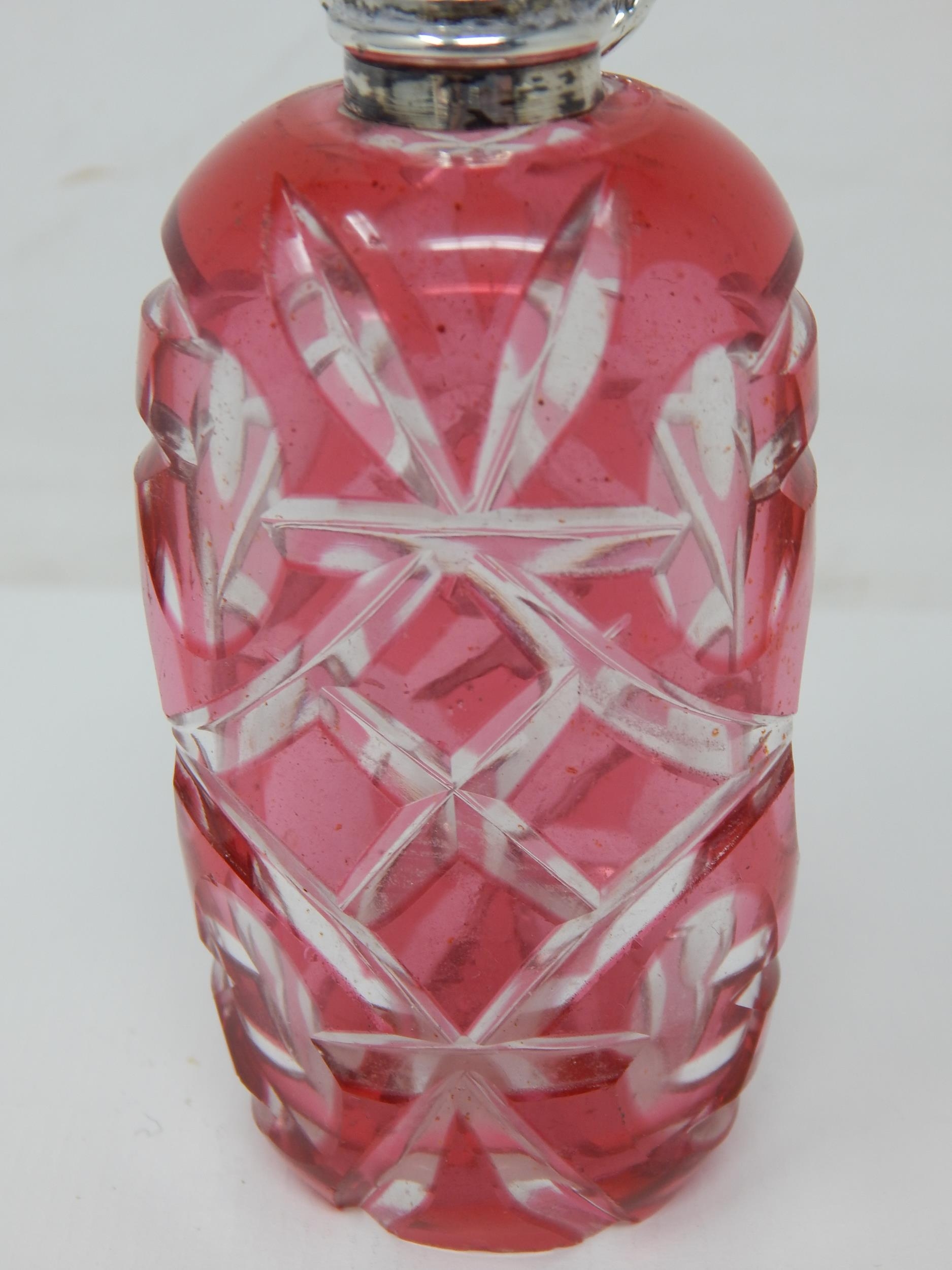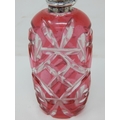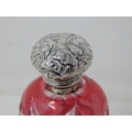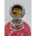Victorian Silver Topped Scent Bottle & Stopper with Cranberry Overlaid Cut Glass Body: Measuring 10cm high