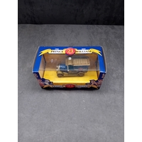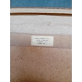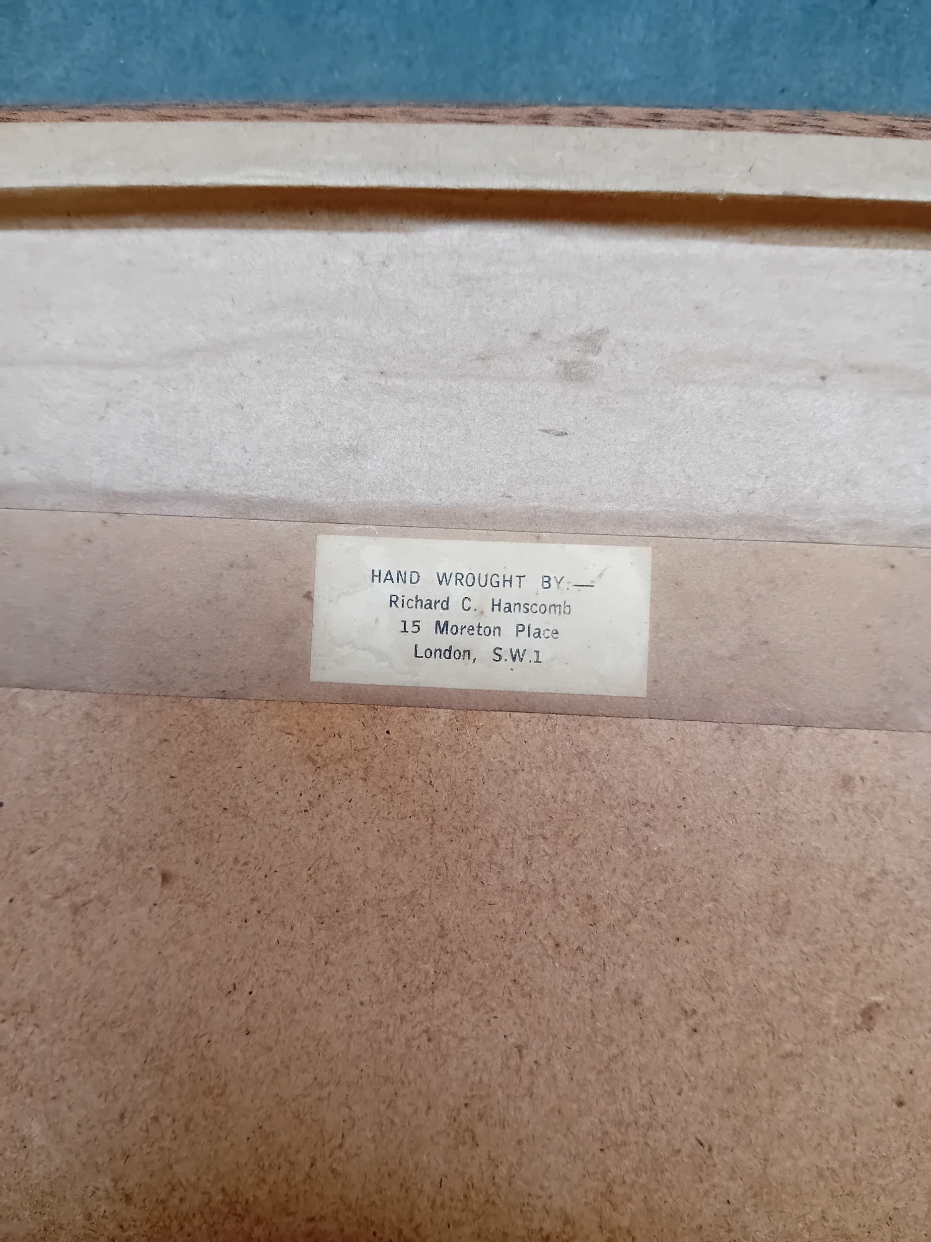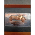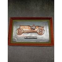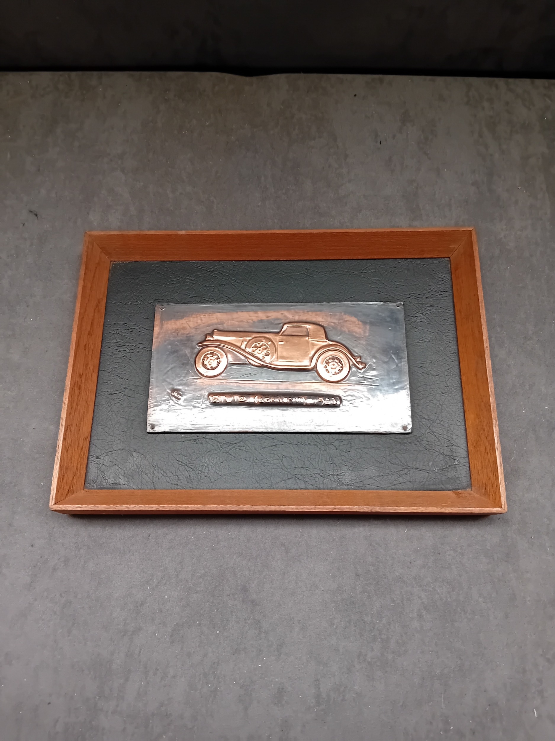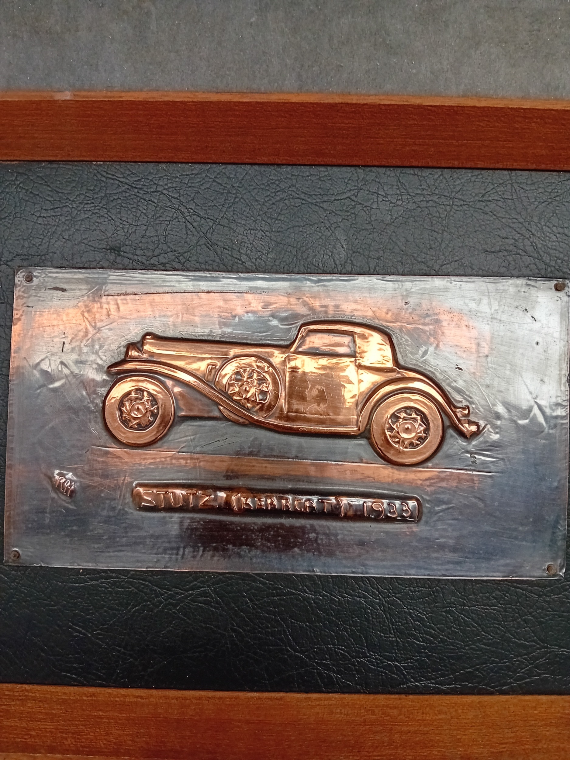 A hand-wrought Metal relief plaque depicting a Stutz Blackhawk automobile, created by Richard C. Hanscomb in 1983. The central image, rendered in copper-toned Metal, is mounted on a silver-toned metallic background with visible fastening points. This is set against a dark, textured matting and enclosed within a simple, rectangular wooden frame. A label on the reverse confirms the maker and address: "HAND WROUGHT BY:â Richard C. Hanscomb, 15 Moreton Place, London, S.W.1".