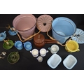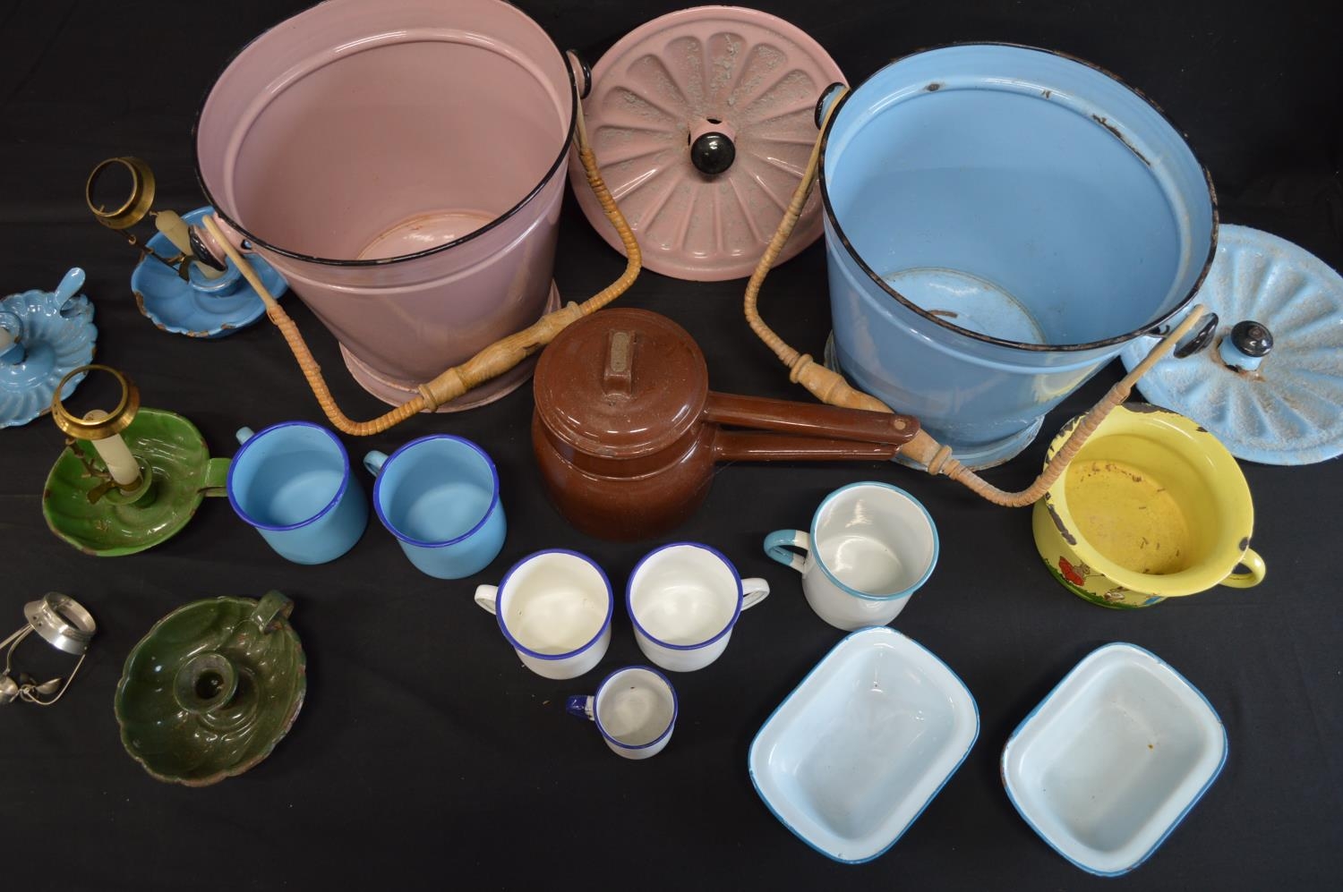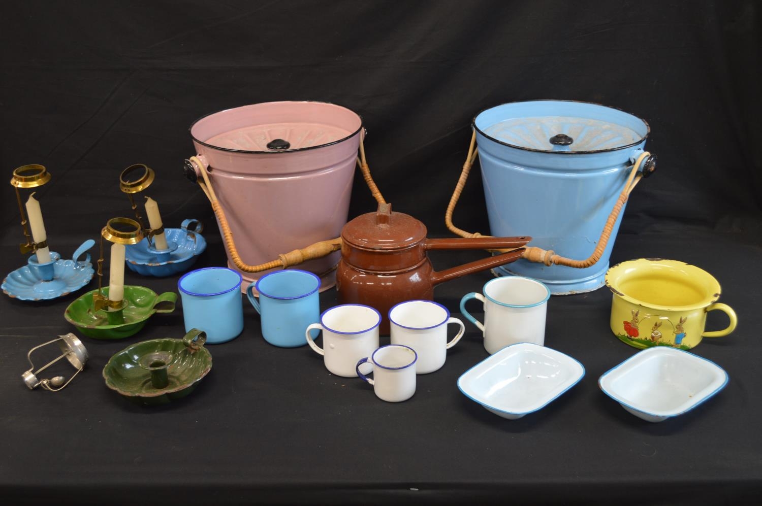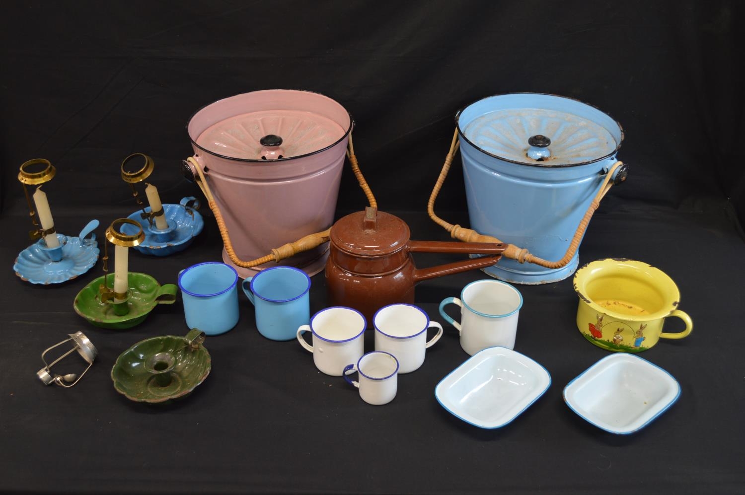 Collection of enamelware to include: two buckets with covers, chamber sticks and mugs etc