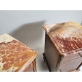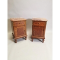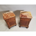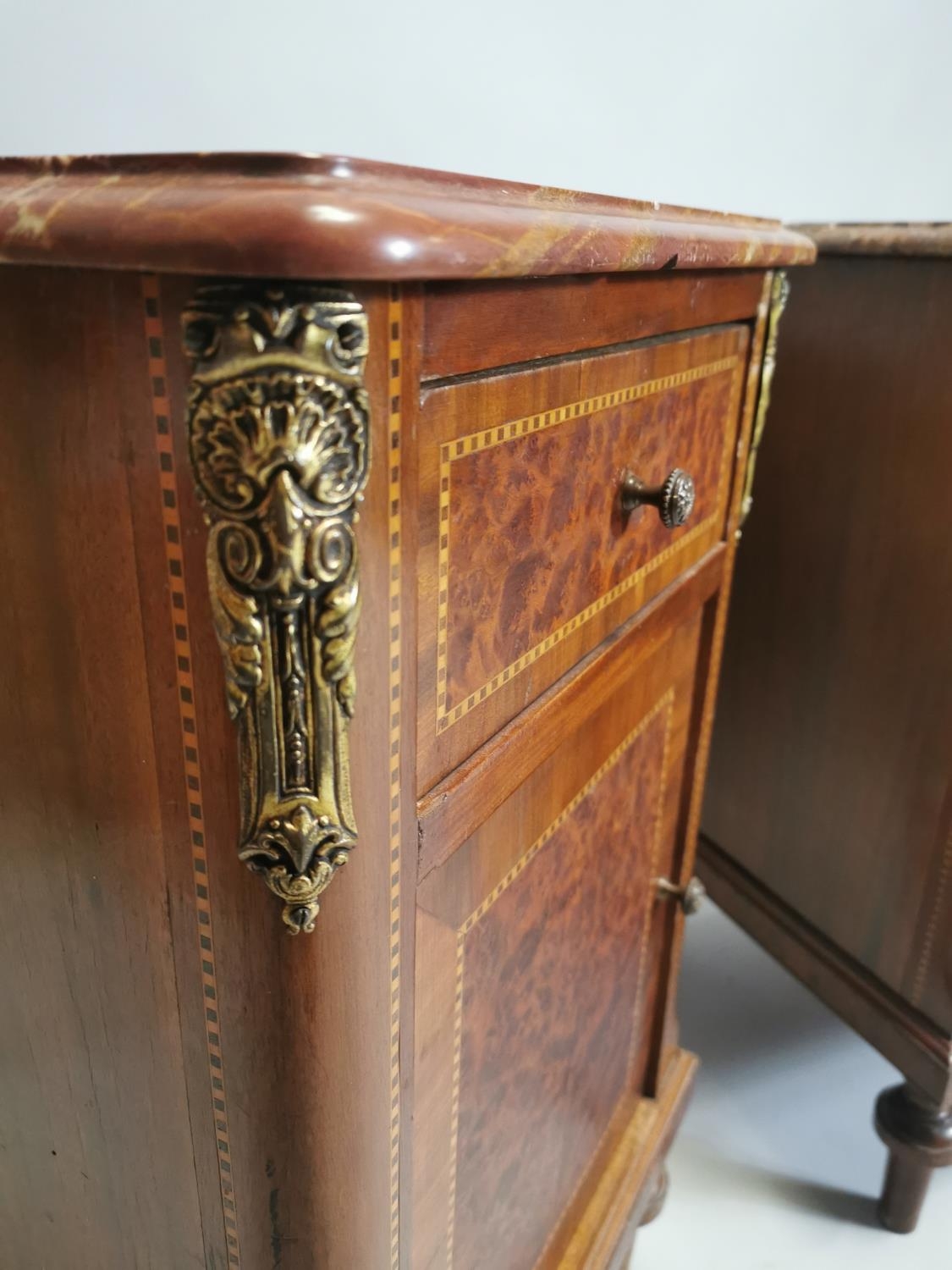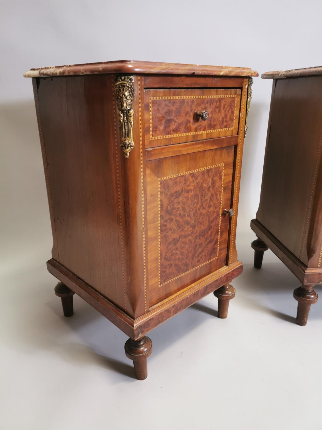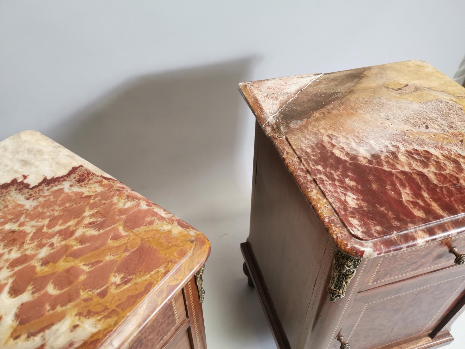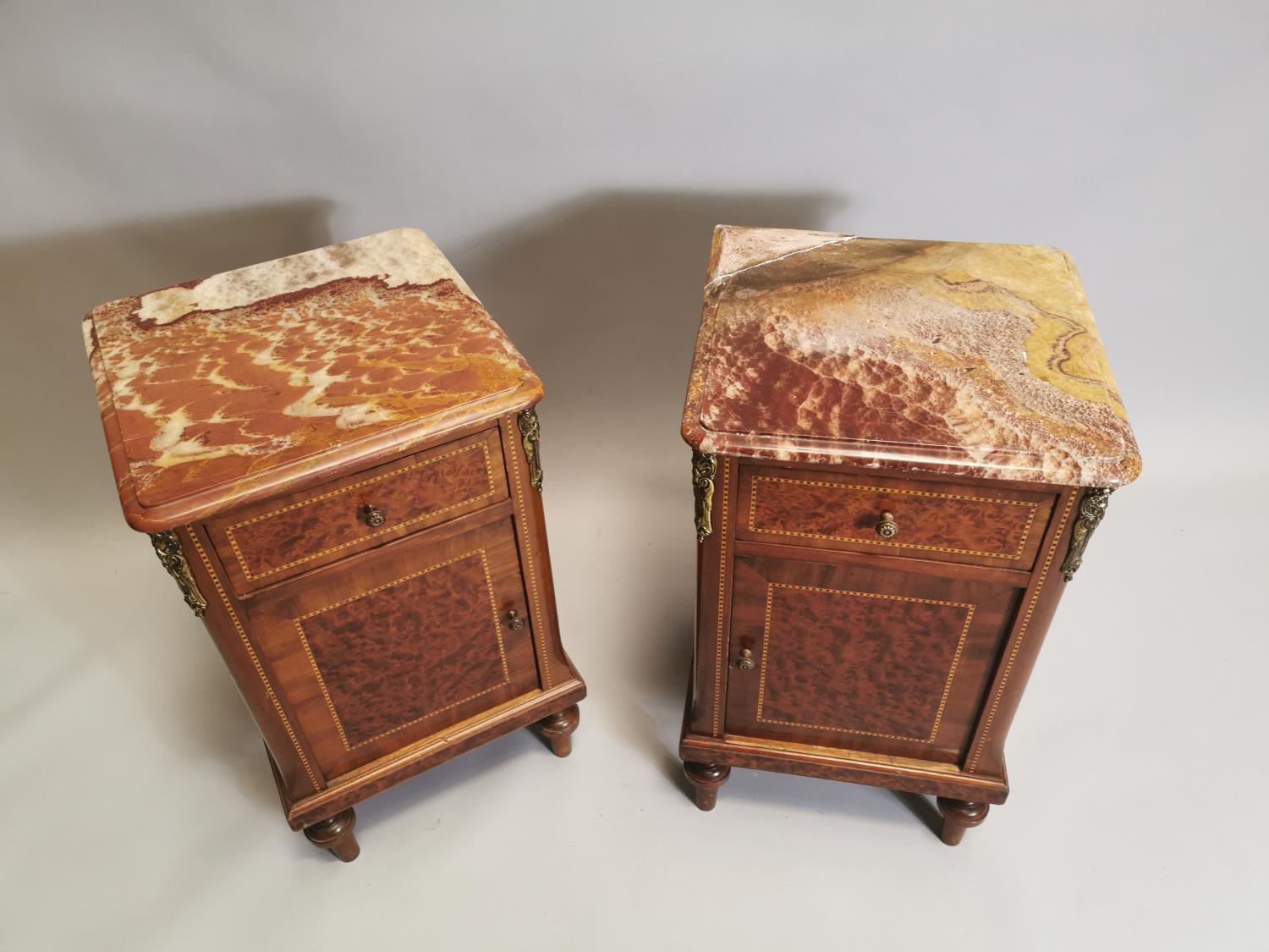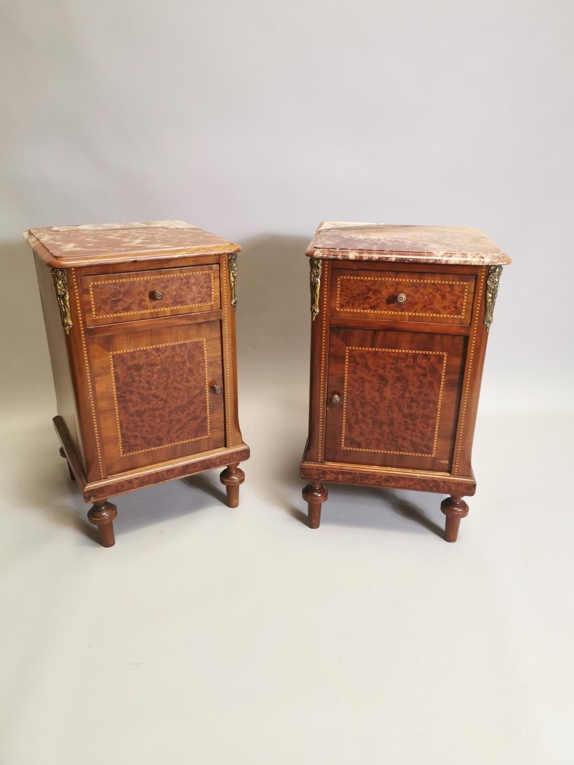 Pair of 19th. C. kingwood and burr walnut bedside lockers with brass mounts the marble tops above single drawers and single doors, raised on turned feet . { Each 70cm H X 41cm W X 44cm D }.