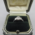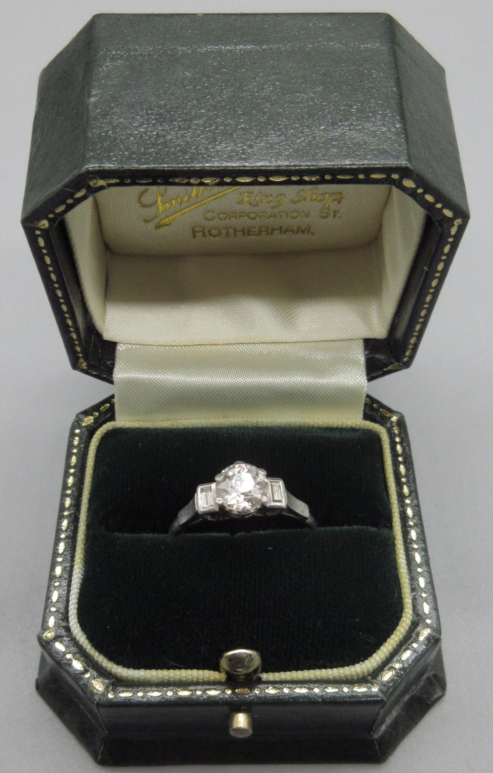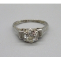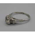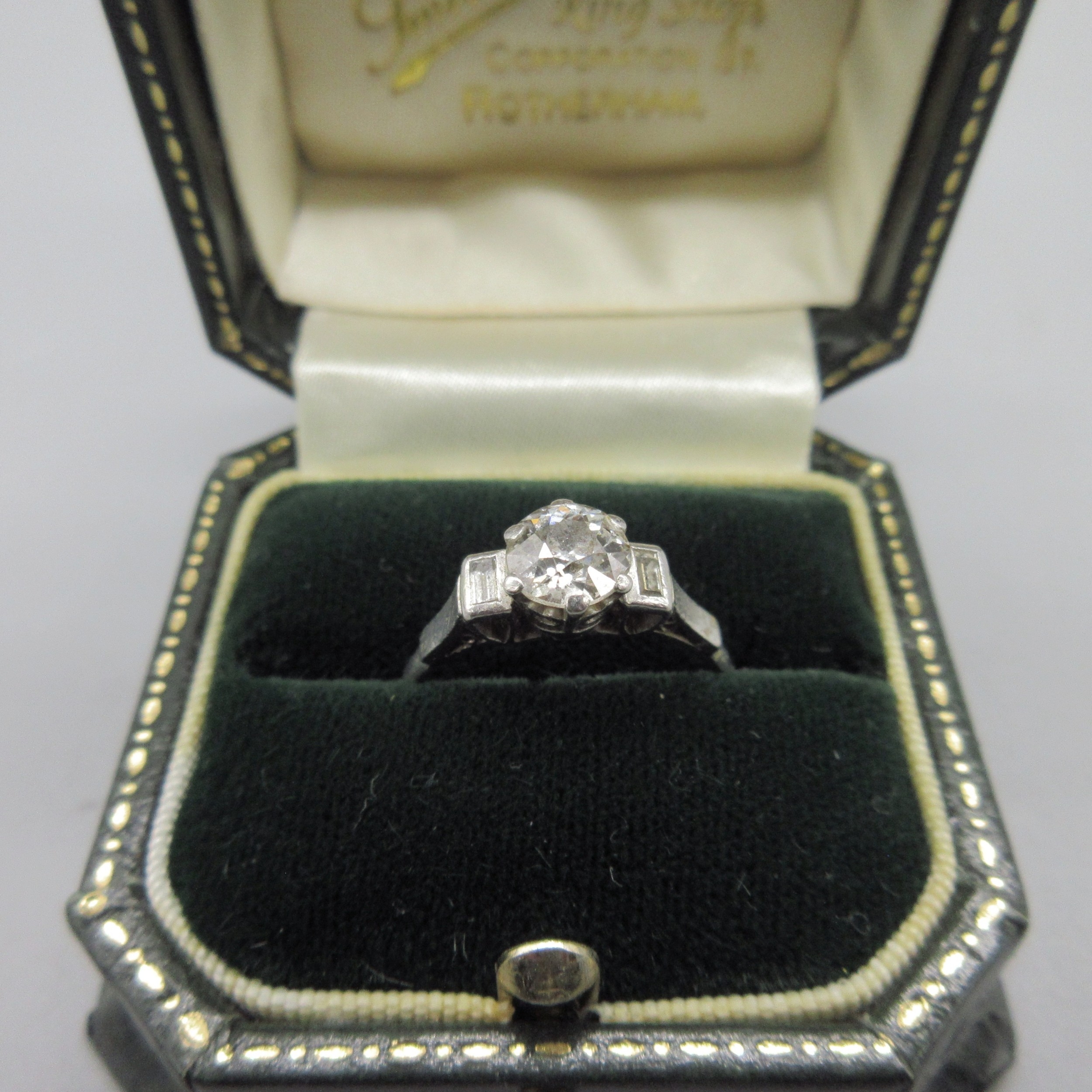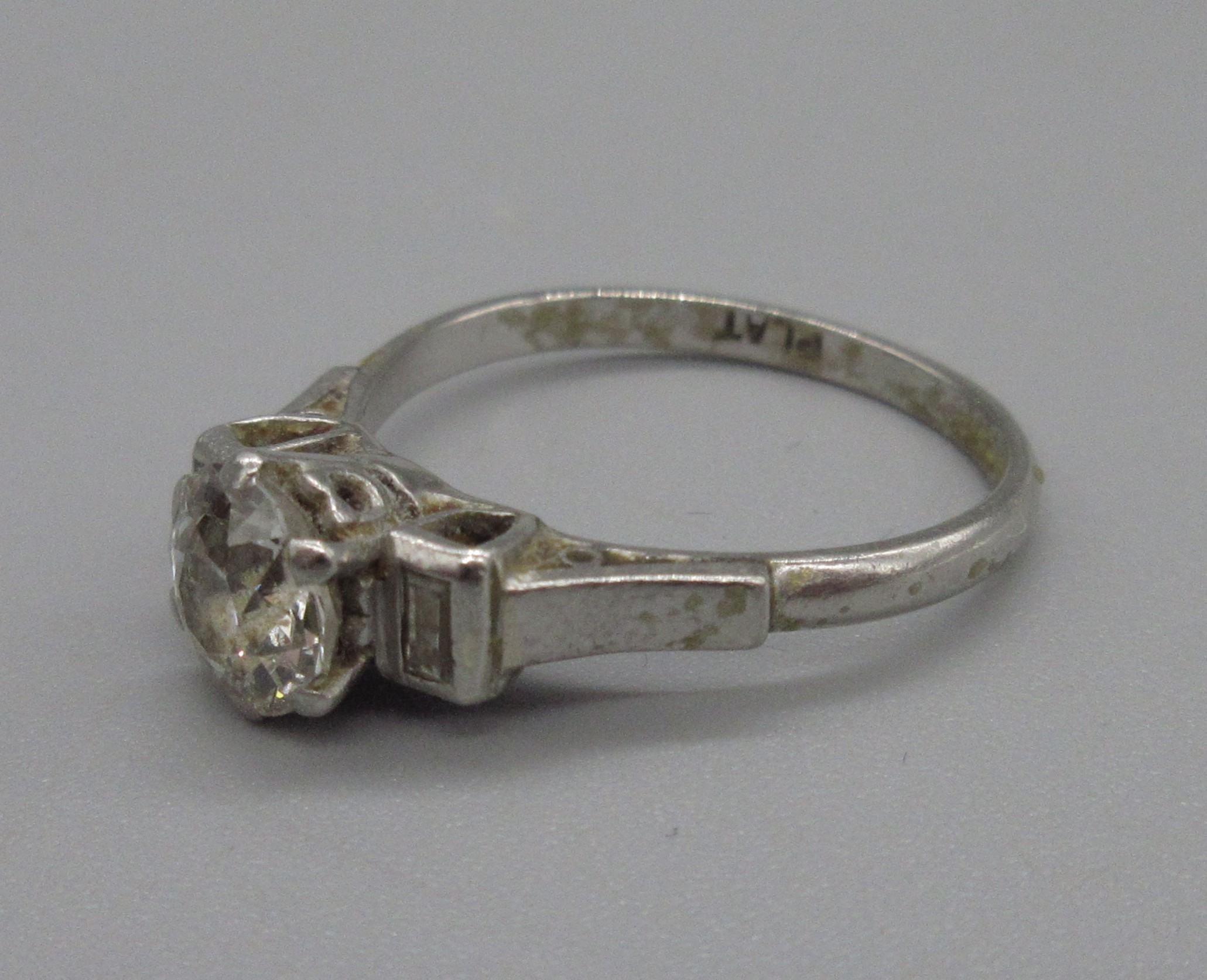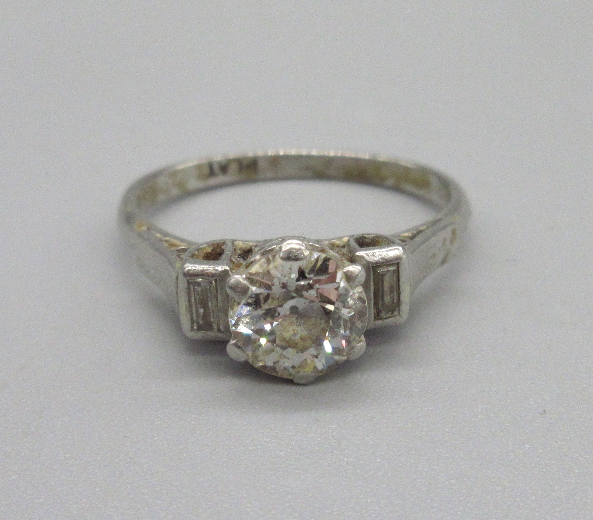 Platinum diamond ring, central old European cut diamond approximately 1 carat, flanked by baguette cut diamonds, stamped PLAT, size P