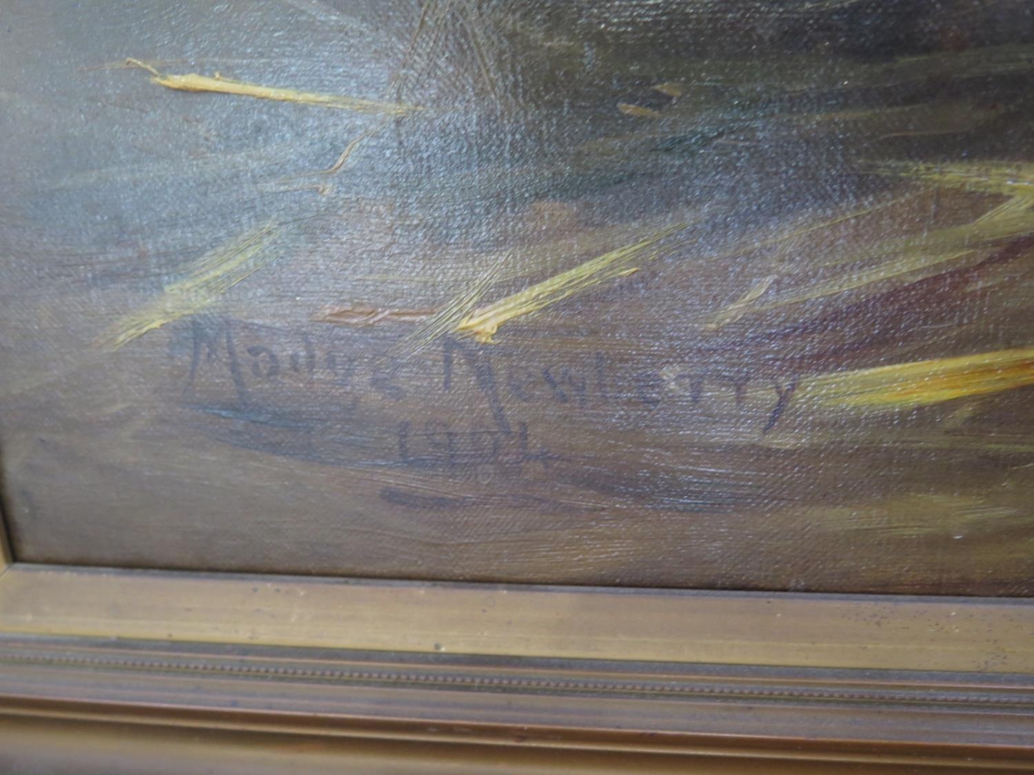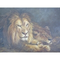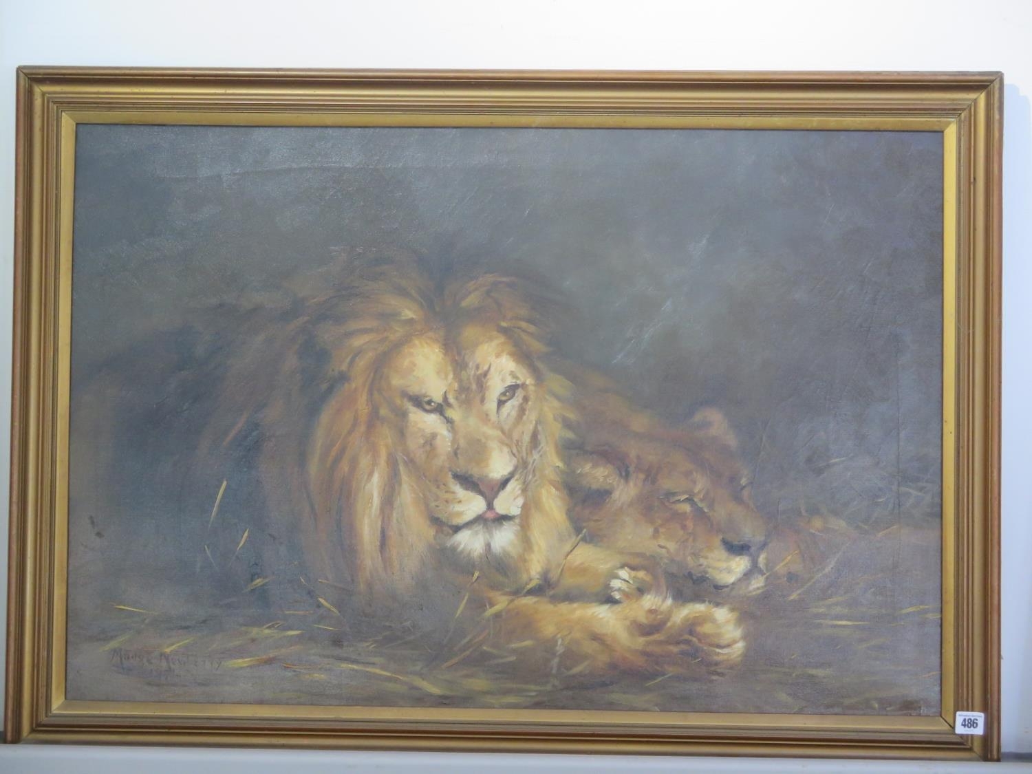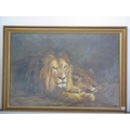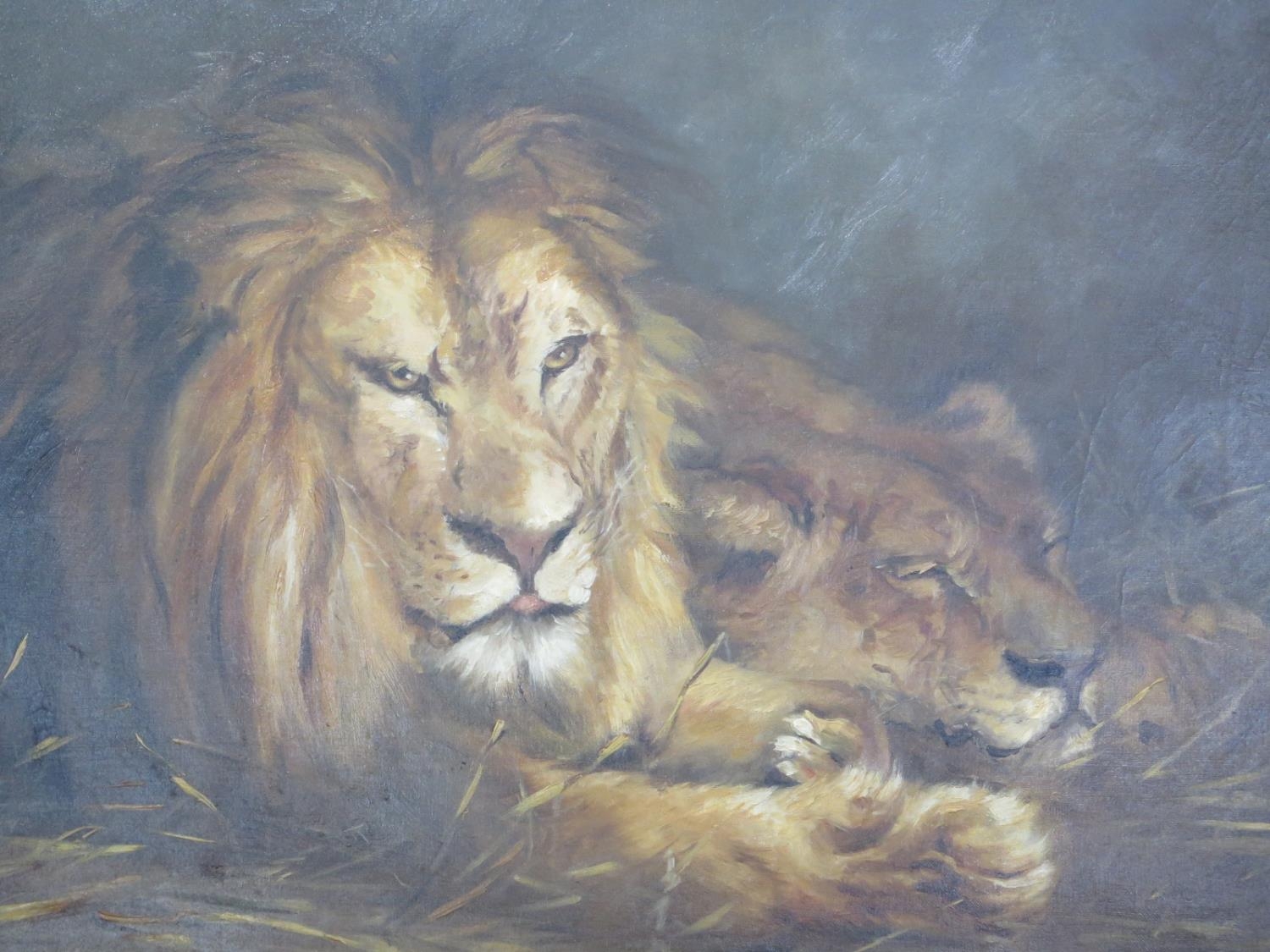 Oil on canvas lion and lioness, signed Madge Newberry 1904 - size 73cm x 102cm