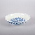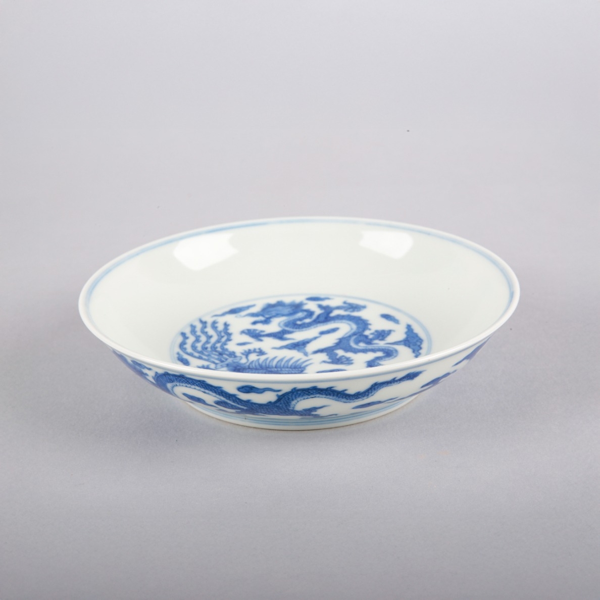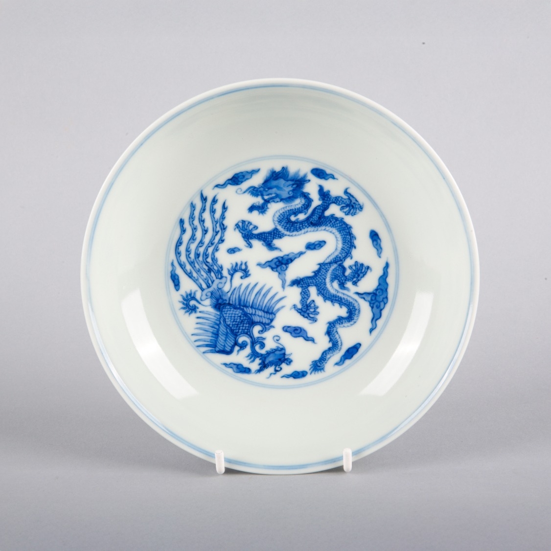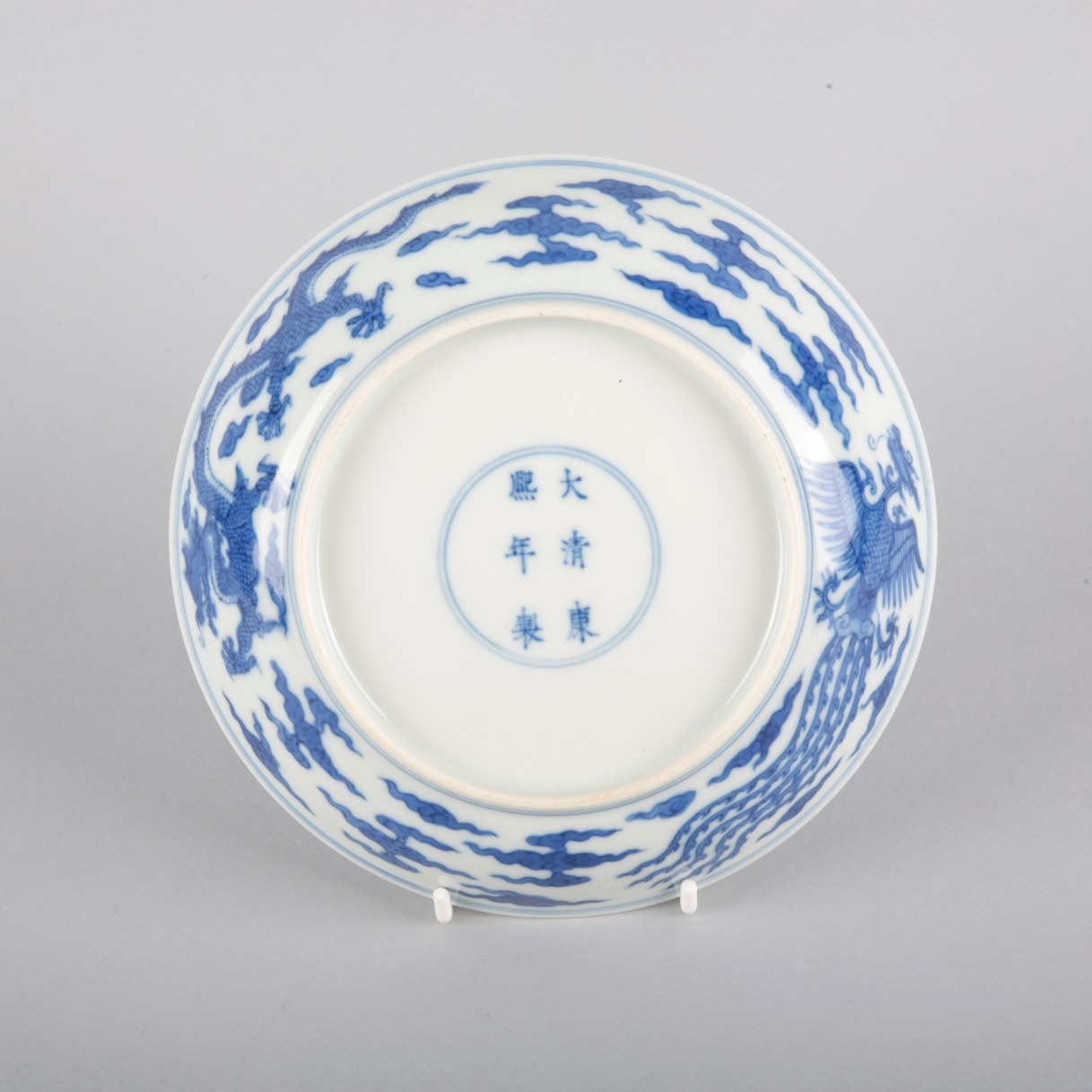A CHINESE PORCELAIN BLUE AND WHITE 'DRAGON AND PHOENIX' DISH