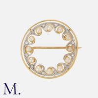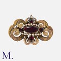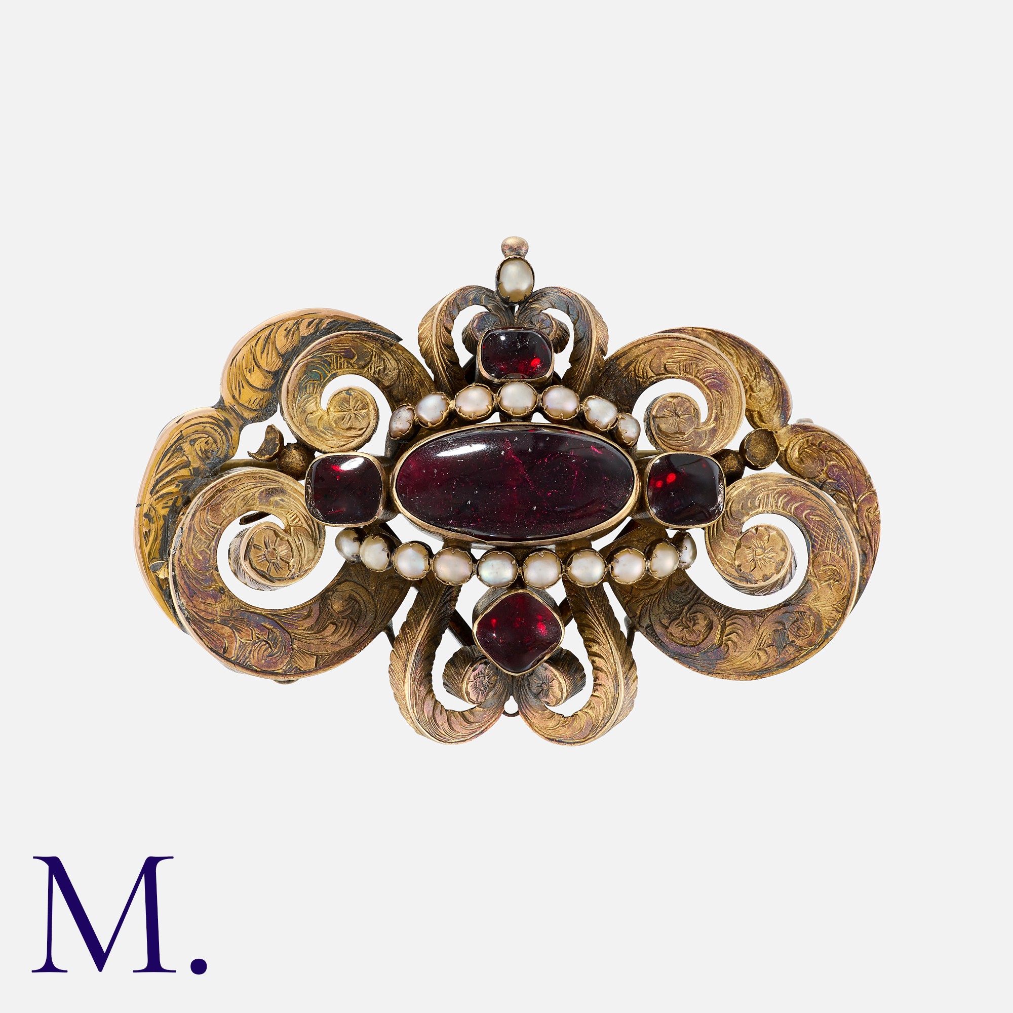 An Antique Garnet and Pearl Brooch in yellow gold, set with cabochon garnets and pearls with ornate engraved decoration. Unmarked, tests indicate 9 carat gold.