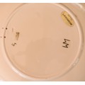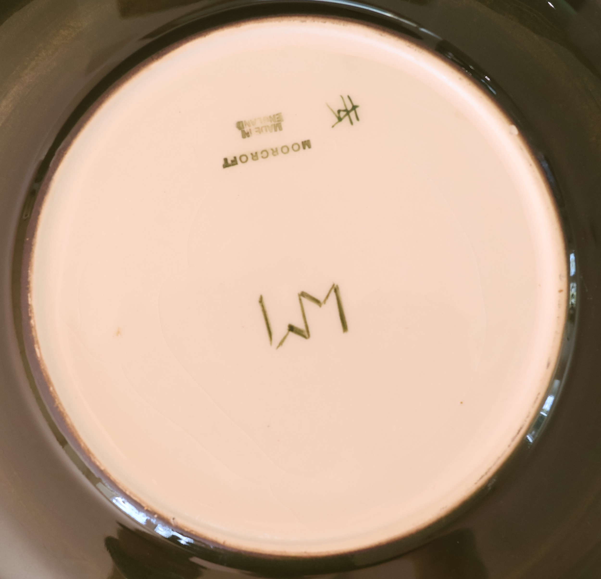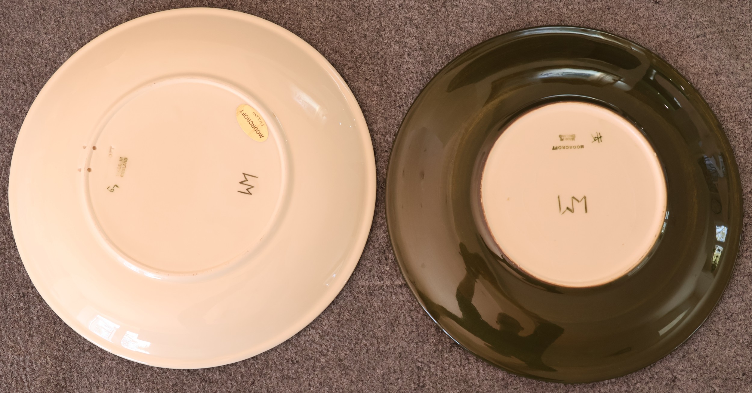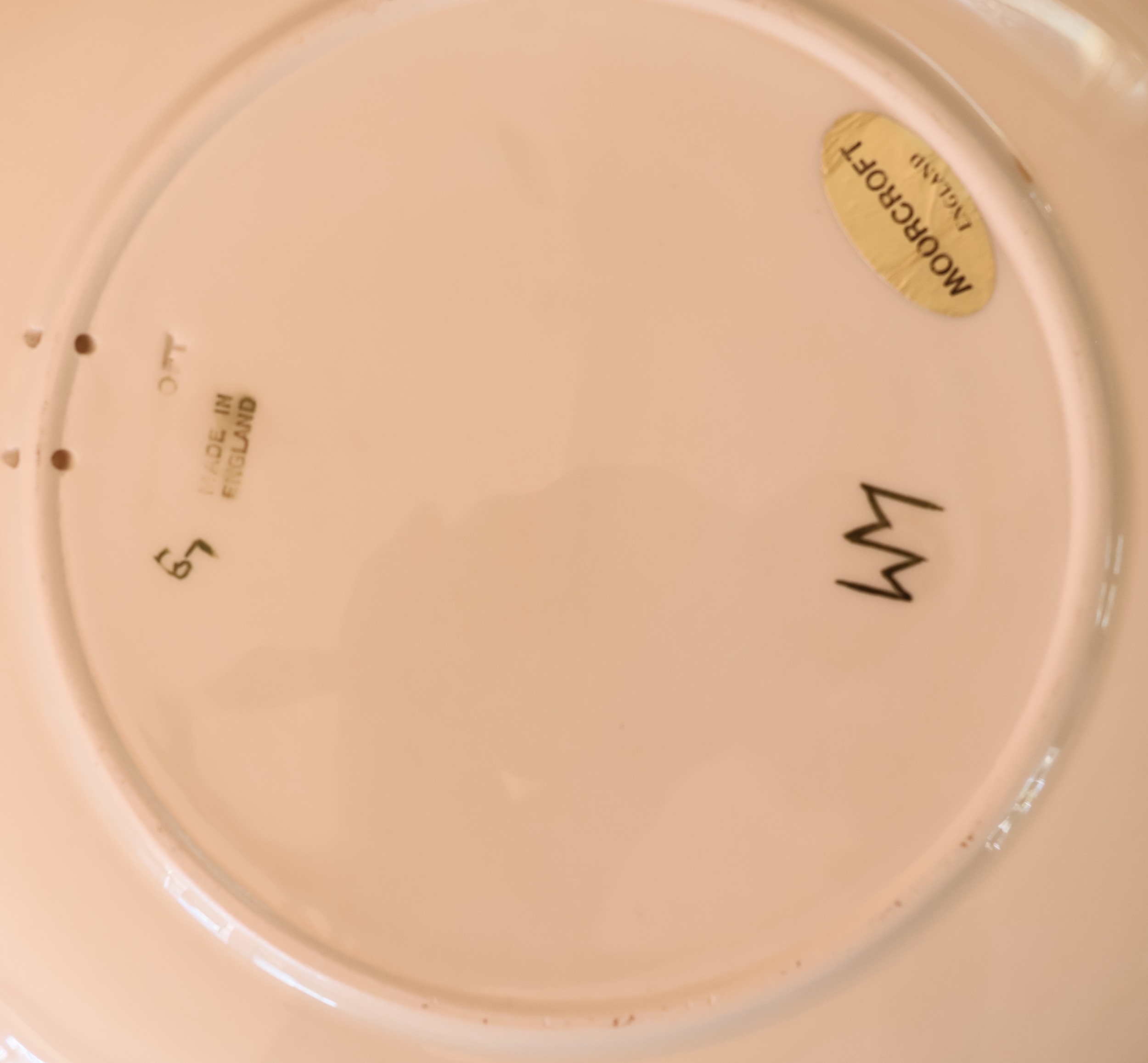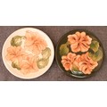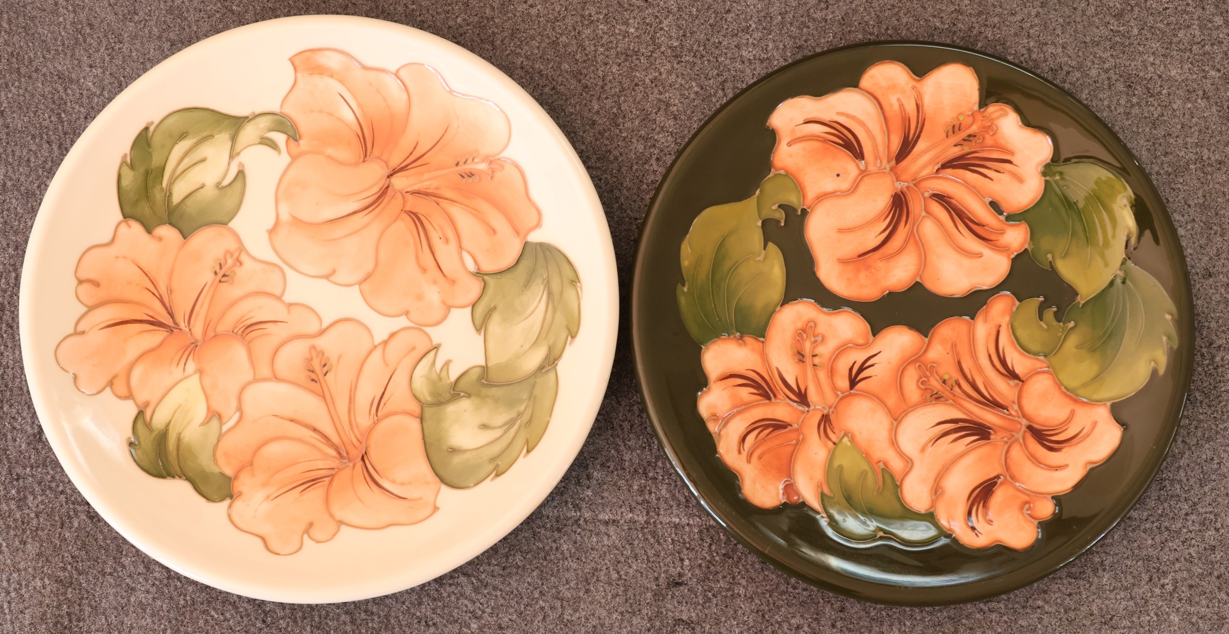 2 Moorcroft round plates on cream and green ground with coloured floral and leaf decoration, 26.5cm diameter (2)