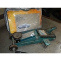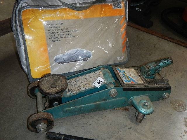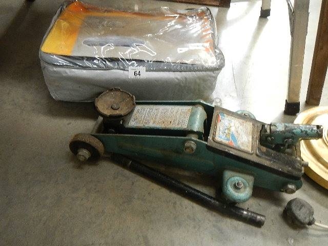 An old car jack and a car blanket.