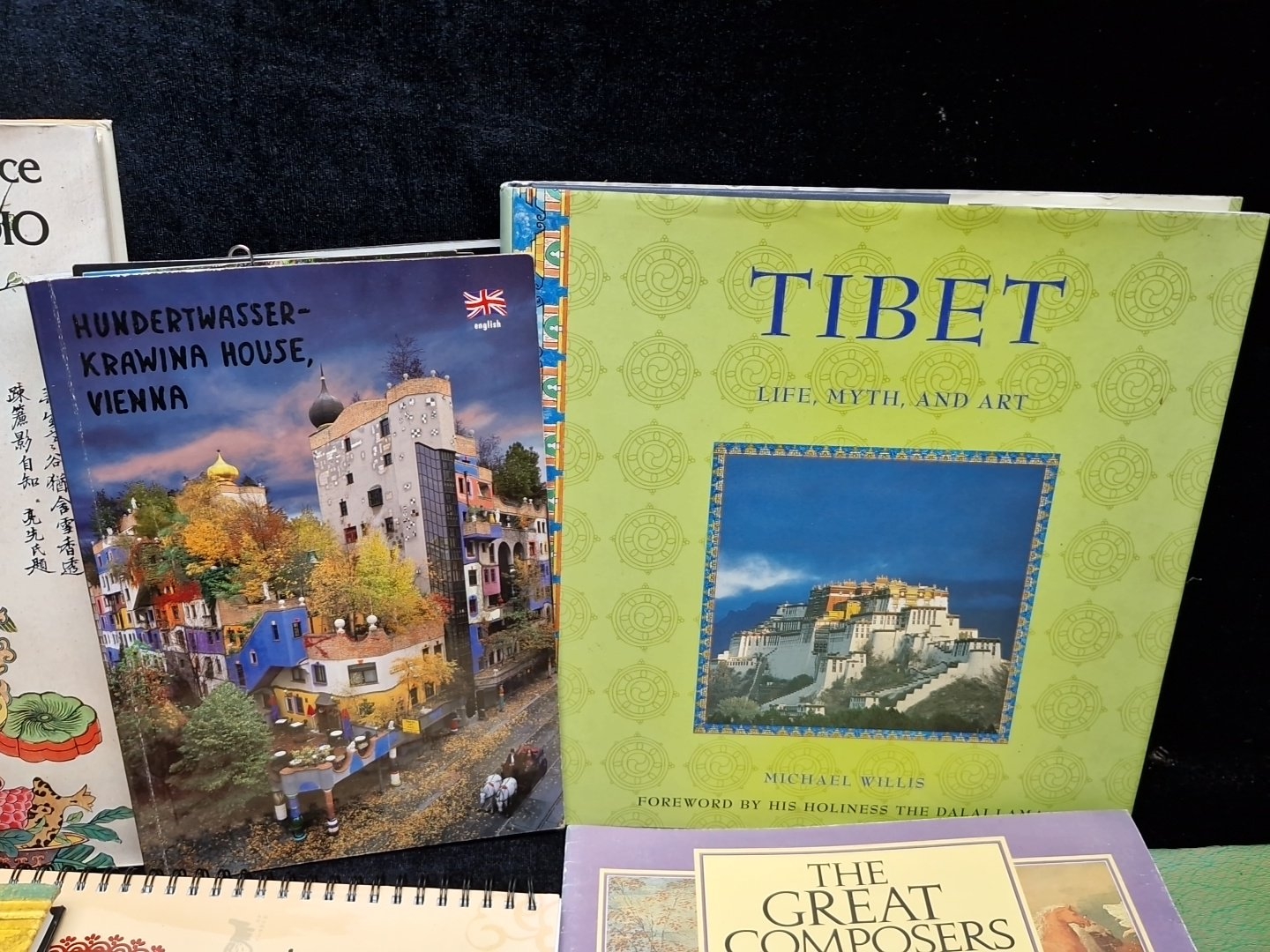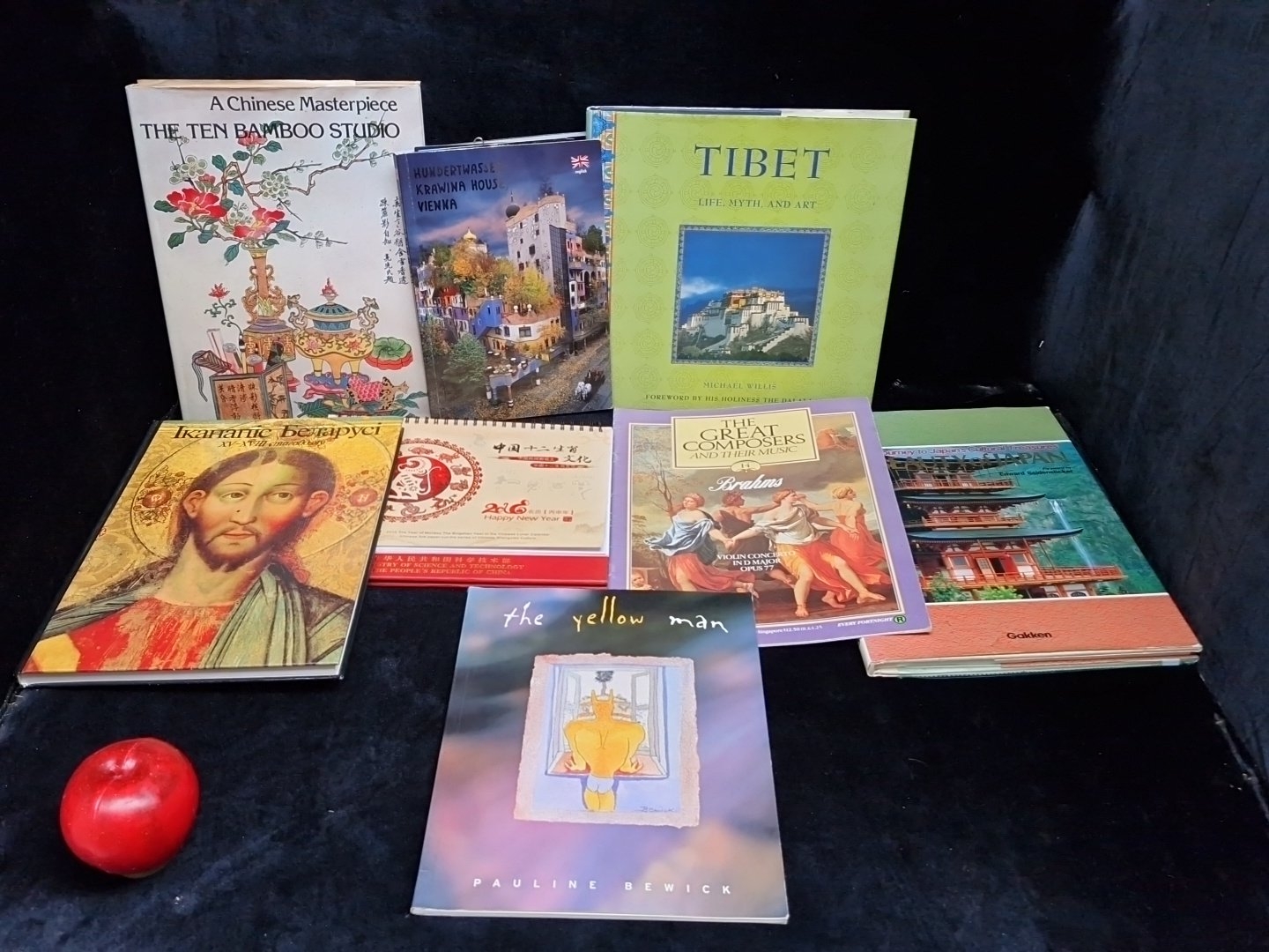 A group of illustrated books and publications, including 'The Ten Bamboo Studio', 'Tibet: Life, Myth, and Art' by Michael Willis, Hundertwasser’s Krawina House, Vienna, Pauline Bewick’s 'The Yellow Man', and other art, travel and music titles.