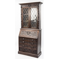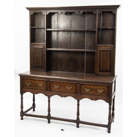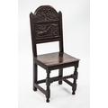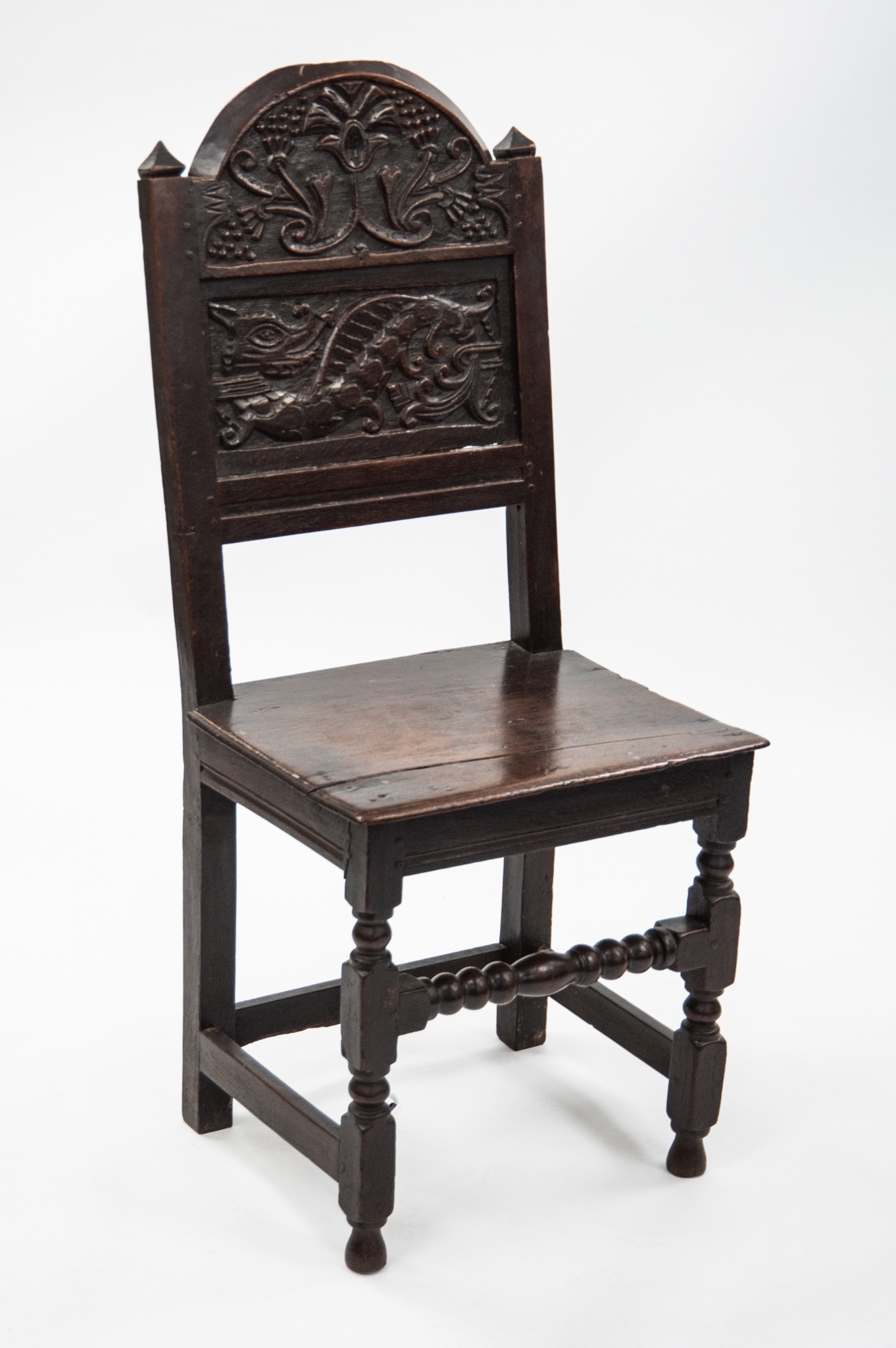 ANTIQUE CARVED OAK SINGLE CHAIR, the panelled back with arch top and carved with a dragon and stylised flowers and berries, set above a solid seat with moulded edge, and raised on block and turned front legs tied by a conforming stretcher, 43 ½” (110.5cm) high, piece missing to the centre of the top rail