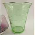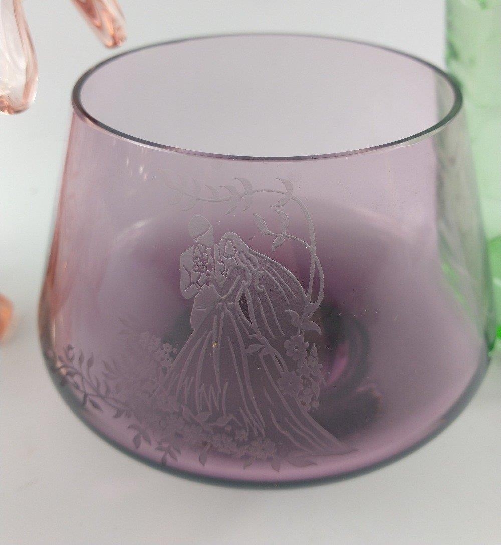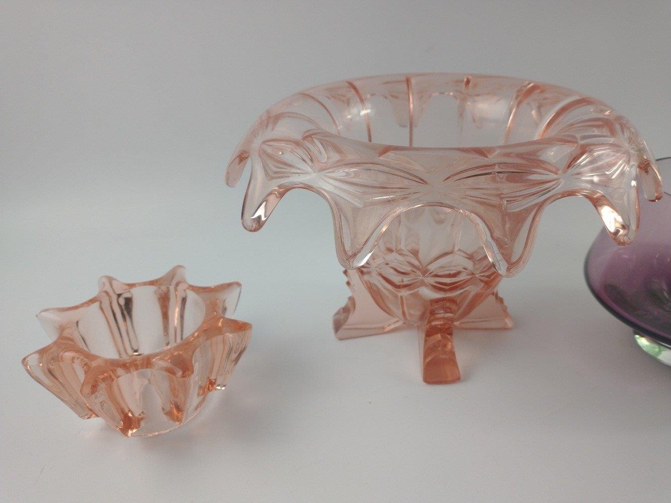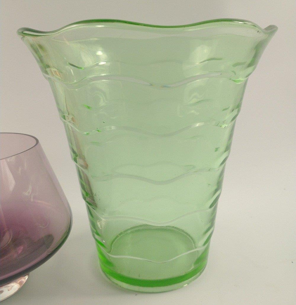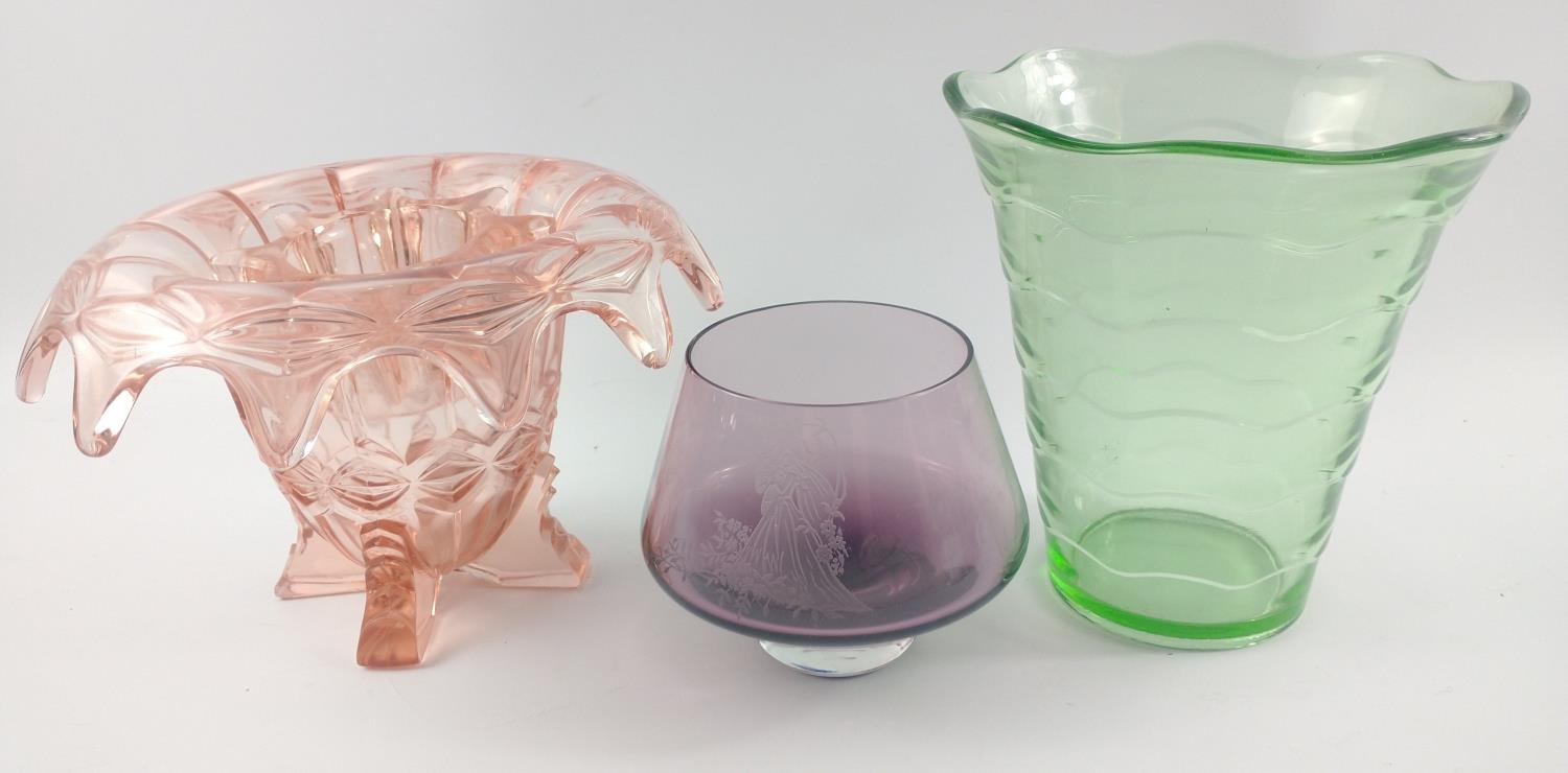 Vintage coloured glassware to include a peach-coloured pressed glass vase with insert - unusual and a Caithness-style wedding brandy bowl.