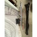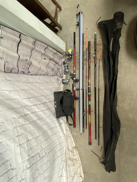 2 x Mitchell 4.8 m (15.7ft) Beach-caster fishing rods with tripod rest, 2 x Multiplier and 1 x open face reel