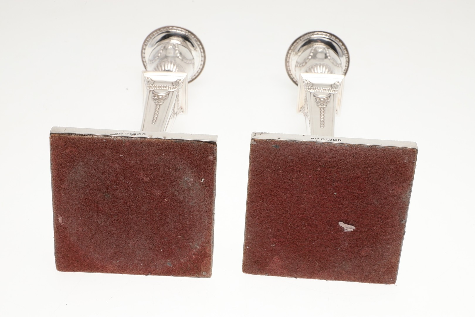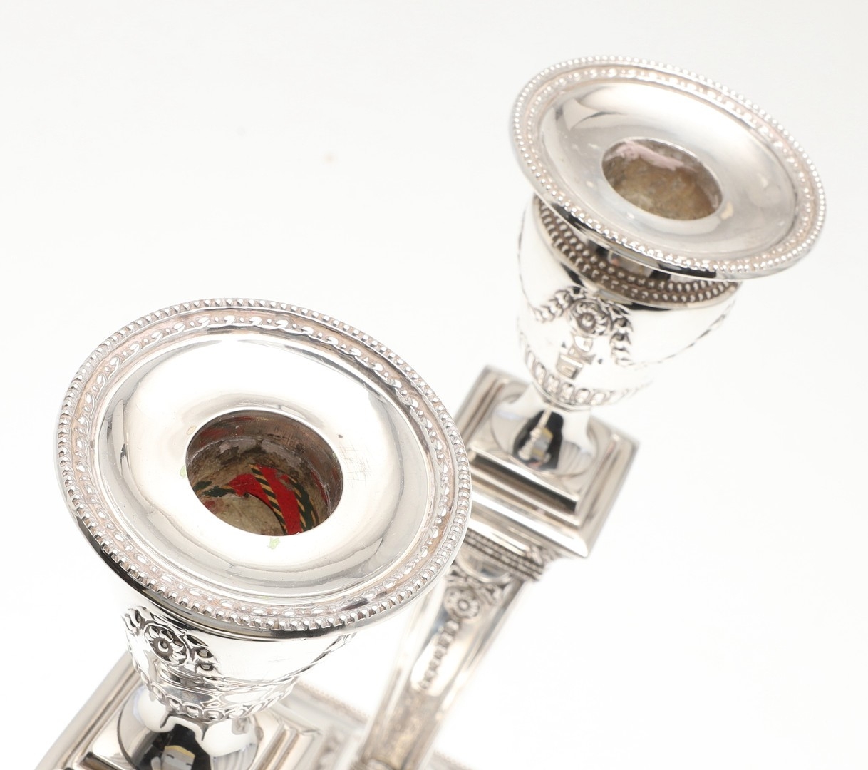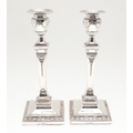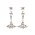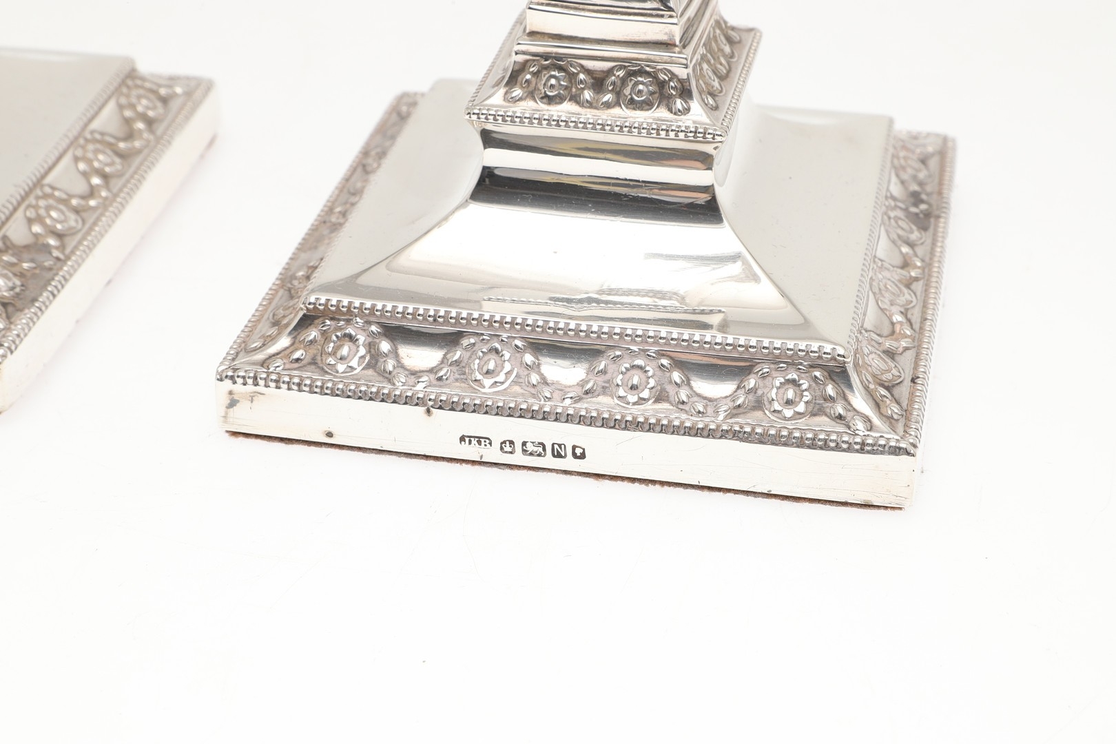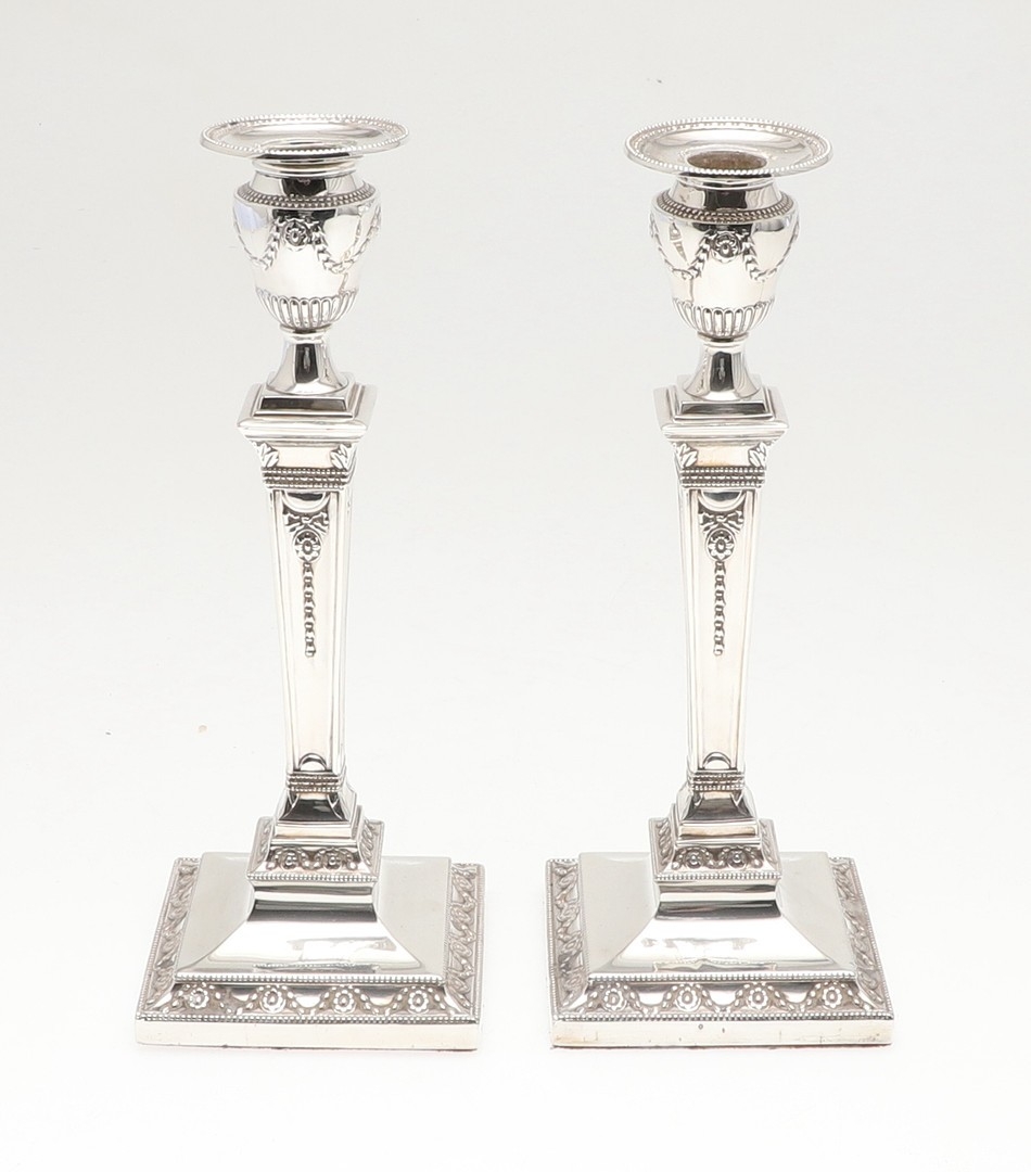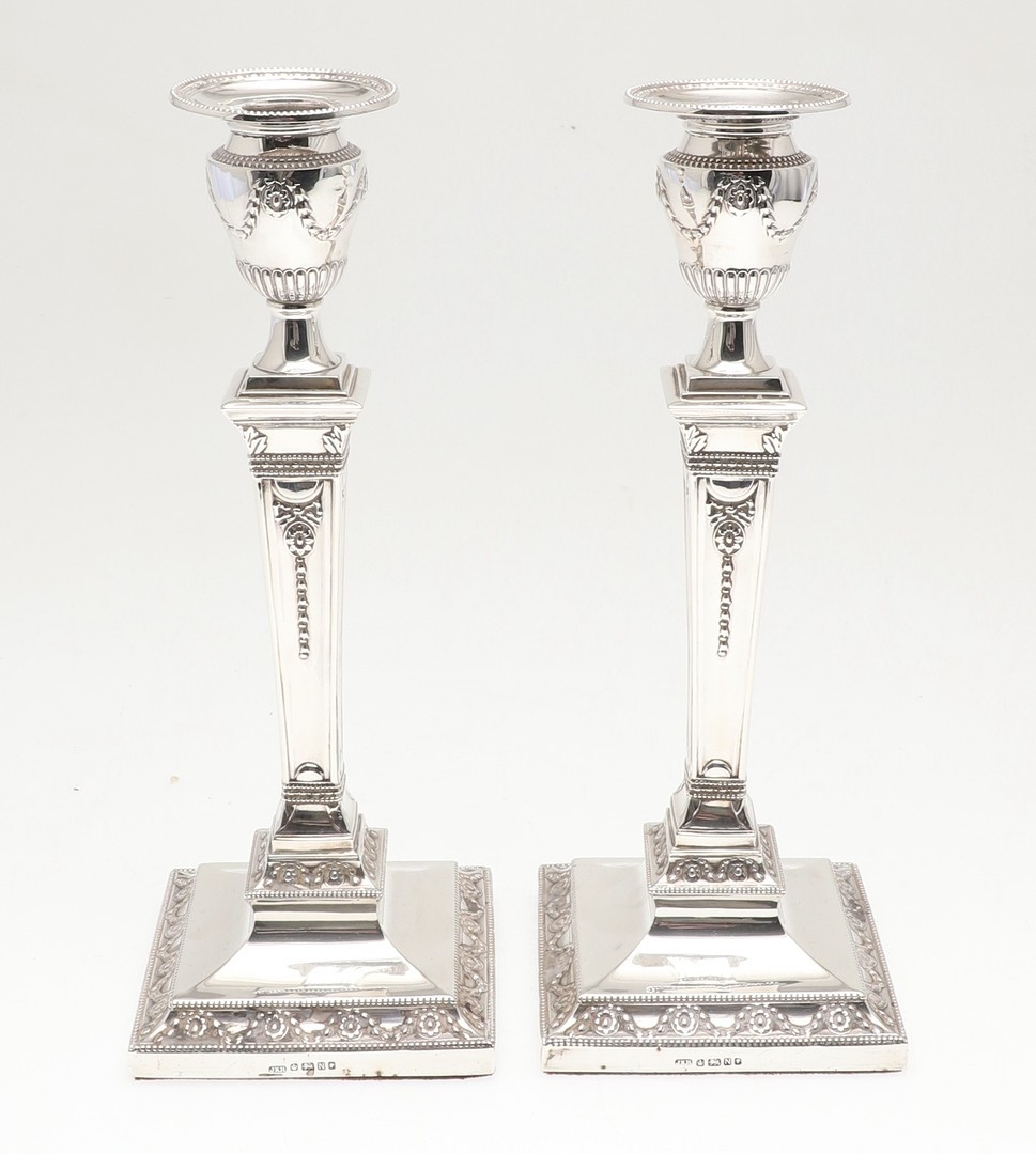 A PAIR OF VICTORIAN SILVER CANDLESTICKS. Each candlestick with a beaded circular sconce, urn shaped capitals with swag decoration, and a tapering stem with square base, also with a swag decorated border. Height 28cm x Base Width 11cm. Hallmarked Hawksworth, Eyre & Co Ltd, Sheffield, 1880. Total weight of both candlesticks approximately 52.1ozt. (2).