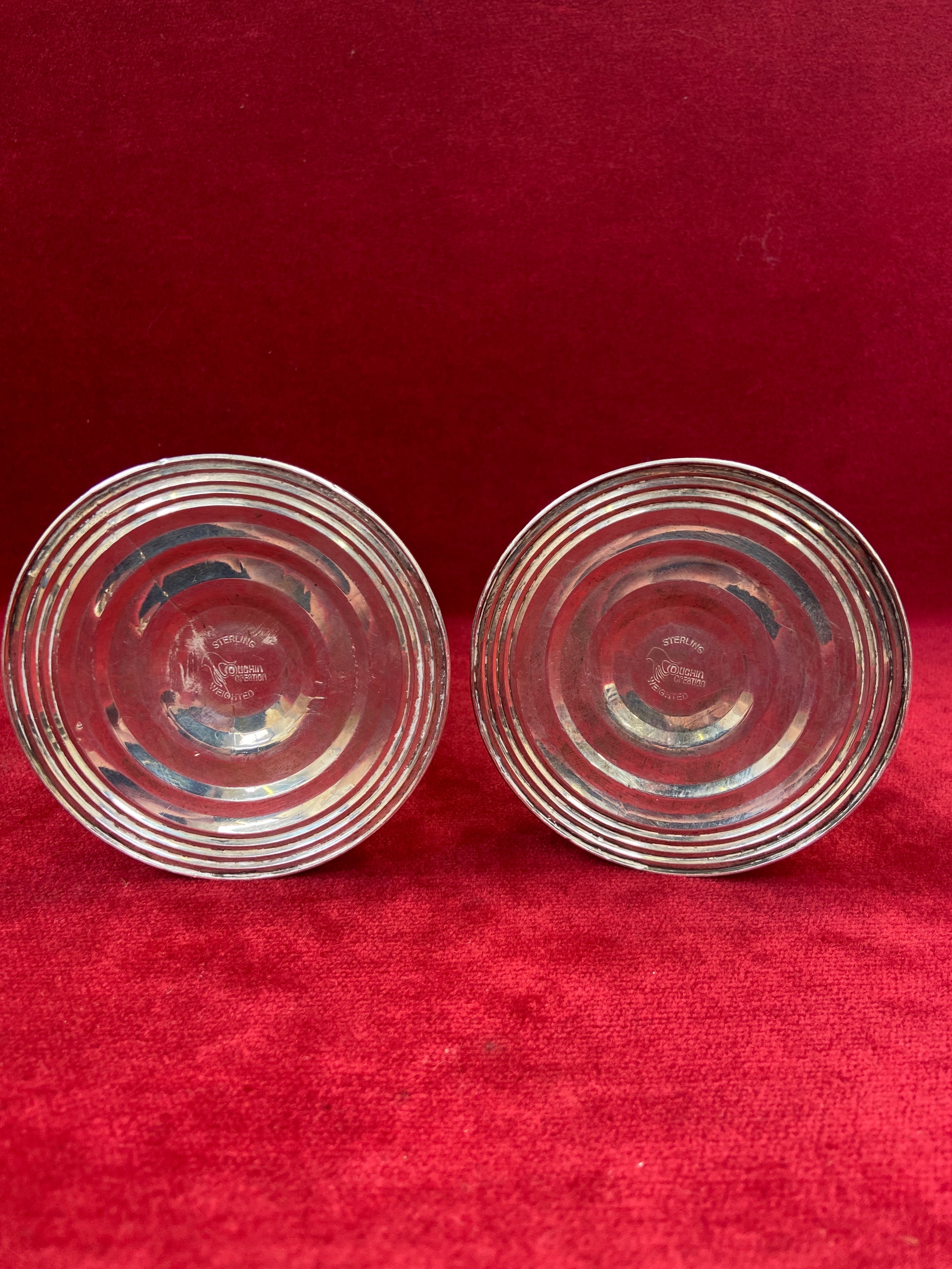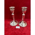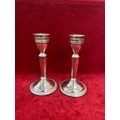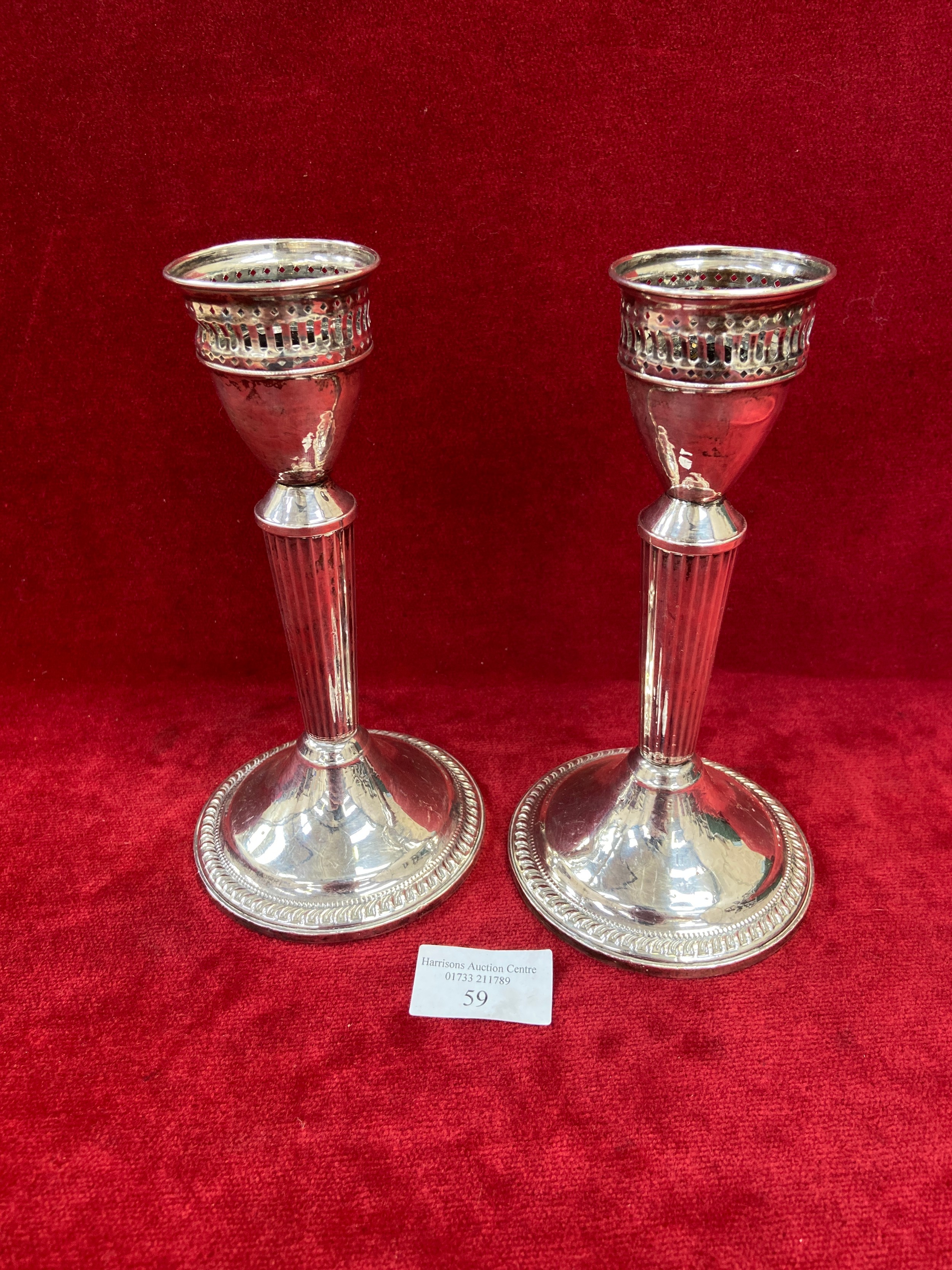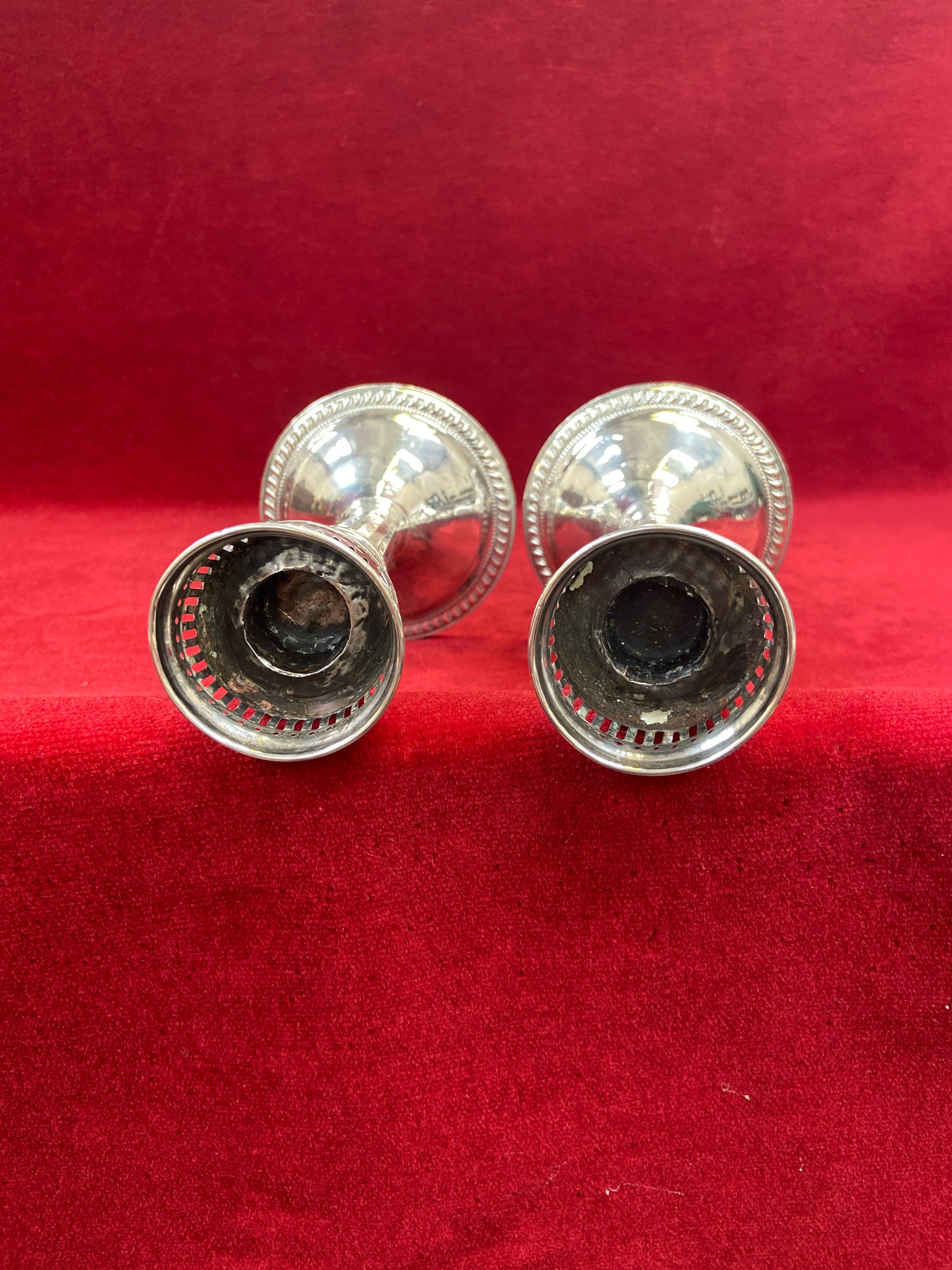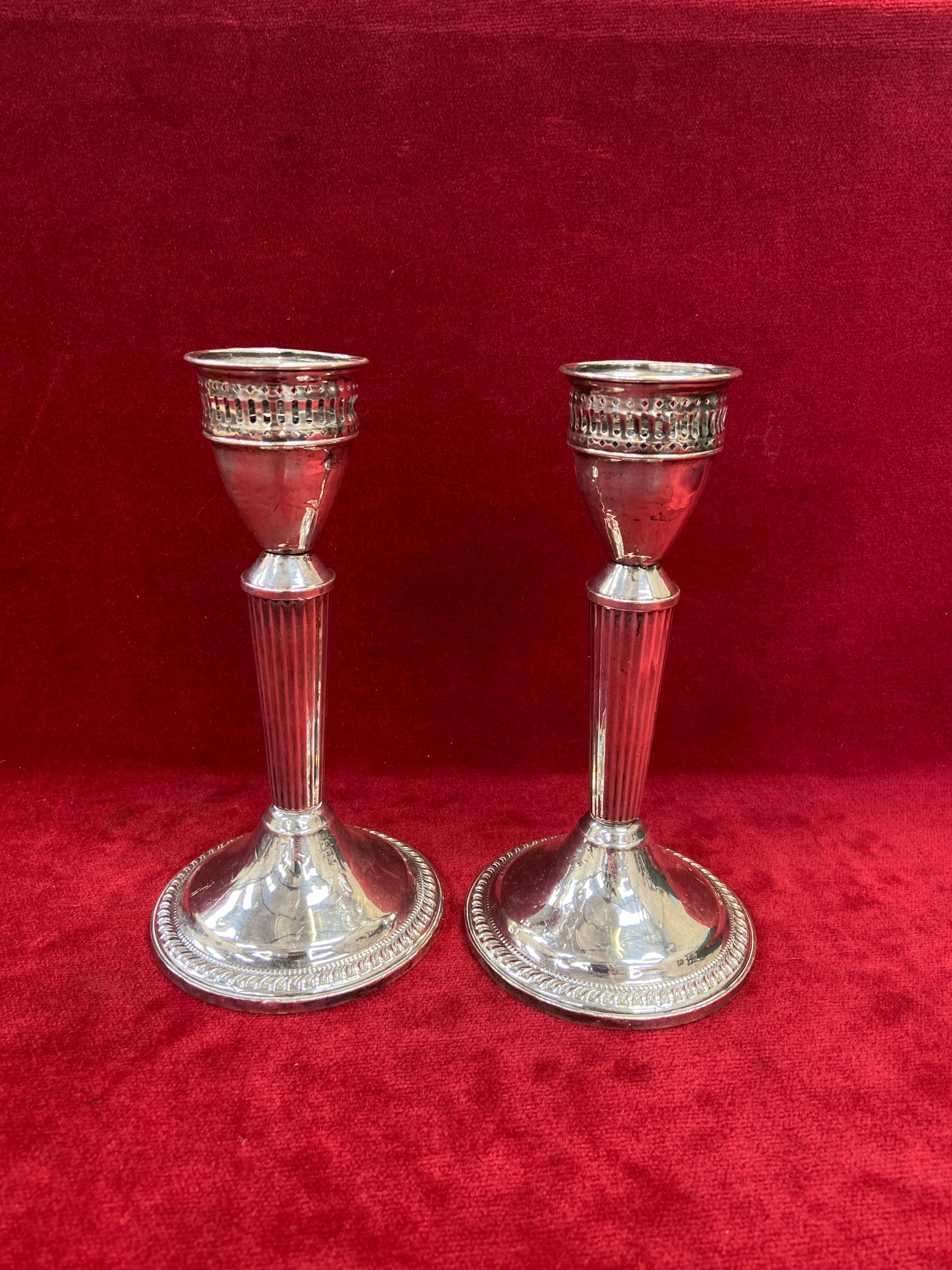 Pair of mid 20th Century American sterling silver candlesticks by the Duchin Silver Company of New York. Pierced sconces and gadrooned detail to the bases. 19cm. Total weight 482 grams