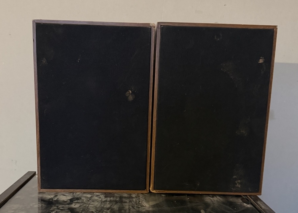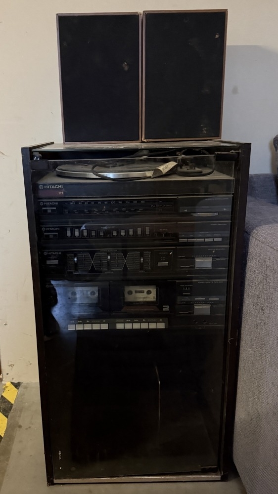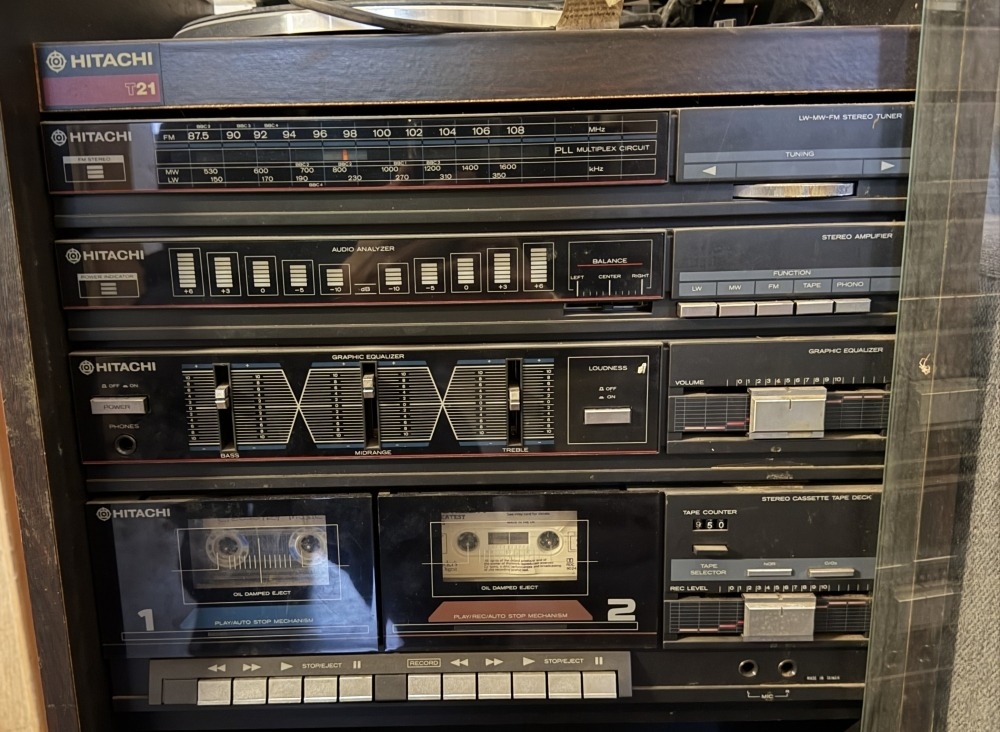 A Hitachi T21 Hi-Fi stack system in cabinet with a pair of speakers