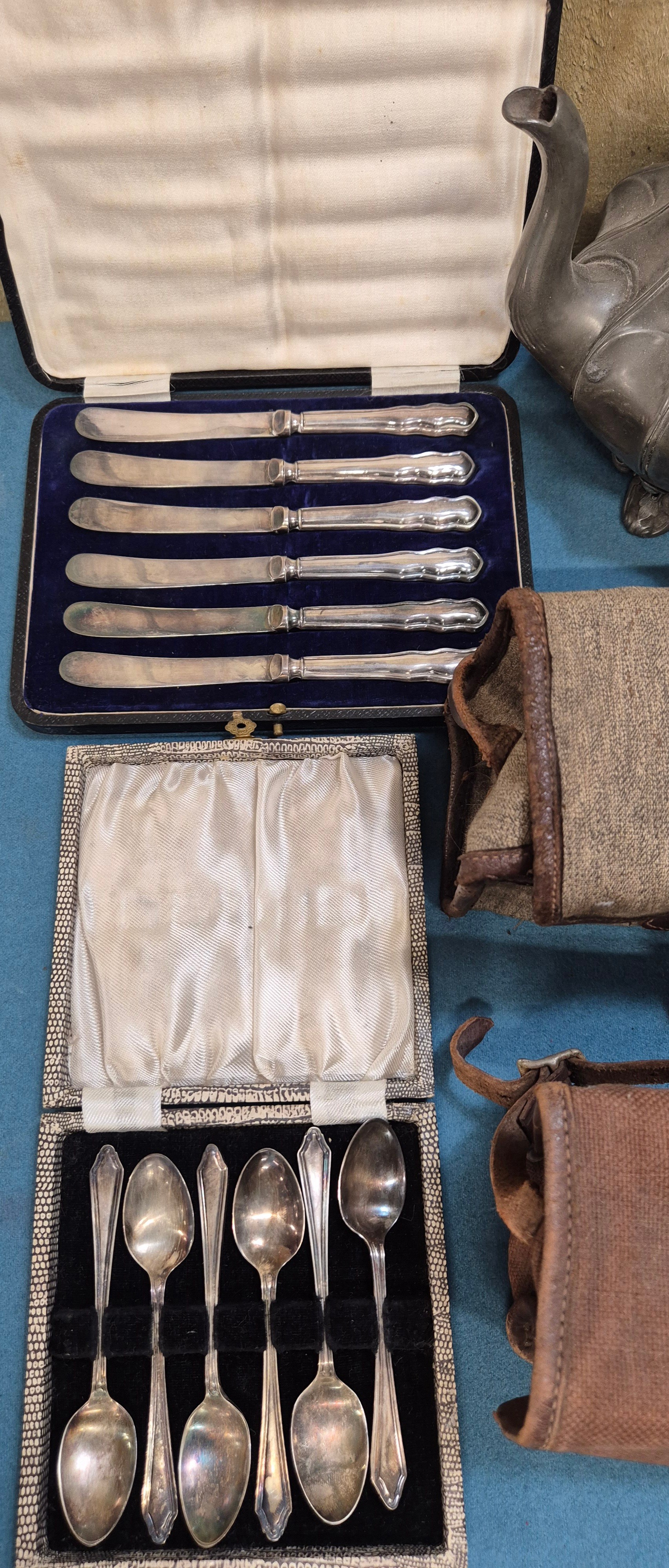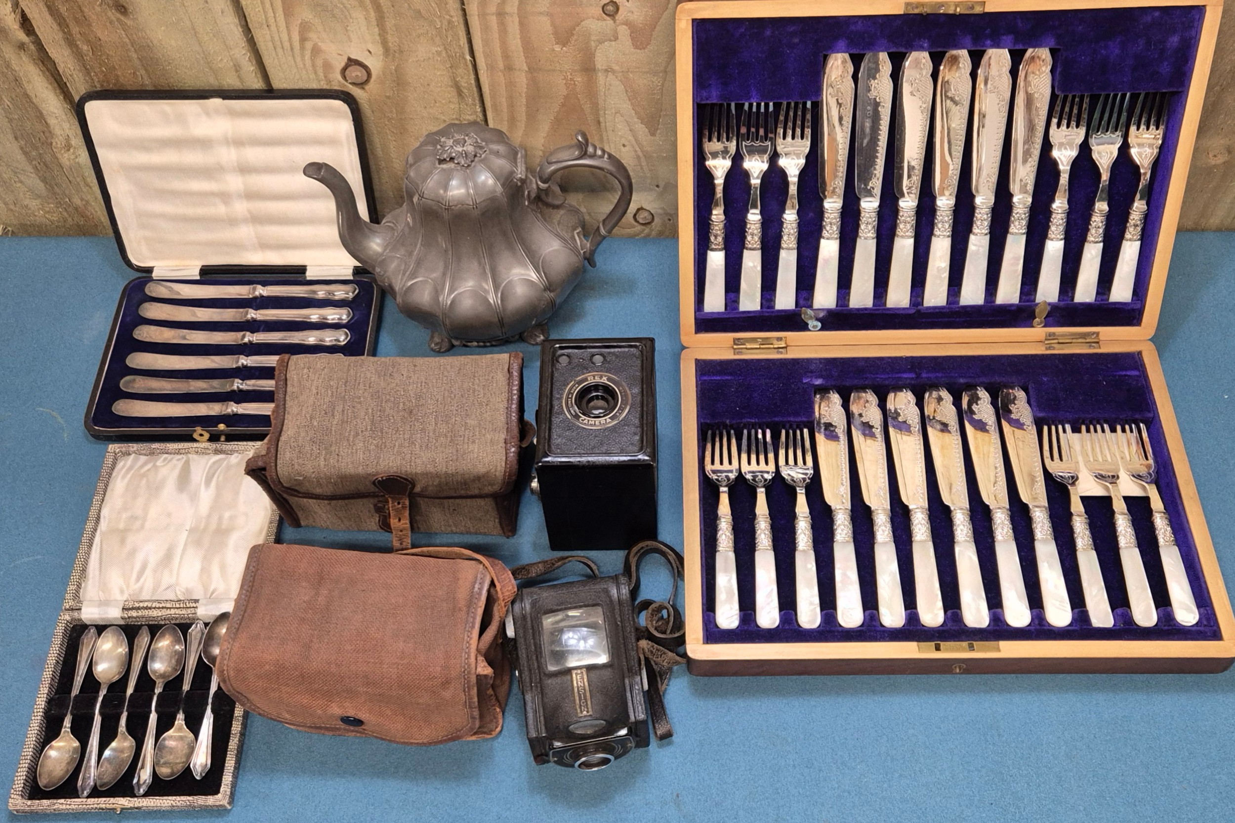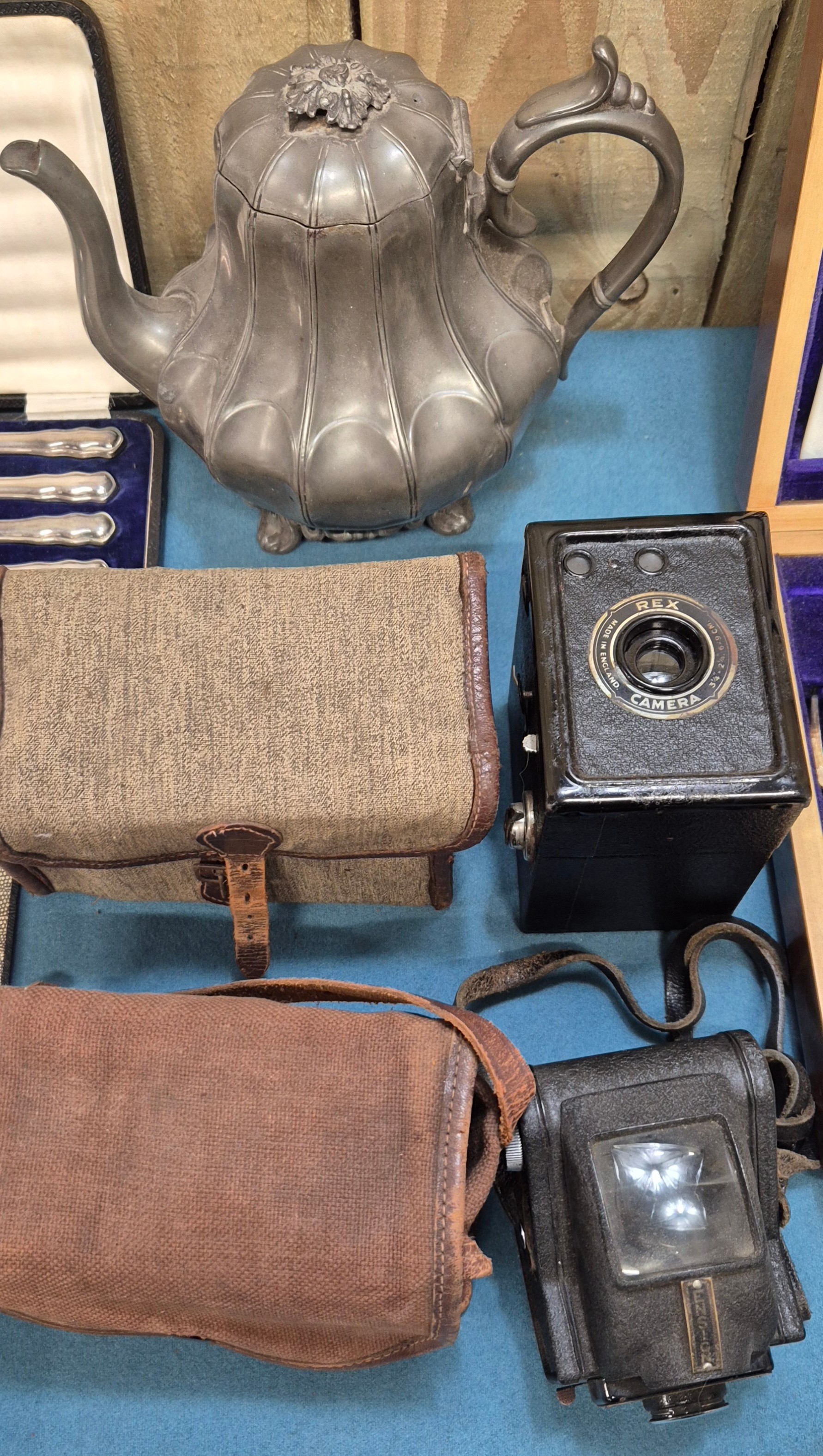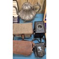Selection of collectables; boxed silver plated cutlery, pewter tea pot, Ensign Ful-Vue camera and Coronet Rex box camera.