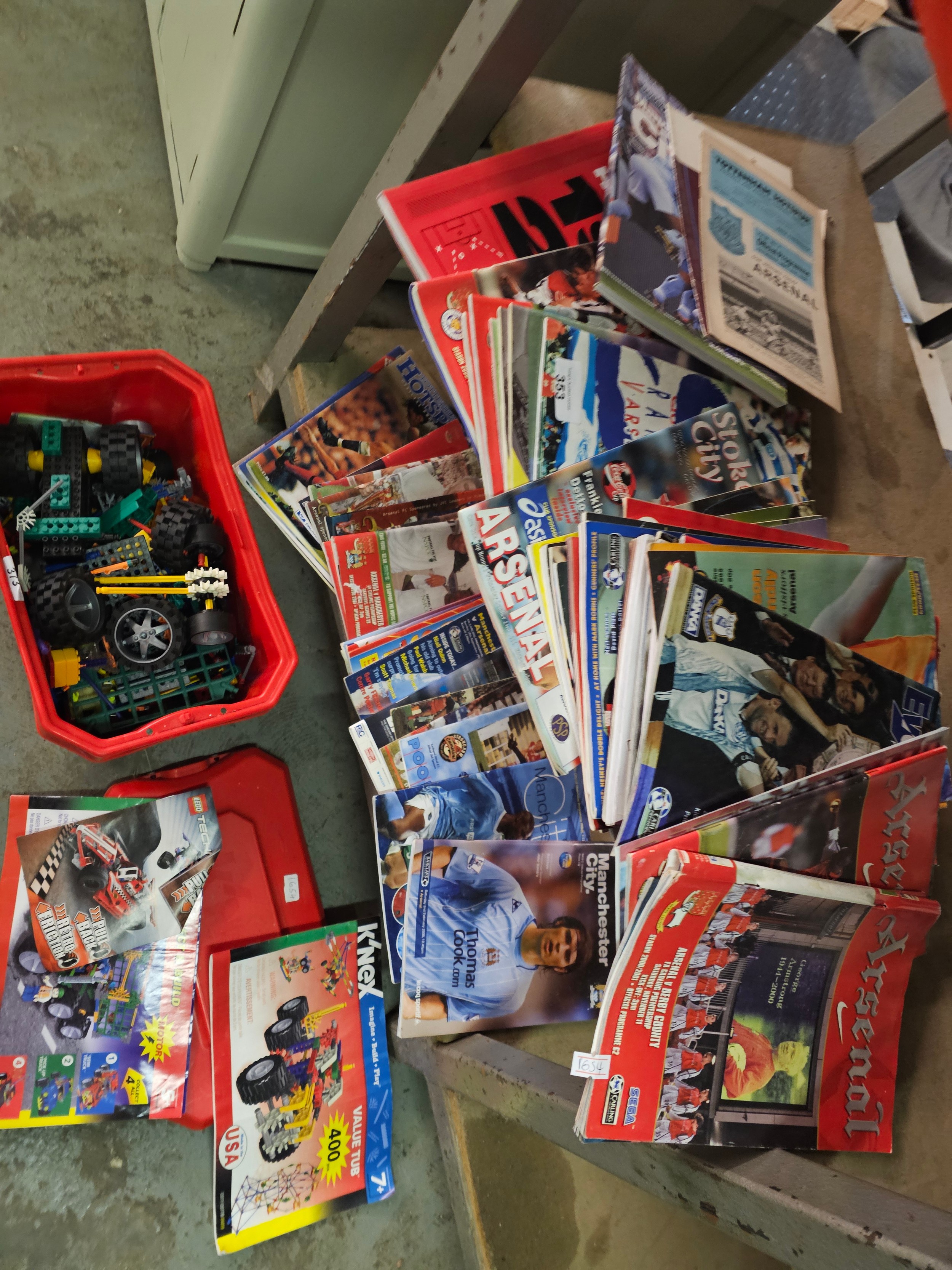 +363 LARGE TUB OF K'NEX AND VERY LARGE COLLECTION OF VARIOUS FOOTBALL TEAM PROGRAMMES TO INCLUDE ARSENAL, MANCHESTER CITY, Tottenham Hotspur F.C. , STOKE, EVERTON
