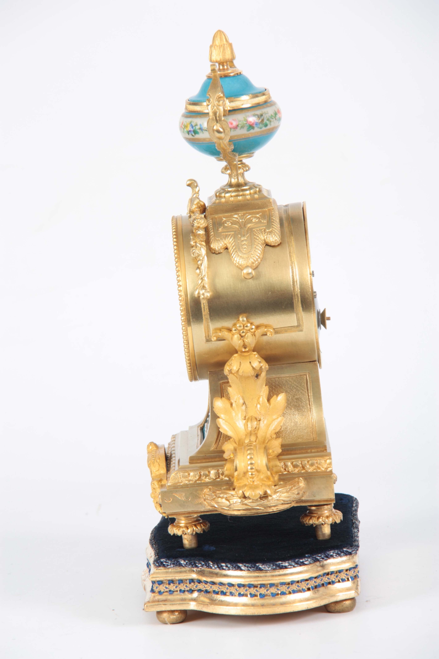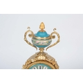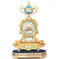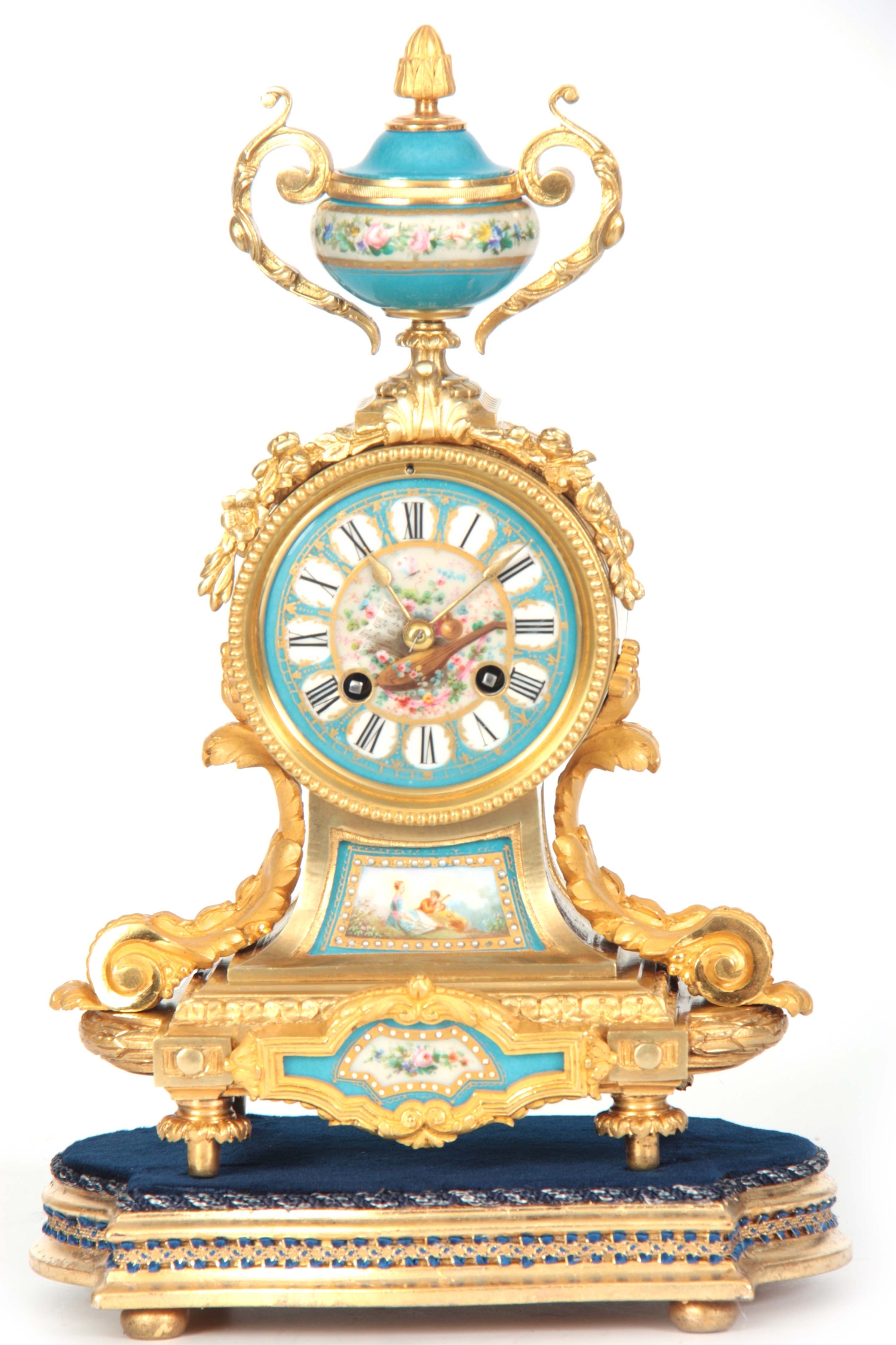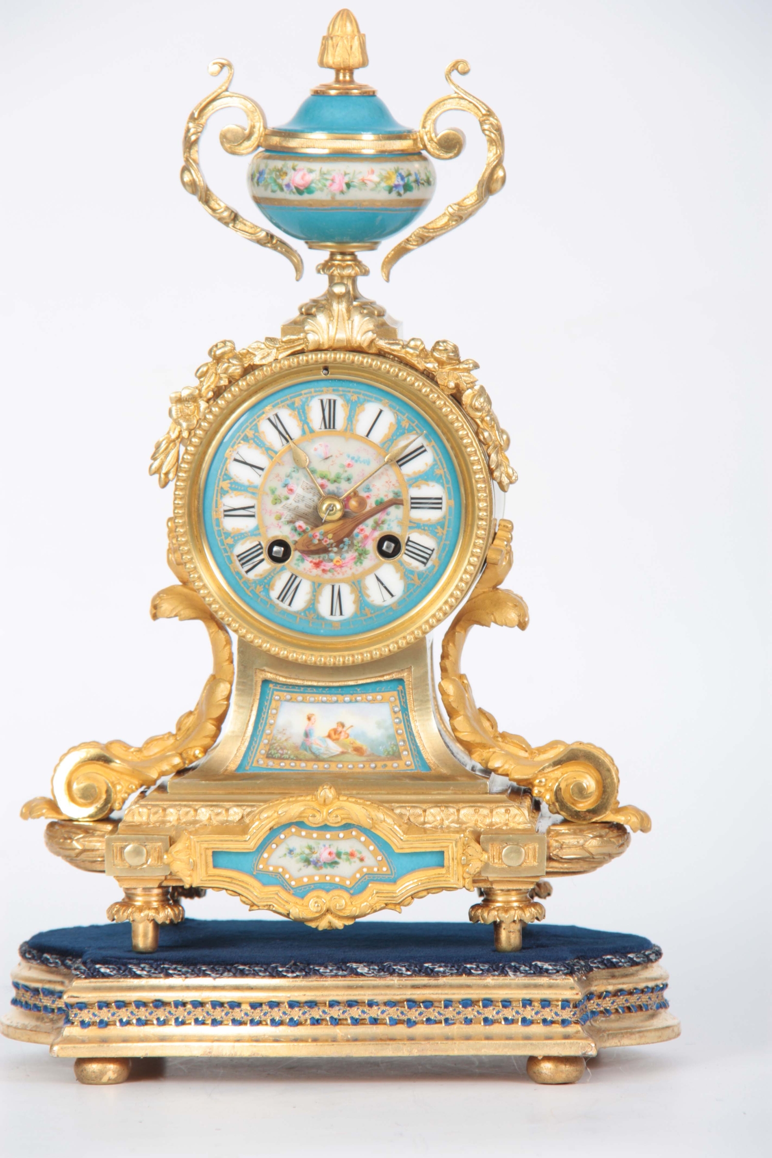A LATE 19TH CENTURY FRENCH ORMOLU AND PORCELAIN PANELLED MANTEL CLOCK the case surmounted by a floral porcelain urn above an ormolu case with acanthus leaf mounts inset with porcelain painted panels decorated with romantic scenes, the matching 3.5" dial with Roman numerals fronting an eight-day spring driven movement with anchor escapement striking the hours/half hours on a bell, raised on a gilt and velvet lined plinth 35.5cm high