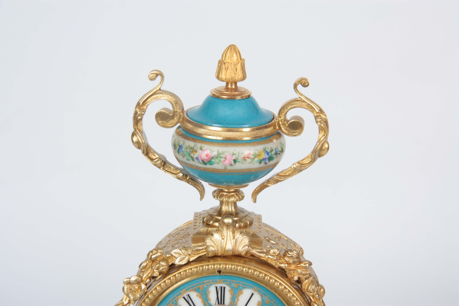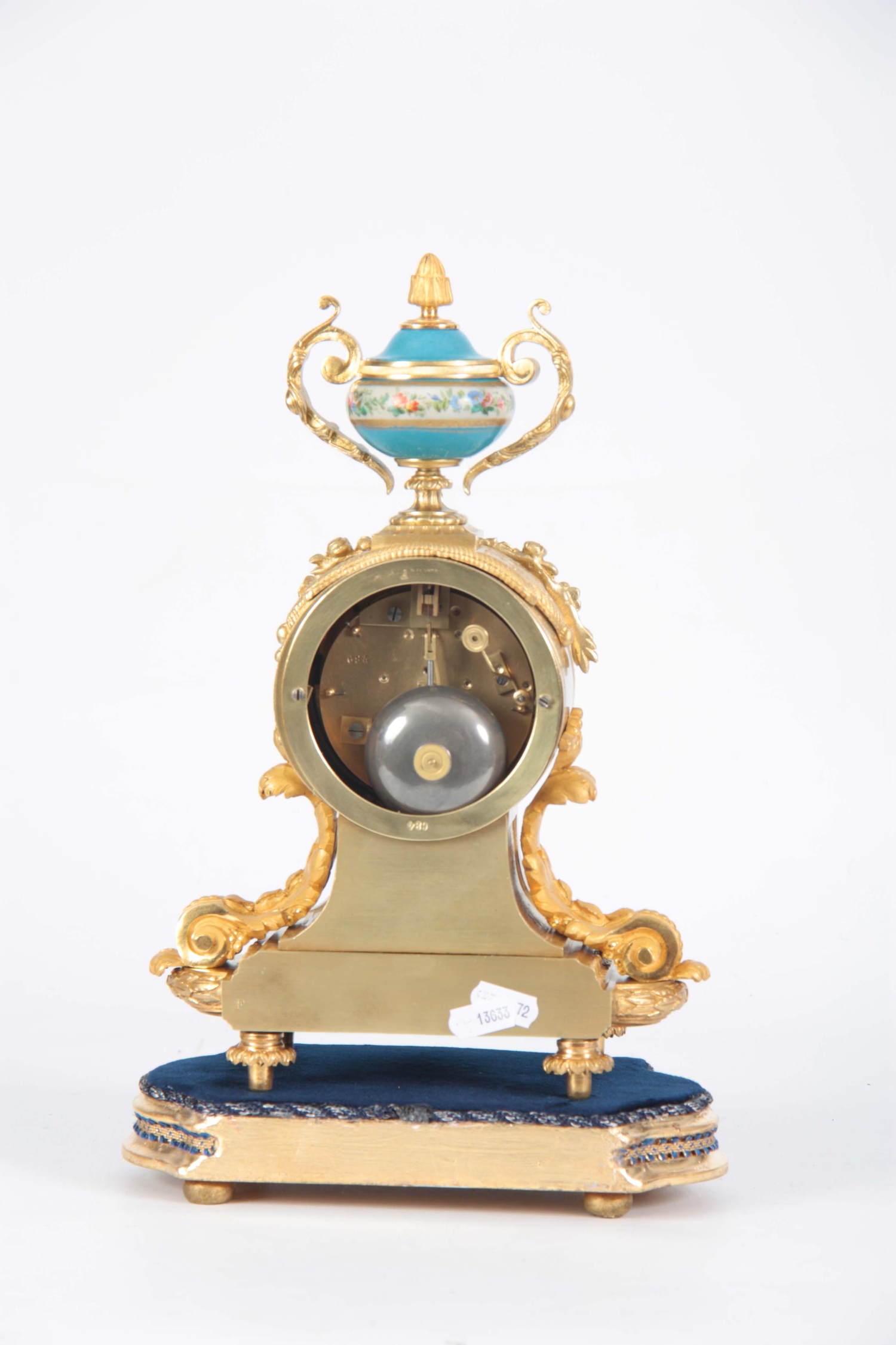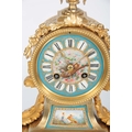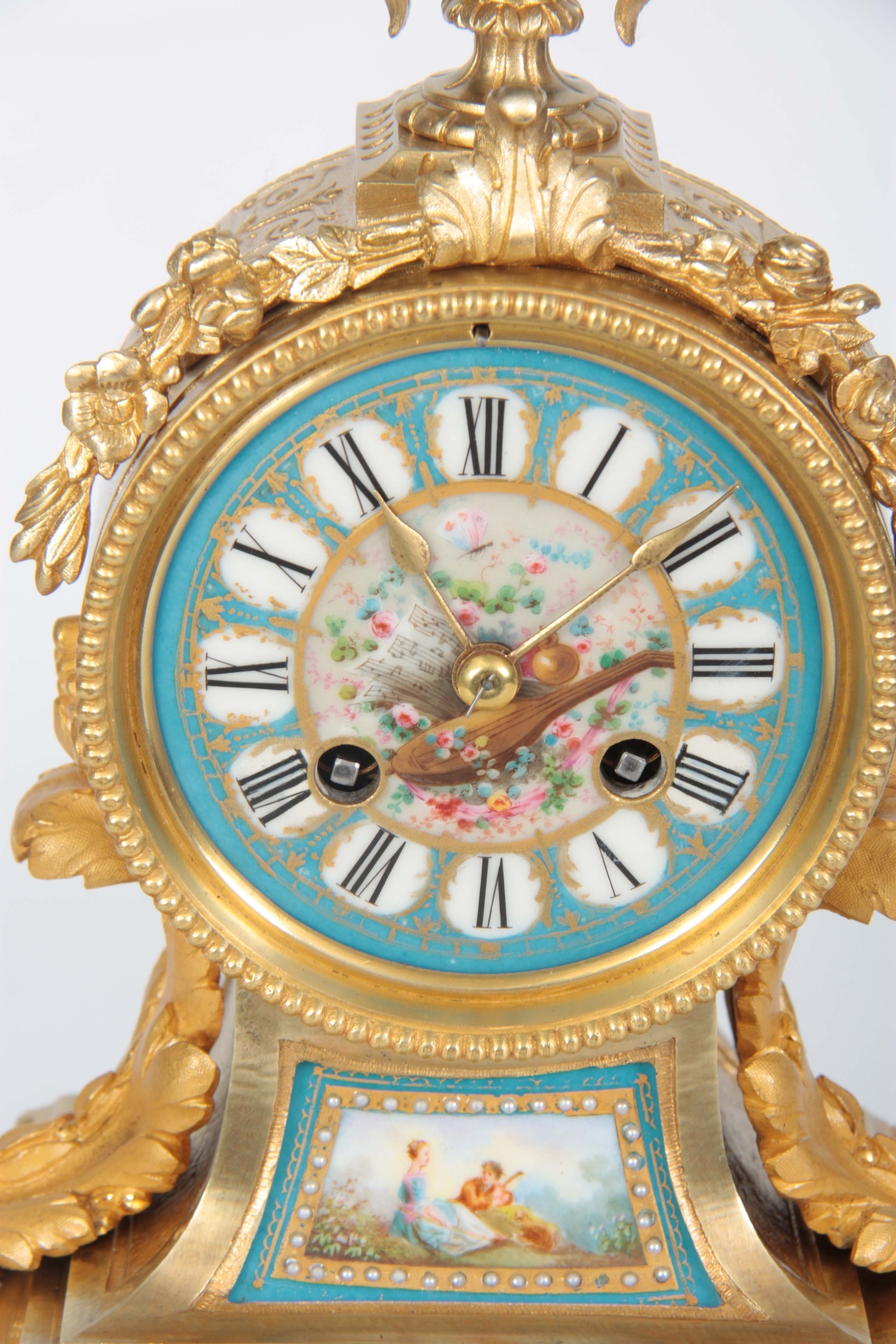 A LATE 19TH CENTURY FRENCH ORMOLU AND PORCELAIN PANELLED MANTEL CLOCK the case surmounted by a floral porcelain urn above an ormolu case with acanthus leaf mounts inset with porcelain painted panels decorated with romantic scenes, the matching 3.5" dial with Roman numerals fronting an eight-day spring driven movement with anchor escapement striking the hours/half hours on a bell, raised on a gilt and velvet lined plinth 35.5cm high